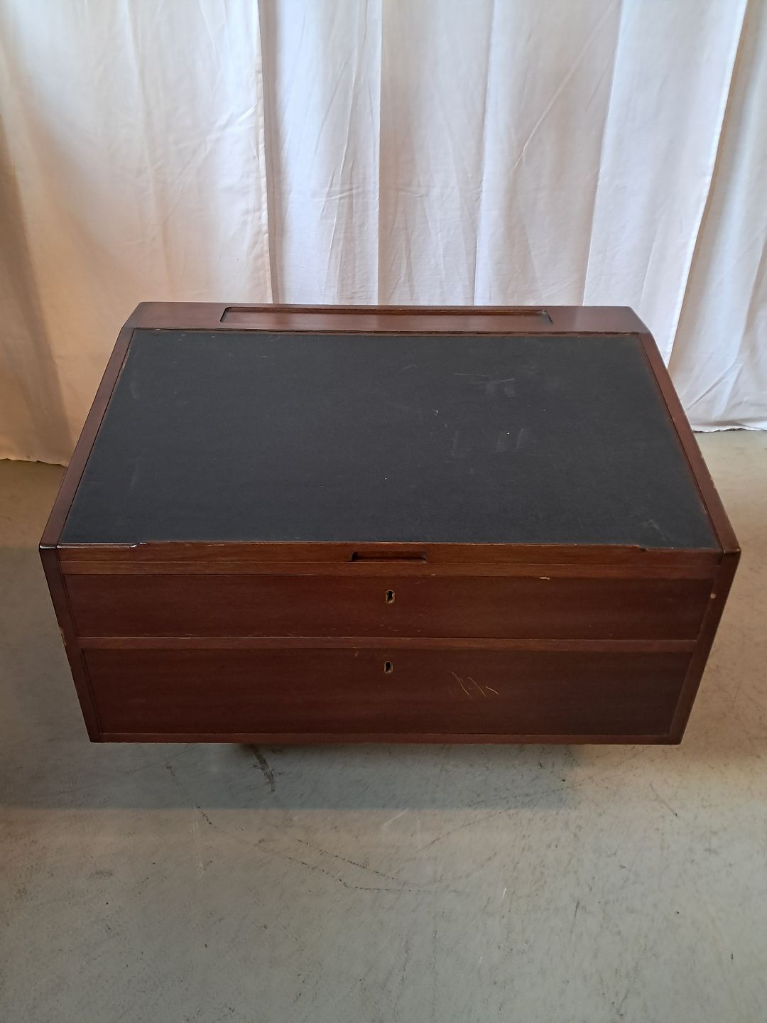 Skrivepult i fineret mahogni, fra 1950erne. Den har brugsspor. Højde 30cm Bredde 72cm Dybde 50cm Emne nummer: 76885