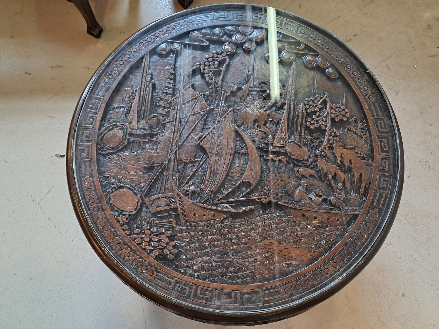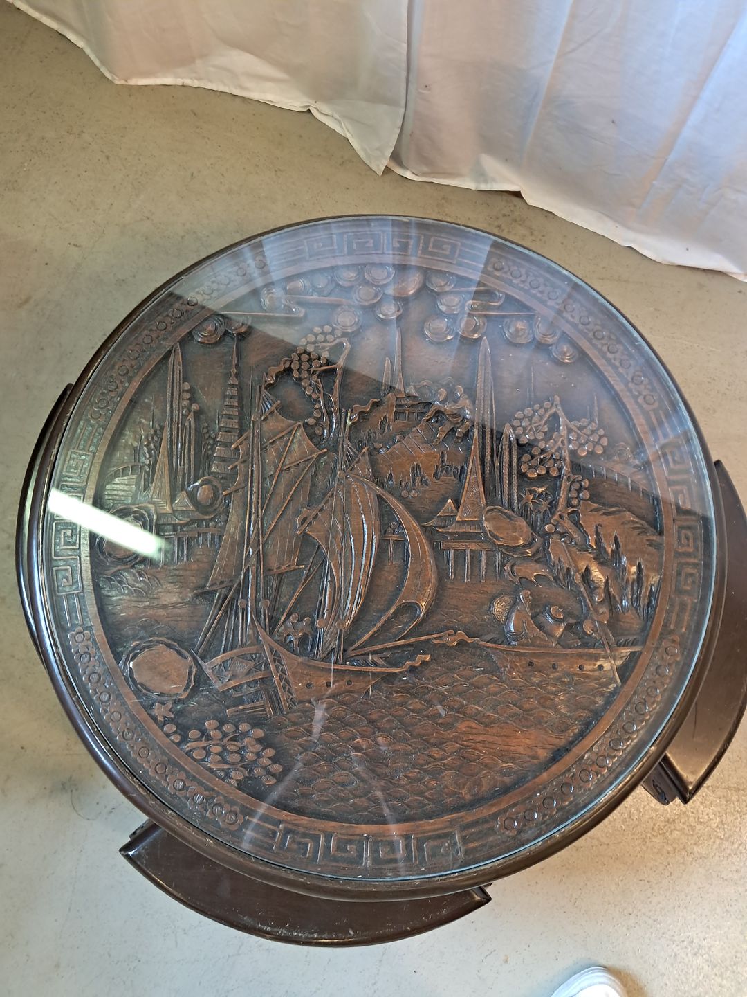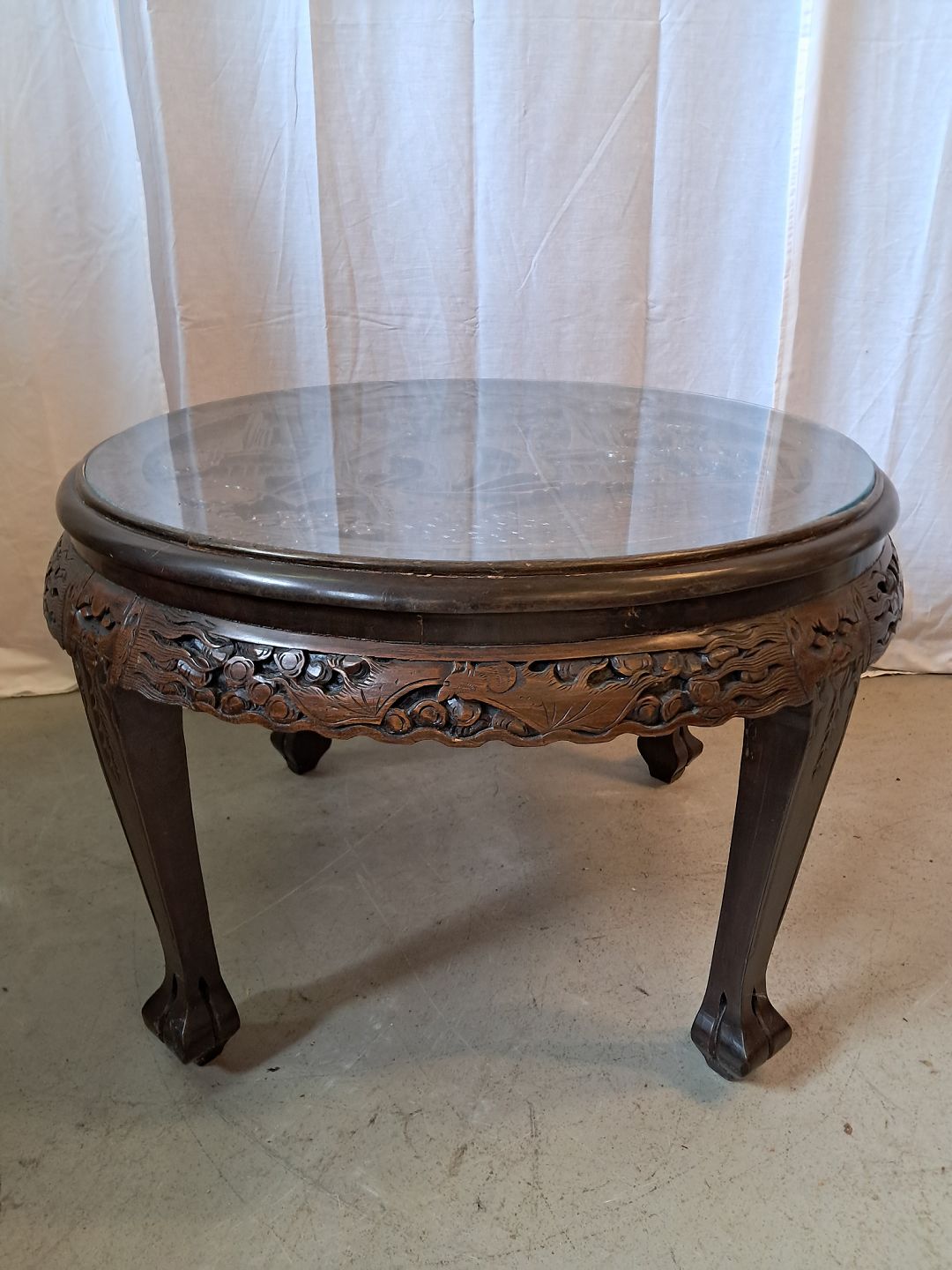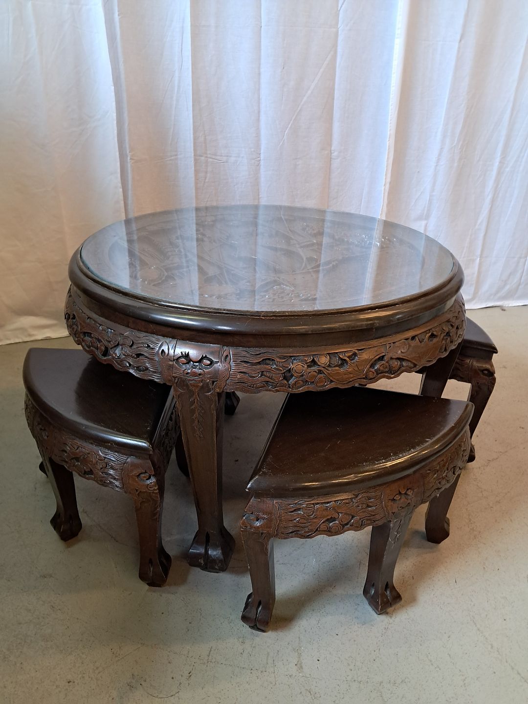 Kinesisk bord i massivt træ med glasplade og 4 taburetter, fra 1990erne. Det har brugsspor. Højde 52cm Diameter 78cm Sædehøjde på taburetterne 32cm Emne nummer: 76891