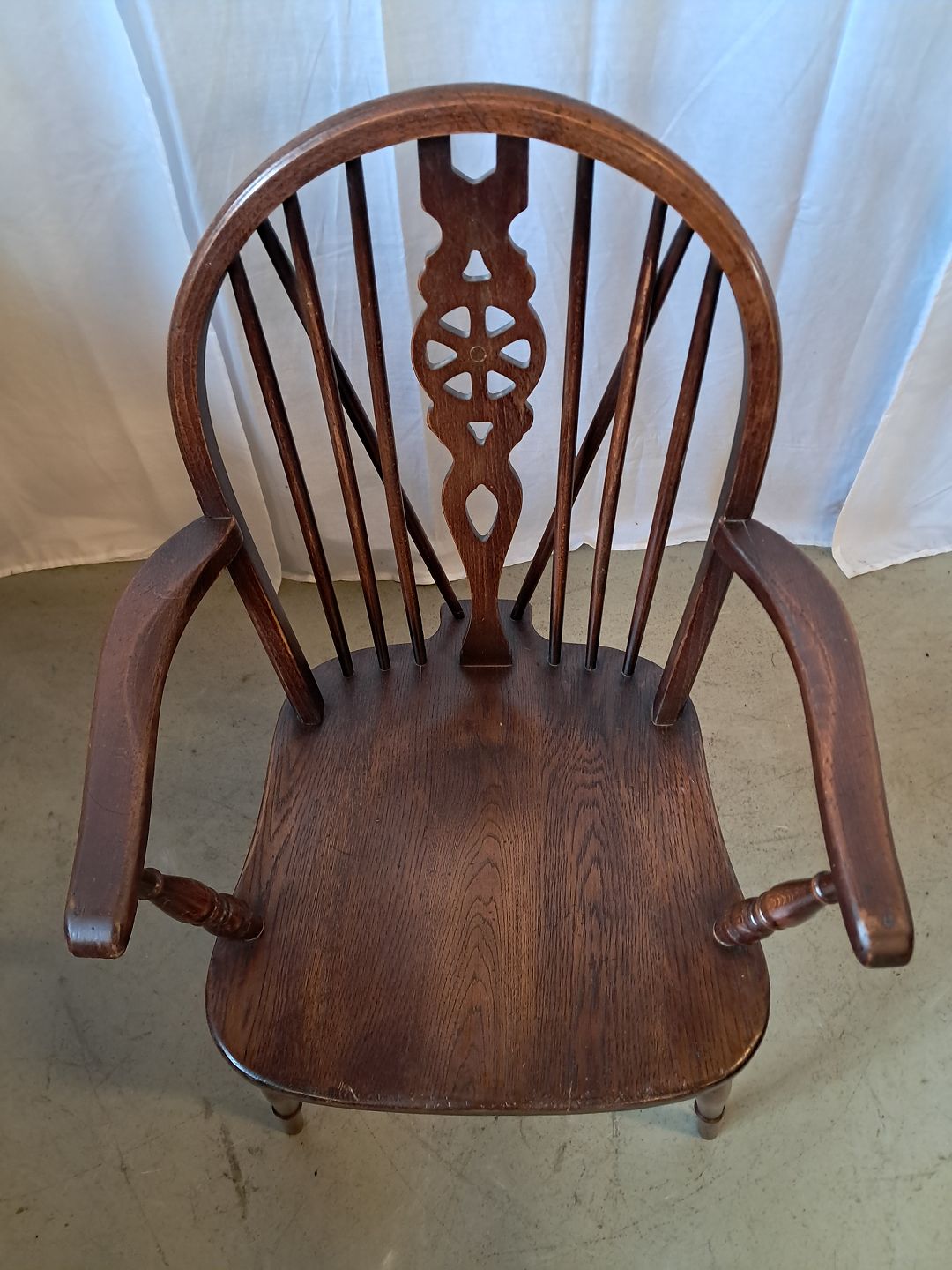 Armstol i massivt egetræ, fra 1950erne. Den har små brugsspor. Ryghøjde 95cm Sædehøjde 46cm Emne nummer: 76896