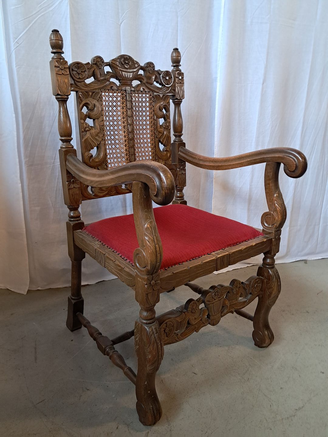 Armstol i massivt egetræ med rørflet, fra 1930erne. Den har brugsspor. Ryghøjde 104cm Sædehøjde 42cm Emne nummer: 76897