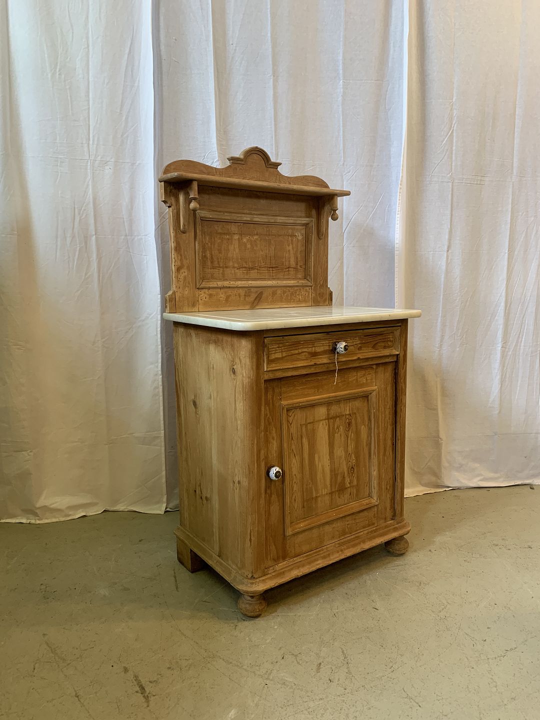 Servante i massivt fyrretræ med marmorplade, fra 1910erne. Den har brugsspor. Højde 123cm Bredde 63cm Dybde 43cm Emne nummer: 76903