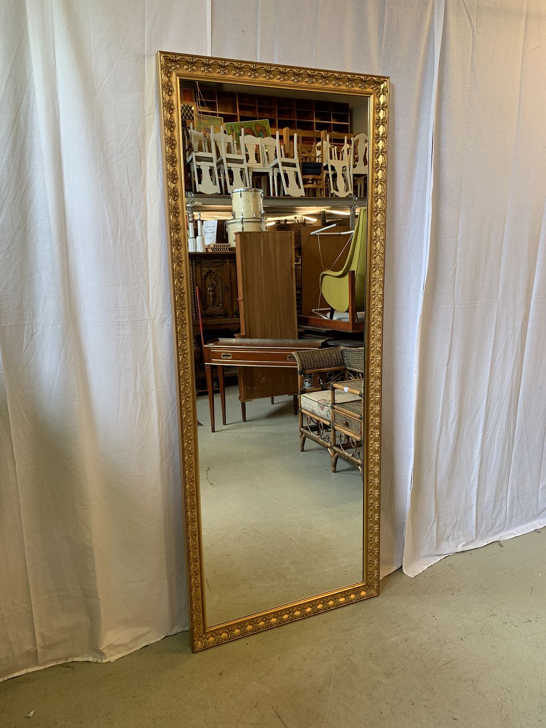 Stort spejl med guldmalet ramme, fra 2000erne. Det har små brugsspor. Højde 204cm Bredde 80cm Dybde 4cm Emne nummer: 76907