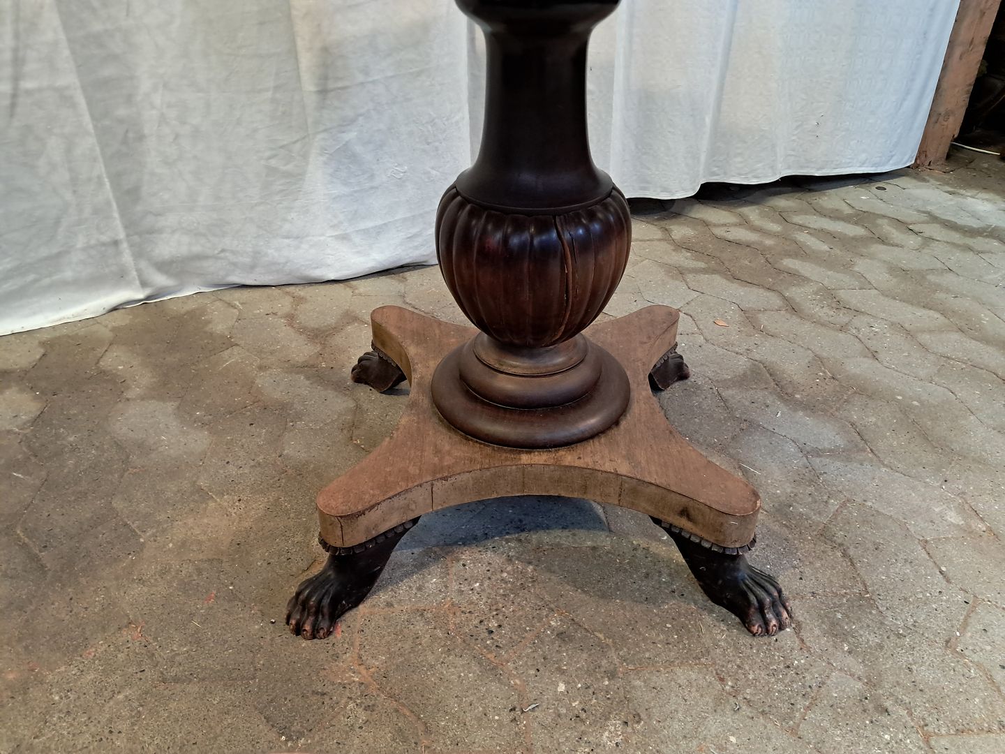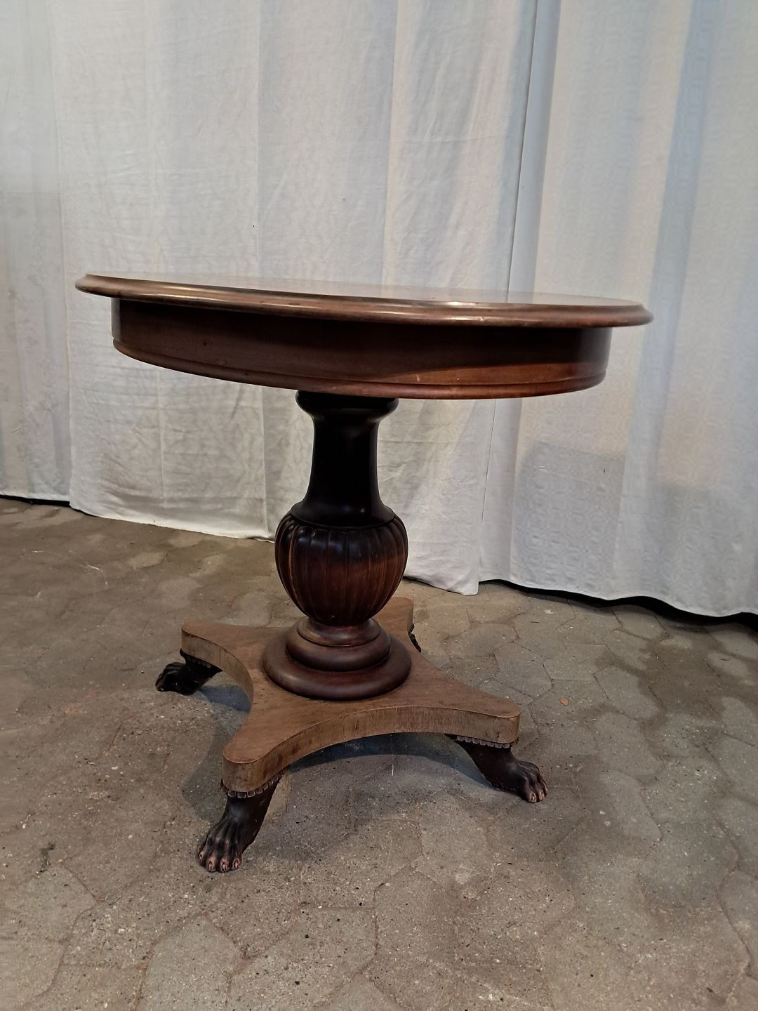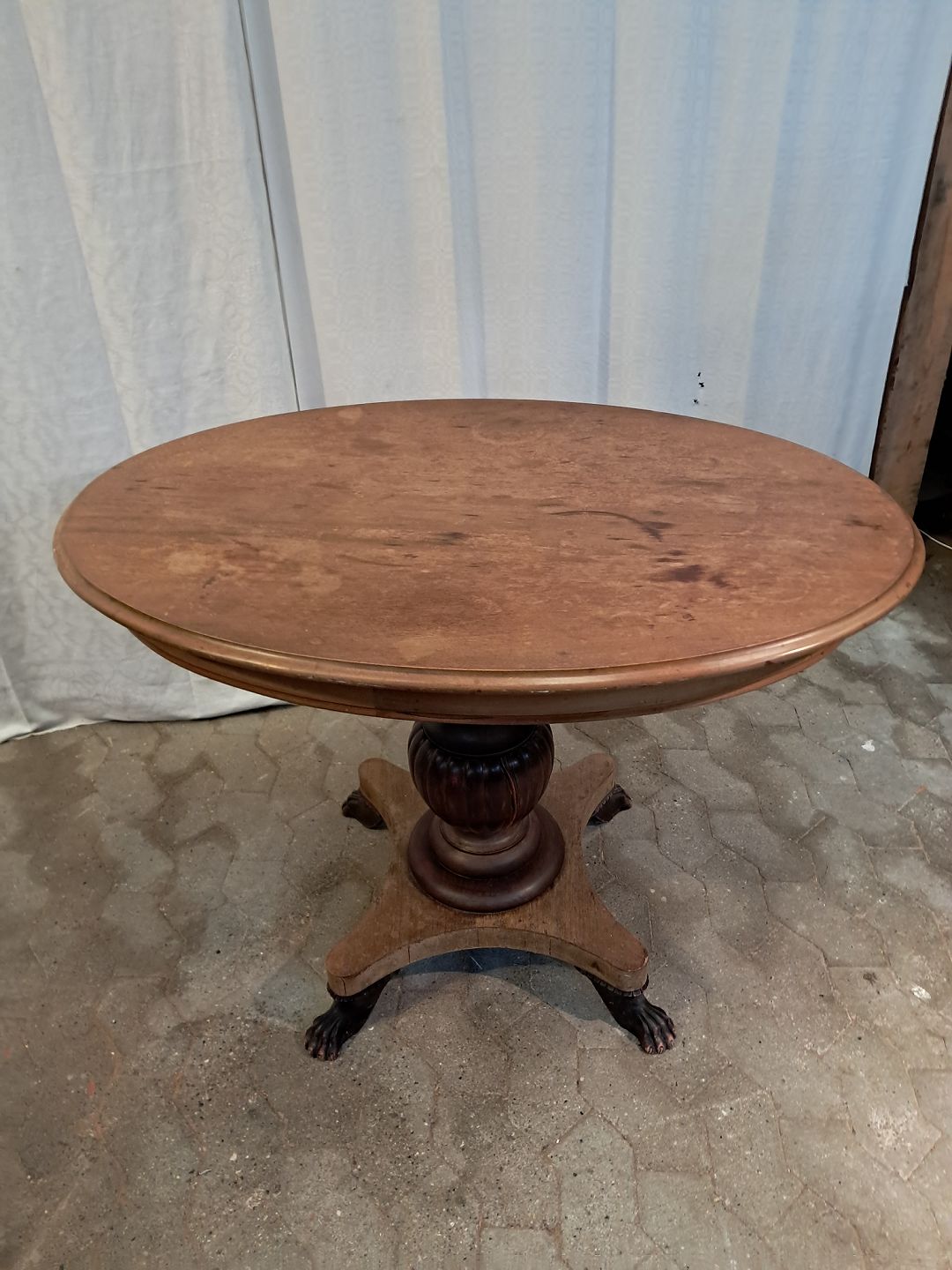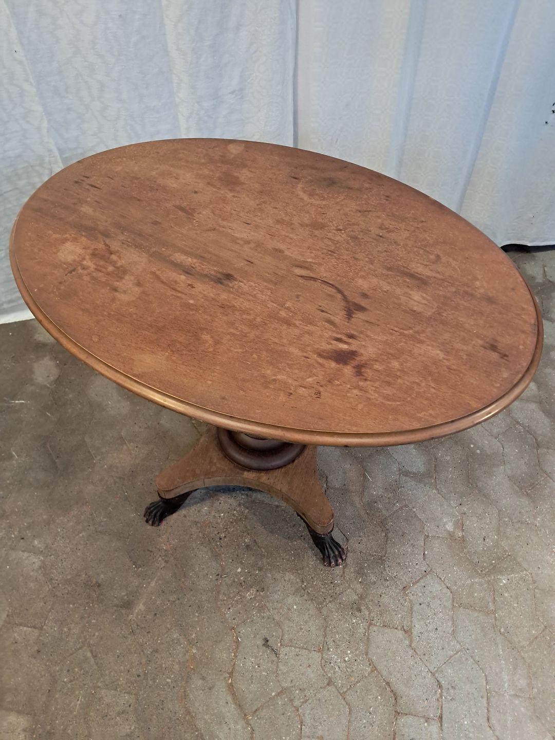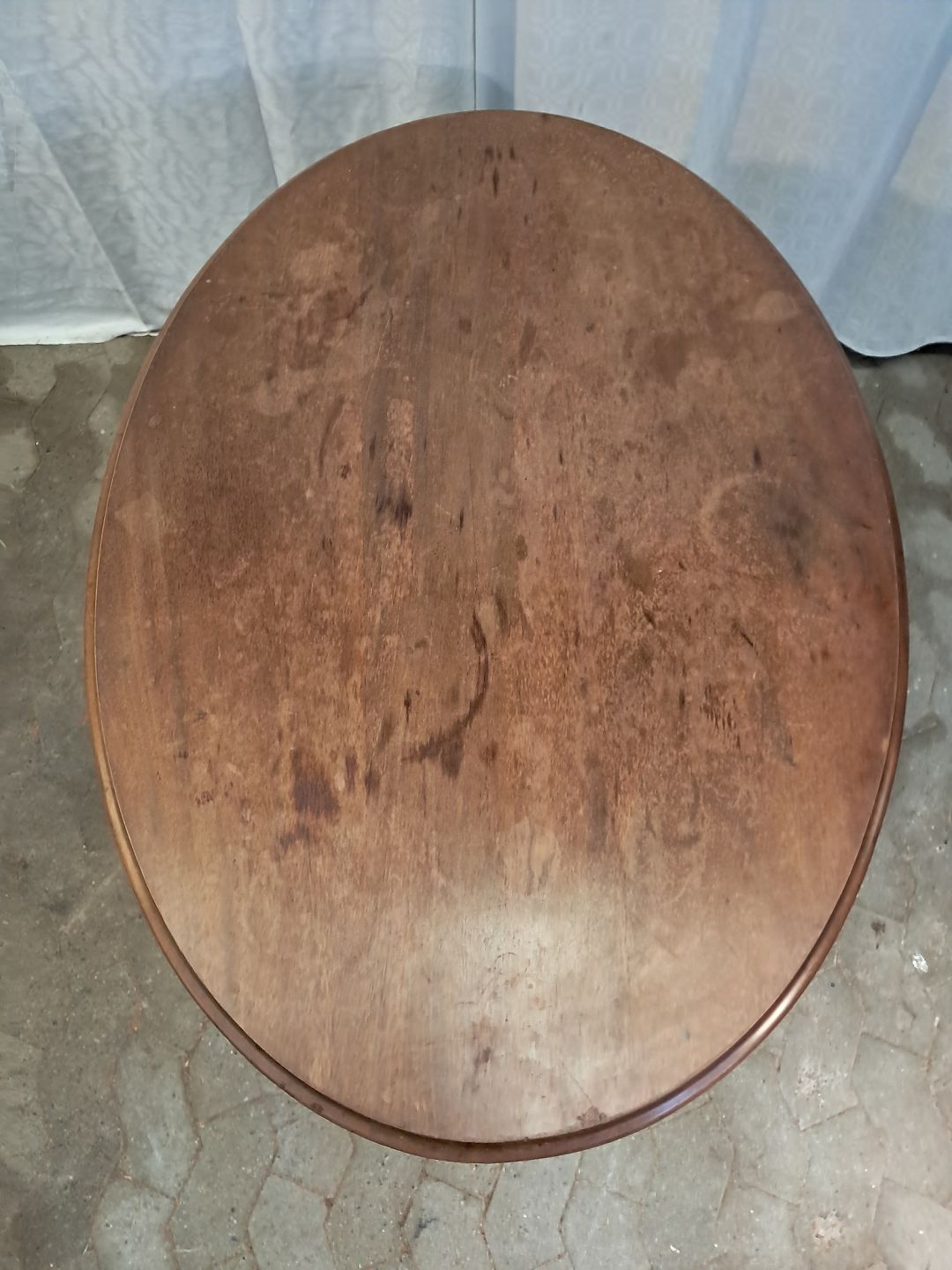 Ovalt salonbord i massivt mahogni, fra 1910erne. Det har brugsspor og en reven i træet. (se foto) Højde 77cm Bredde 78cm Længde 110cm Emne nummer: 91835