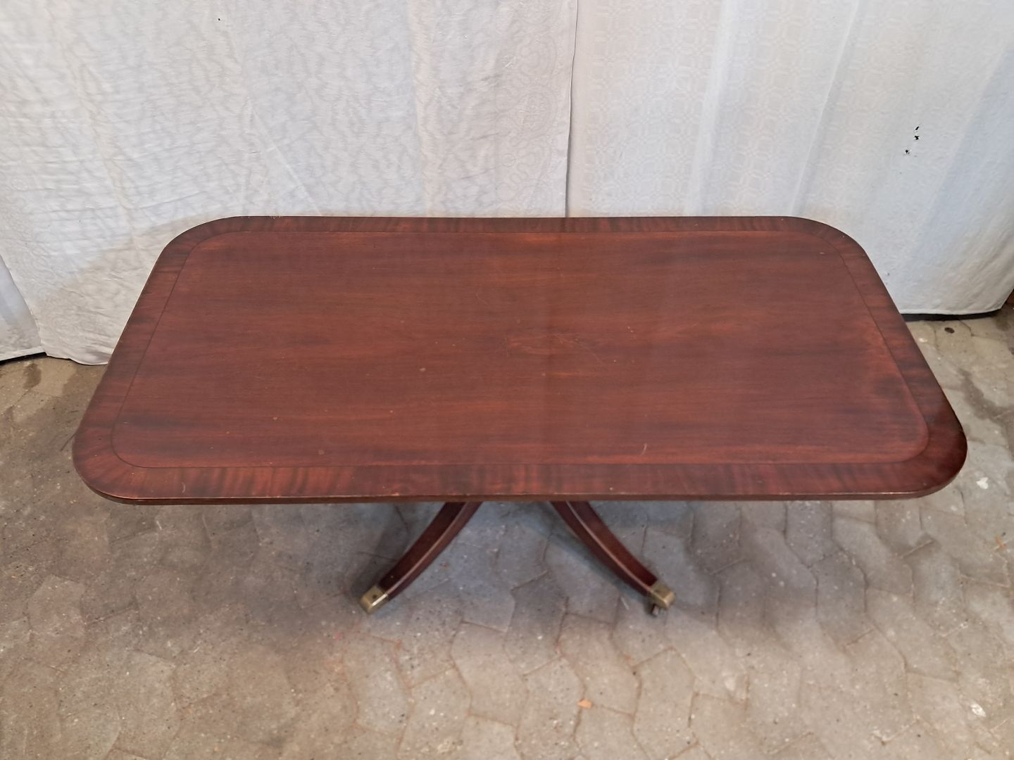 Sofabord i fineret mahogni, fra 1980erne. Det har brugsspor. Højde 54cm Bredde 75cm Længde 146cm Emne nummer: 91857