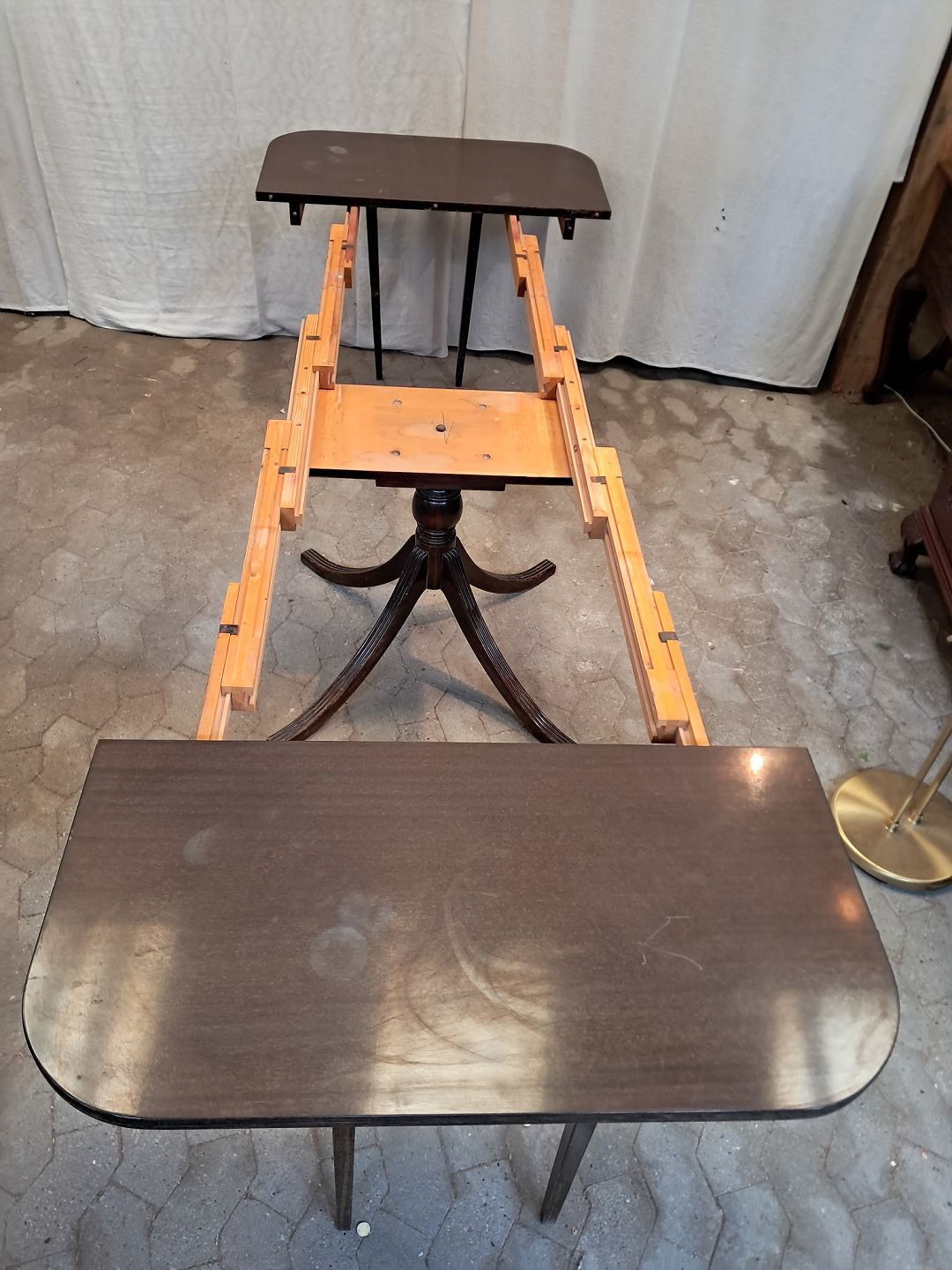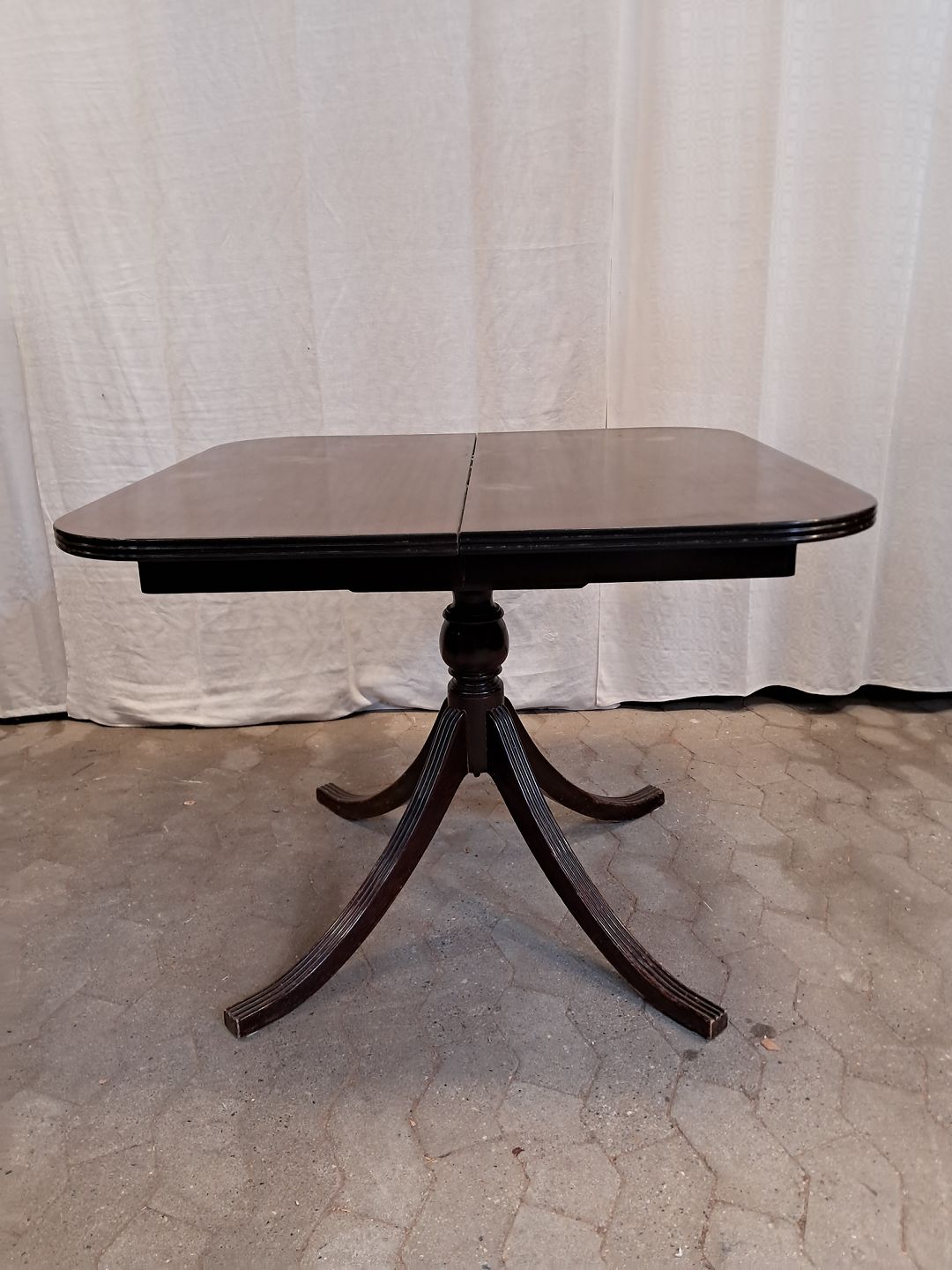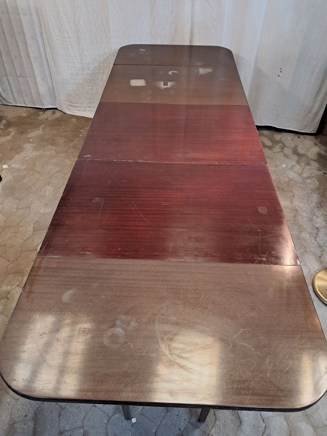Spisebord i fineret mahogni med 3 tillægsplader. Det har brugsspor og er falmet i farven. Højde 74cm Bredde 95cm Længde 97cm Længde med tillægsplader 292cm Emne nummer: 91858