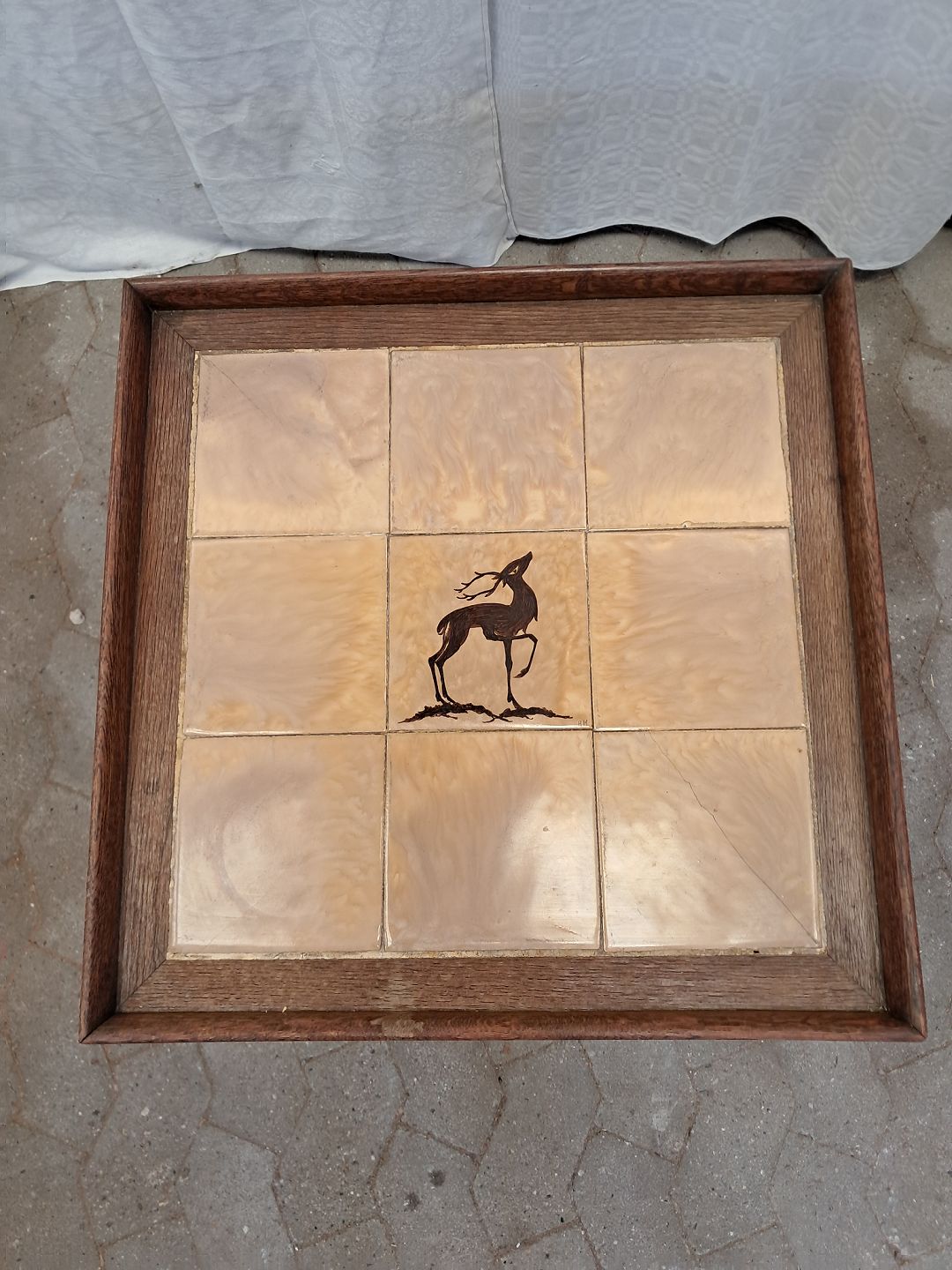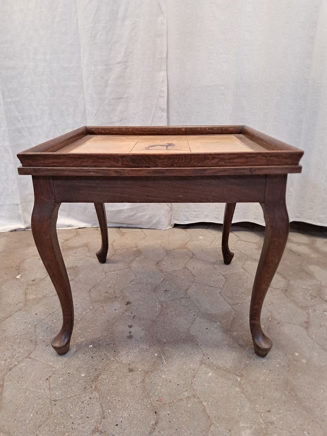 Lampebord i massivt egetræ med kakler, fra 1920erne. Det har brugsspor og defekte kakler. Højde 52cm Bredde 57cm Længde 57cm Emne nummer: 91862