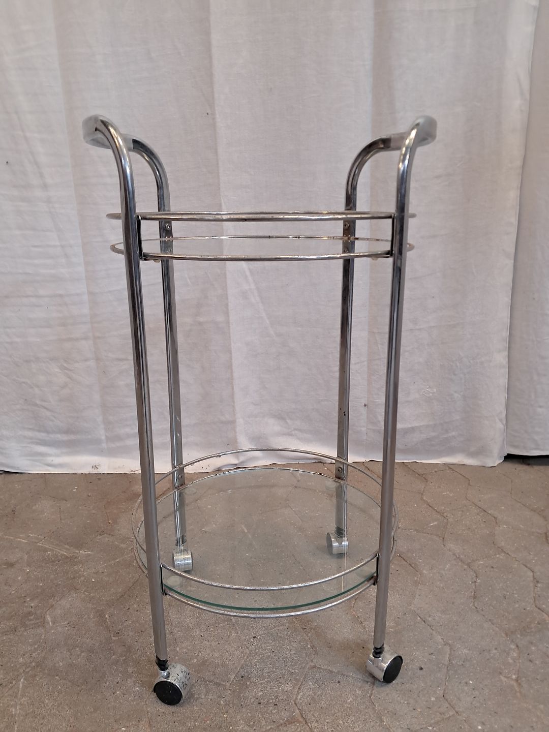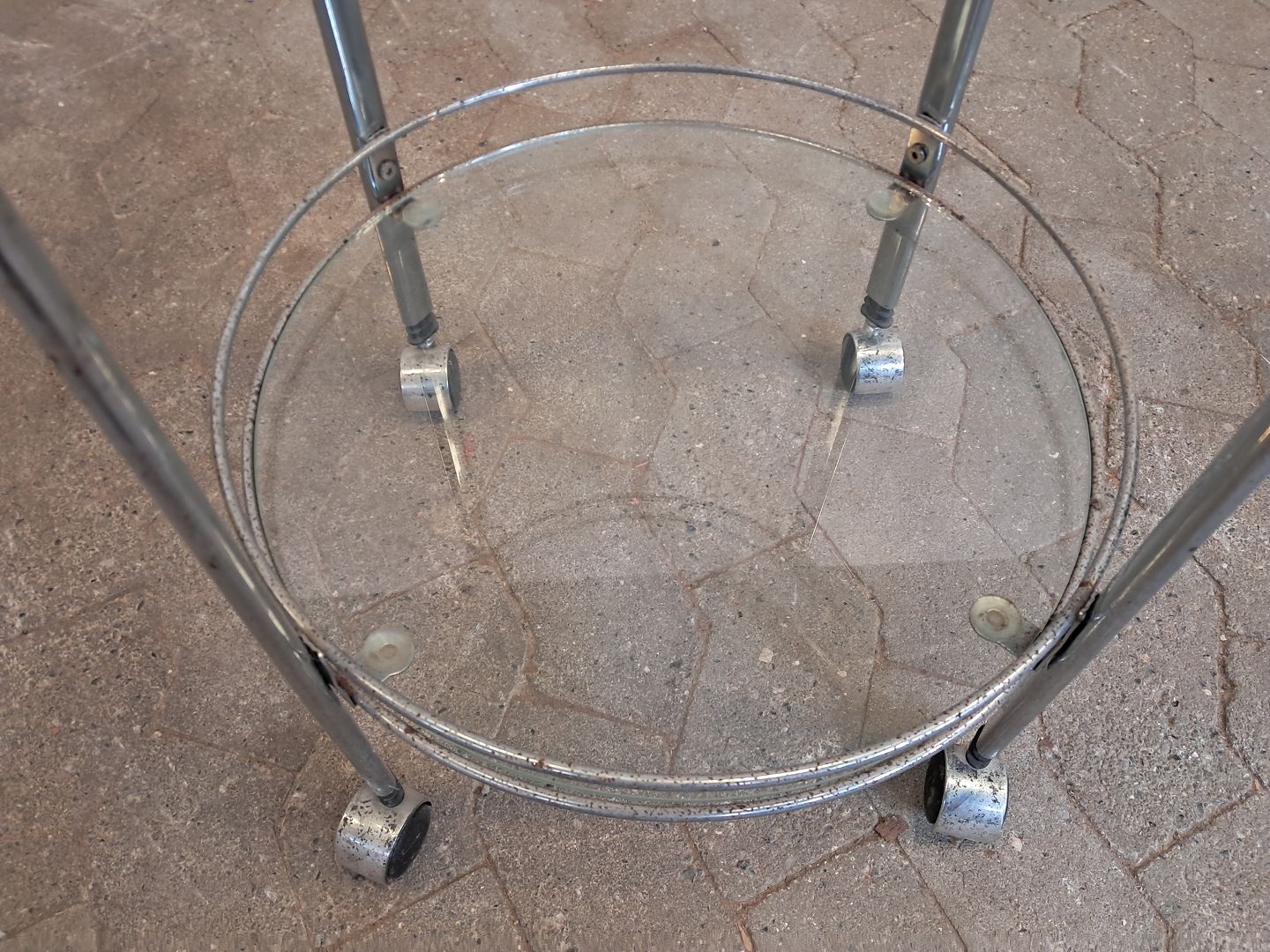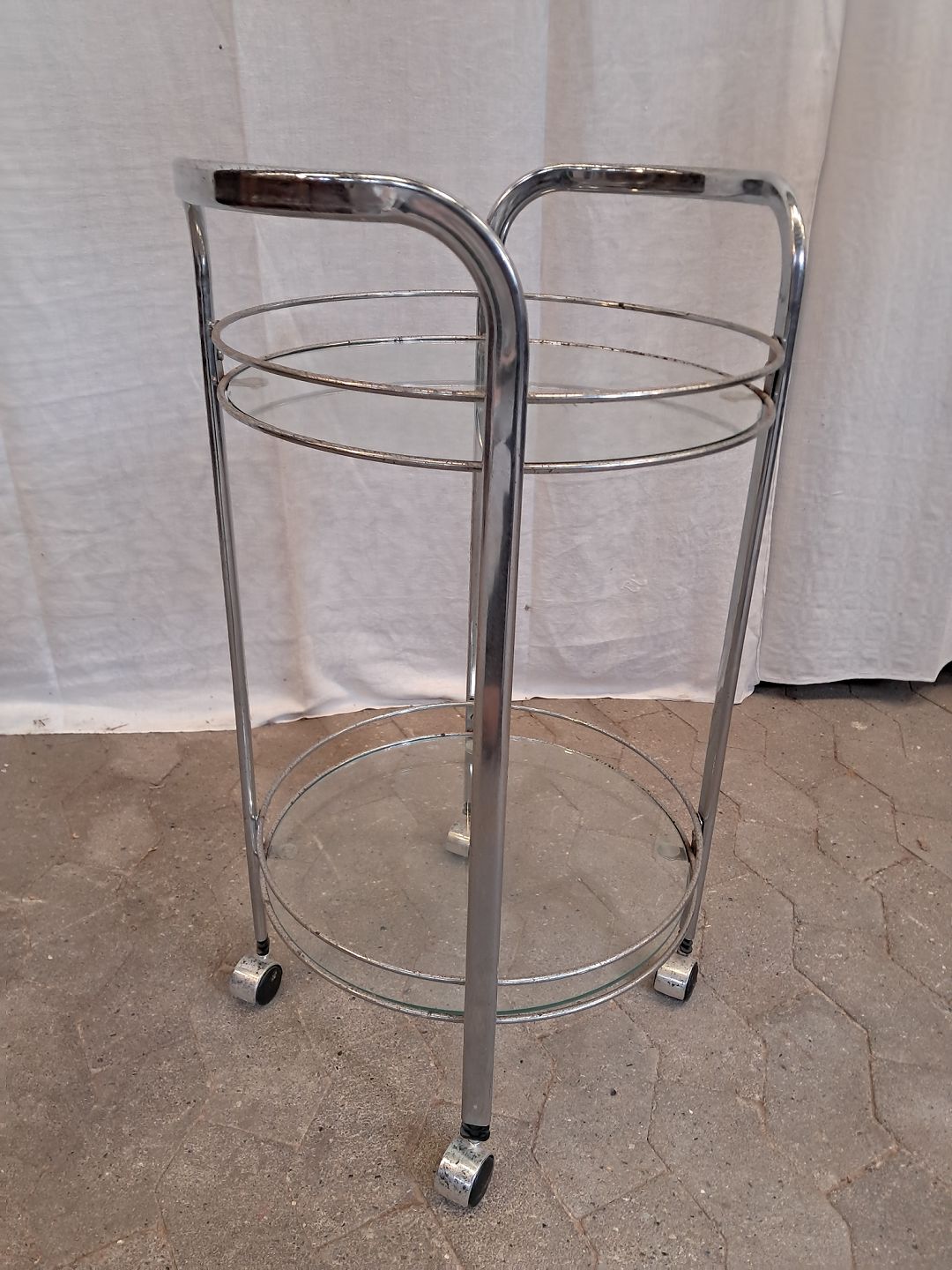 Rullebord i metal med glasplader, fra 1980erne. Det har brugsspor/rust. (se foto) Højde 79cm Diameter 47cm Emne nummer: 91878