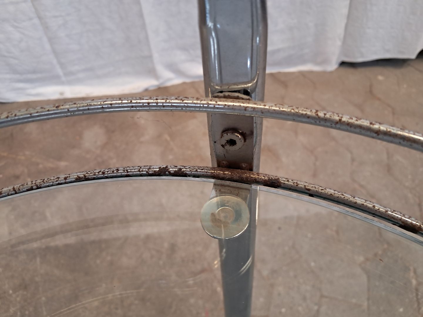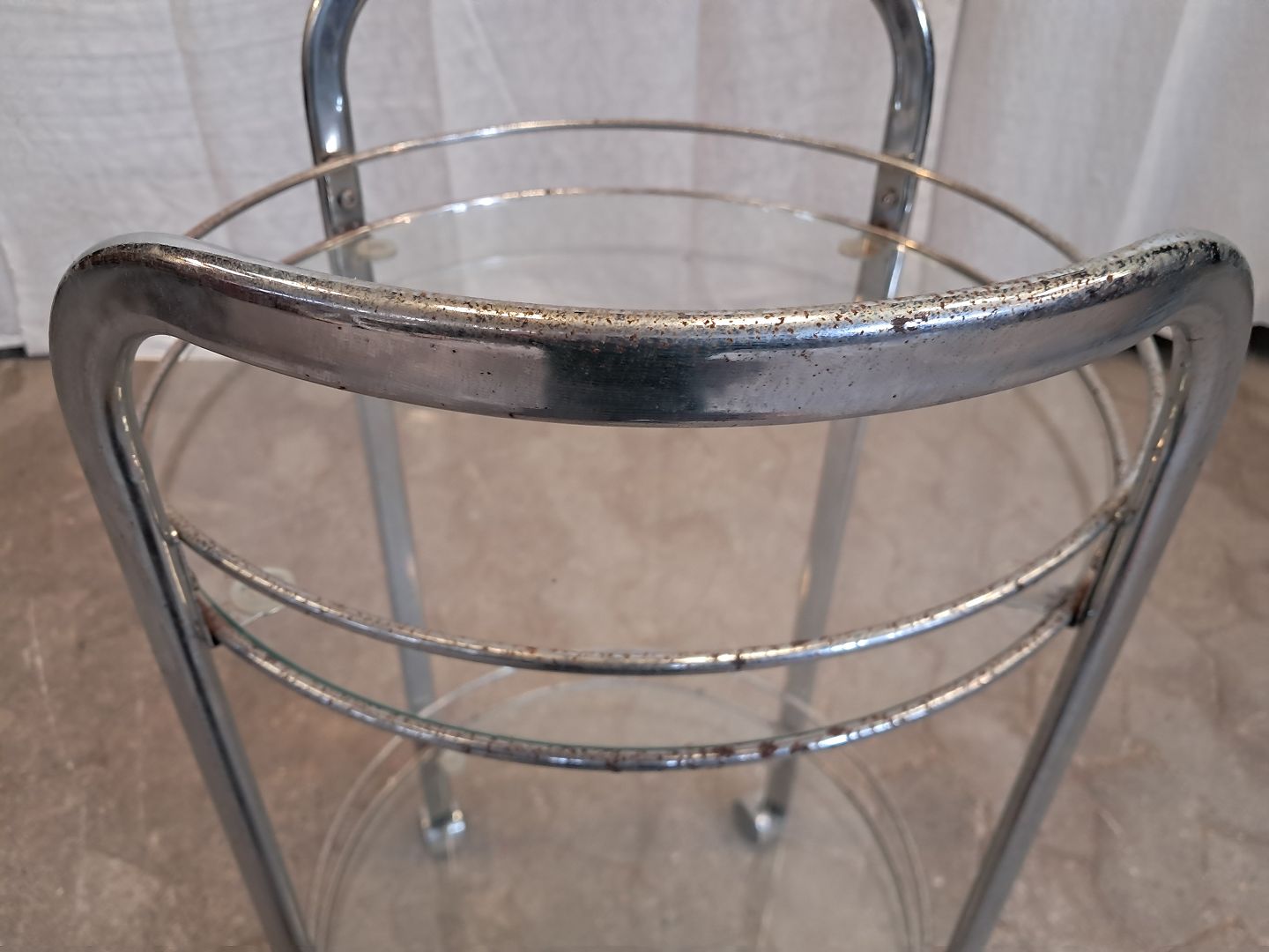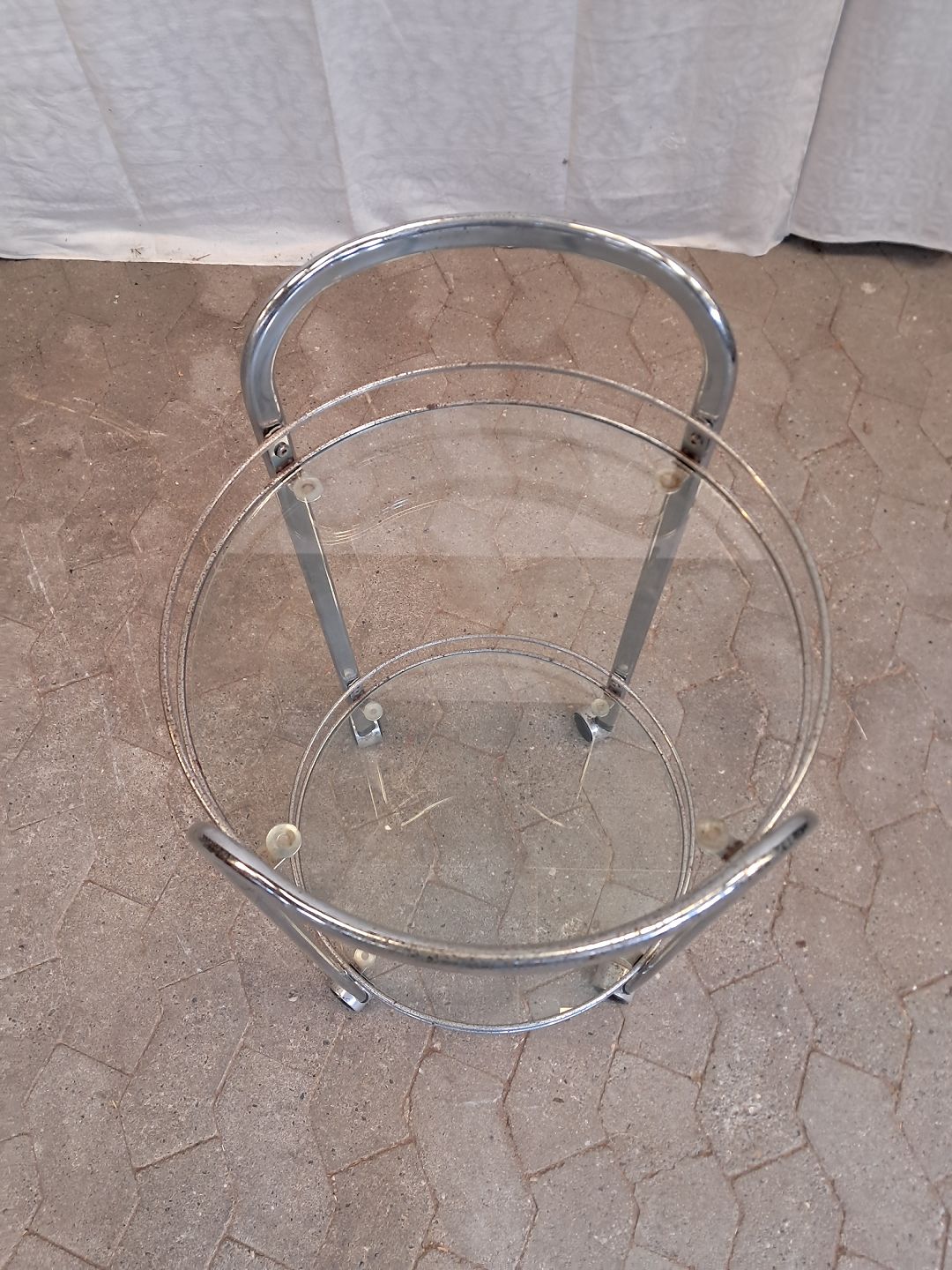 Rullebord i metal med glasplader, fra 1980erne. Det har brugsspor/rust. (se foto) Højde 79cm Diameter 47cm Emne nummer: 91878