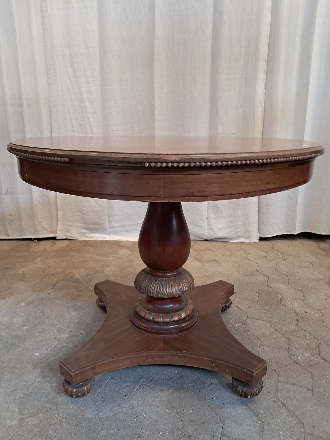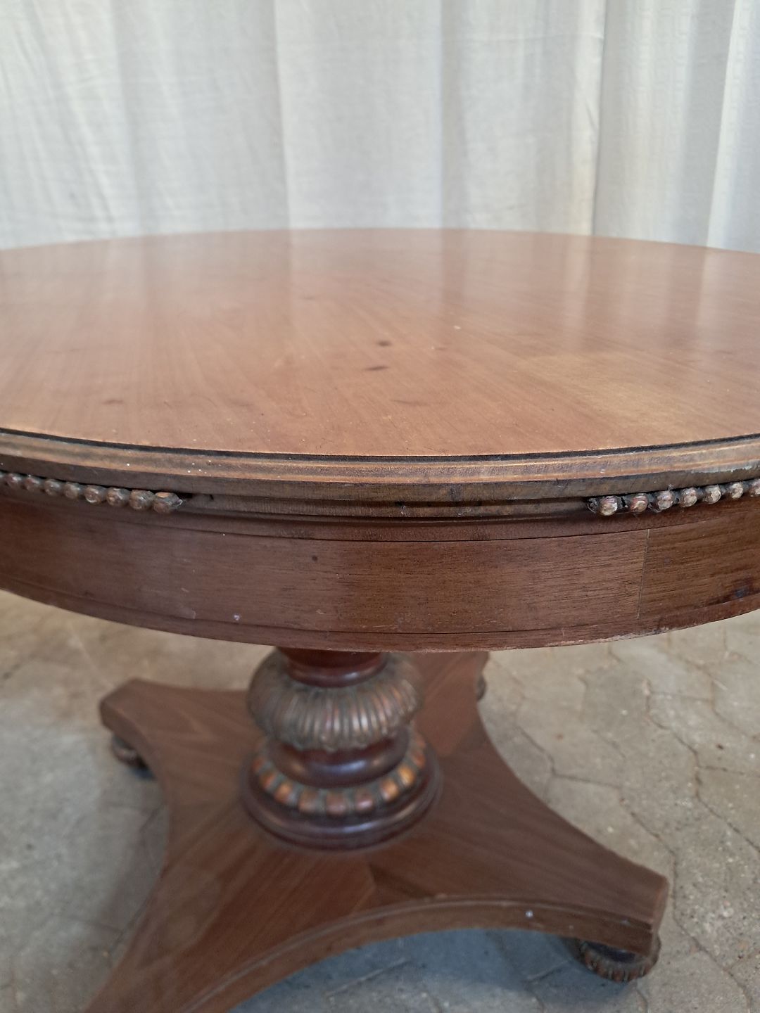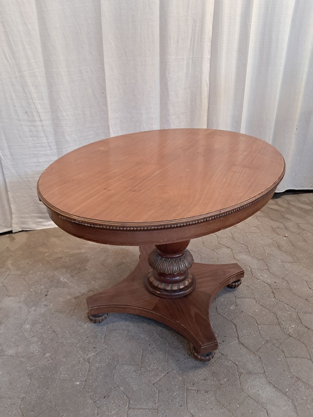 Salonbord i fineret mahogni, fra 1900erne. Det har brugsspor og mangler pynte lister på bordkanten. (se foto) Højde 73cm Bredde 85cm Længde 121cm Emne nummer: 91879