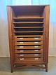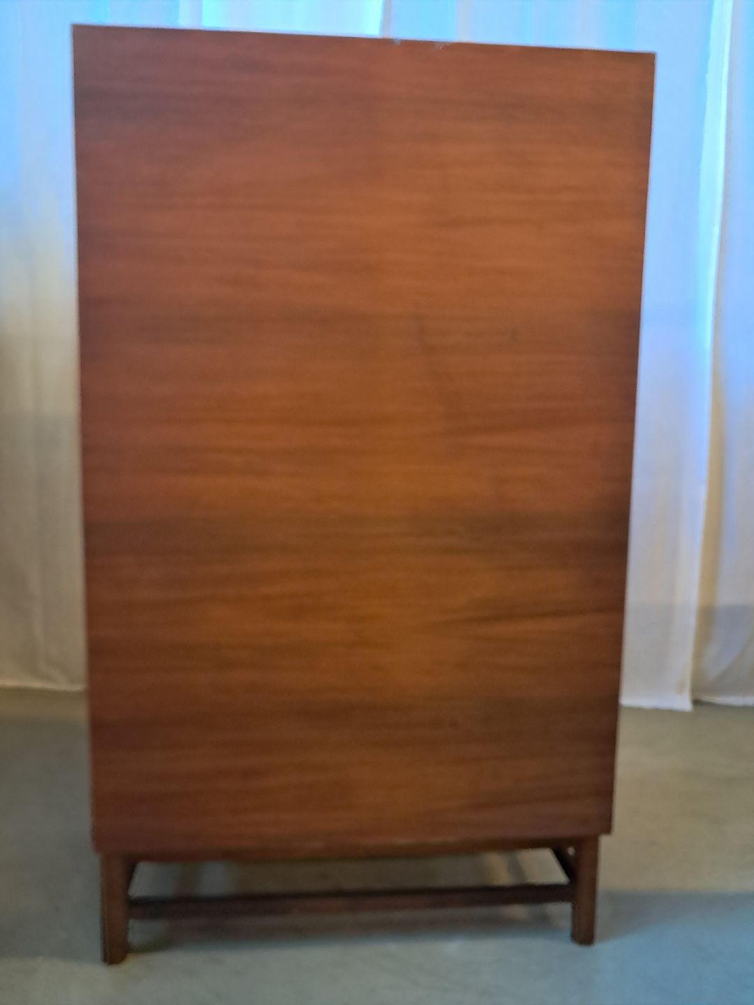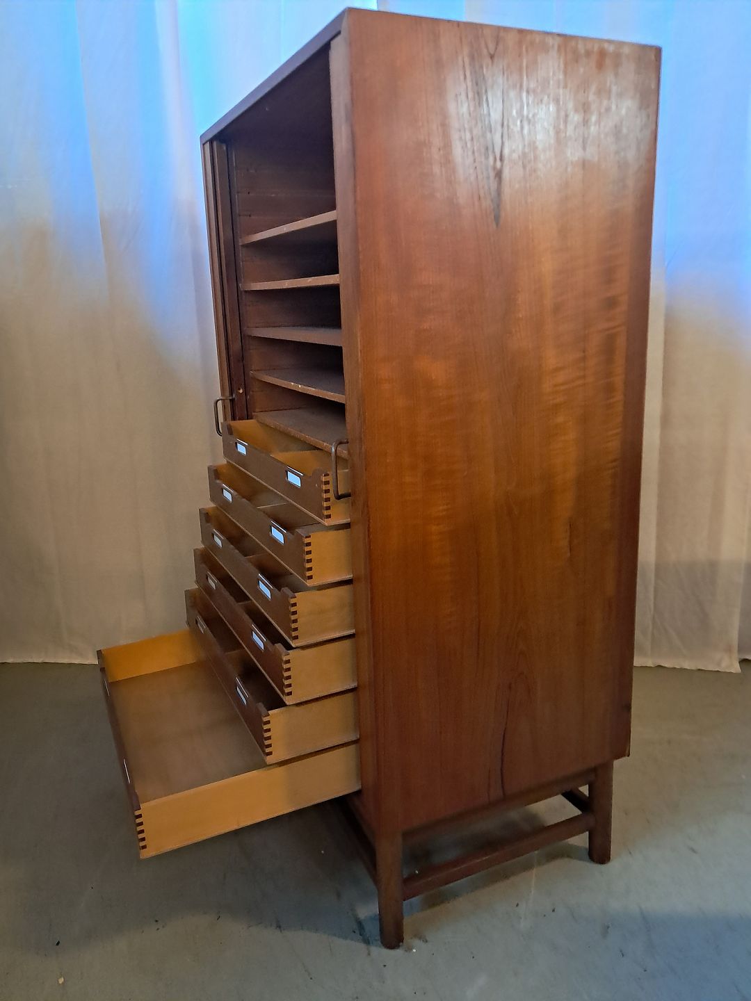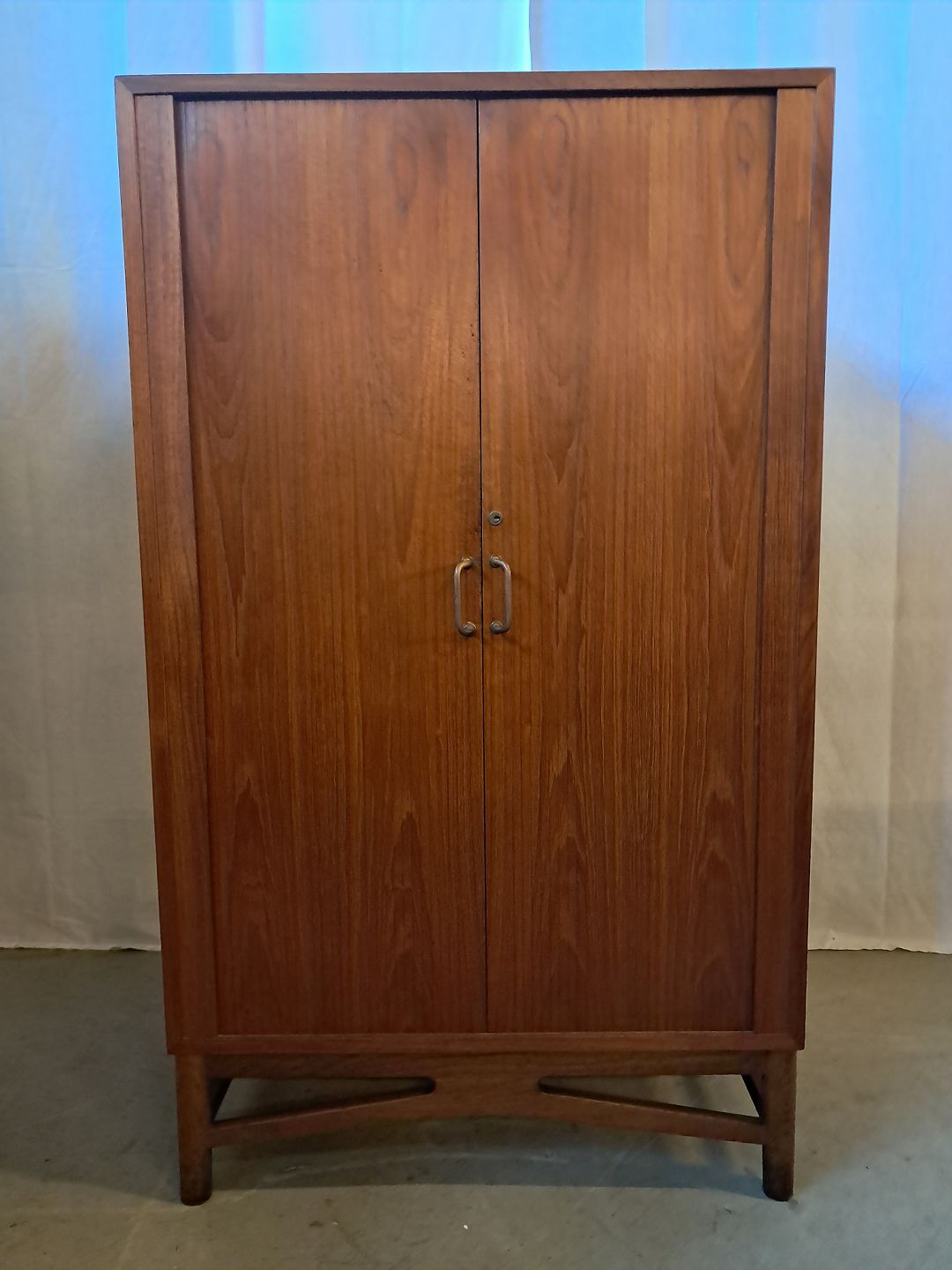 Skab i fineret teaktræ, fra 1960erne. Det har patina og der medfølger ikke nøgle. Højde 127cm Bredde 74cm Dybde 46cm Emne nummer: 76963