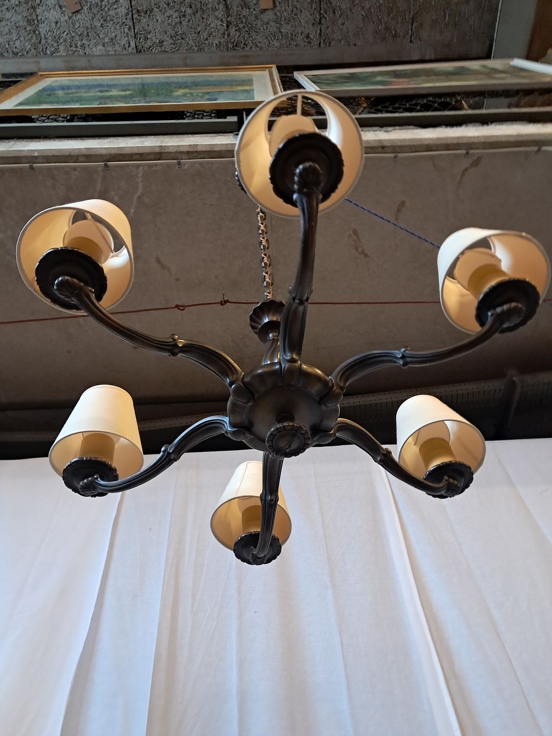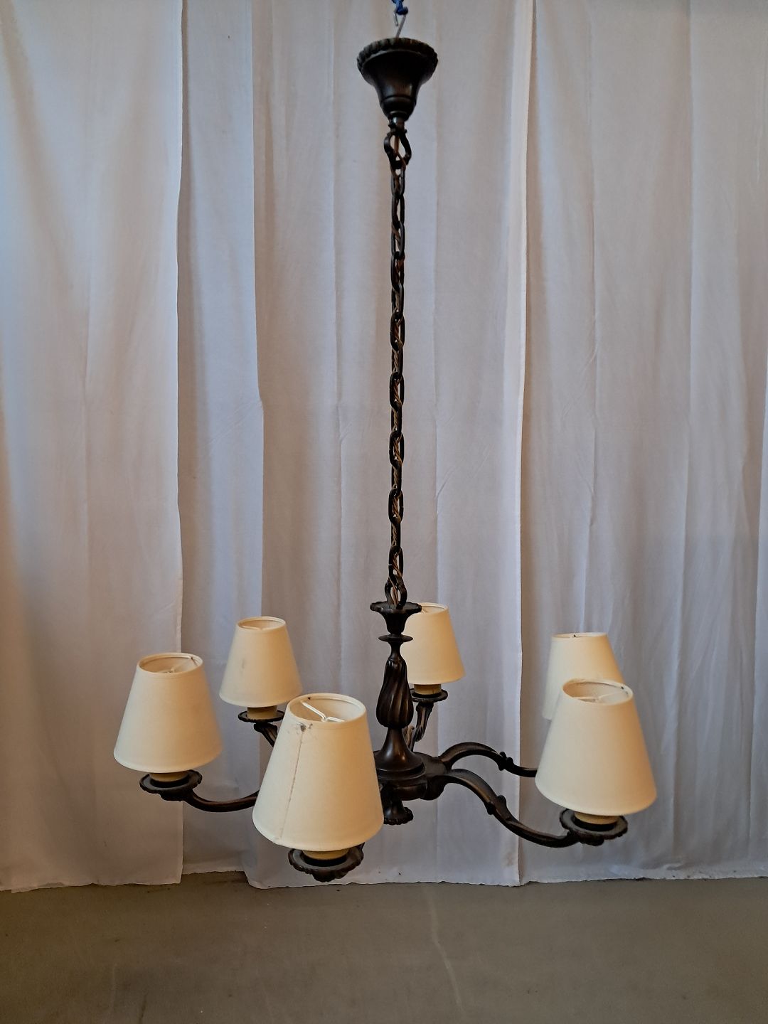 Lysekrone i metal, fra 1930erne. Den har brugsspor. Højde med kæde 106cm Diameter 66cm Emne nummer: 76998