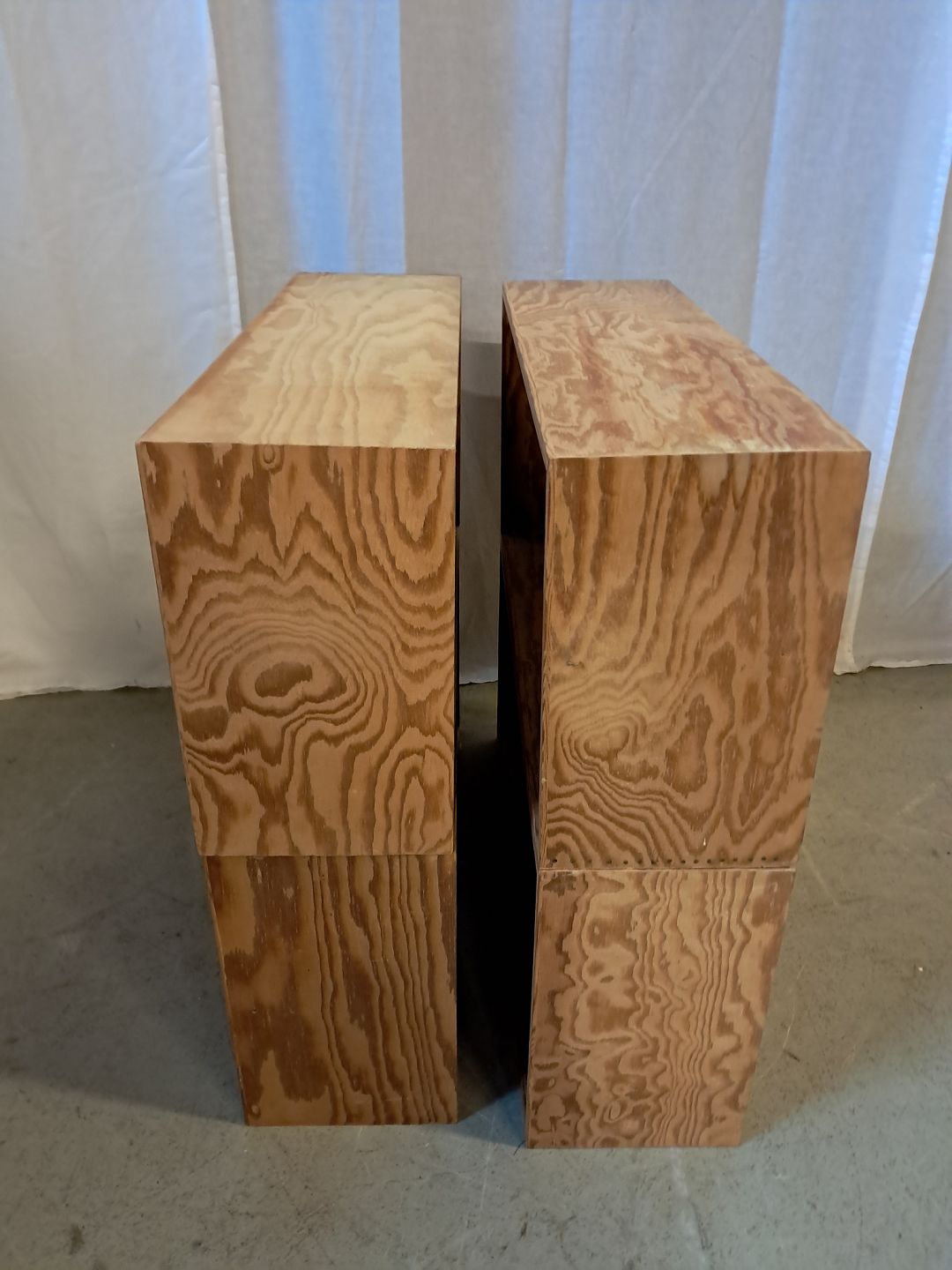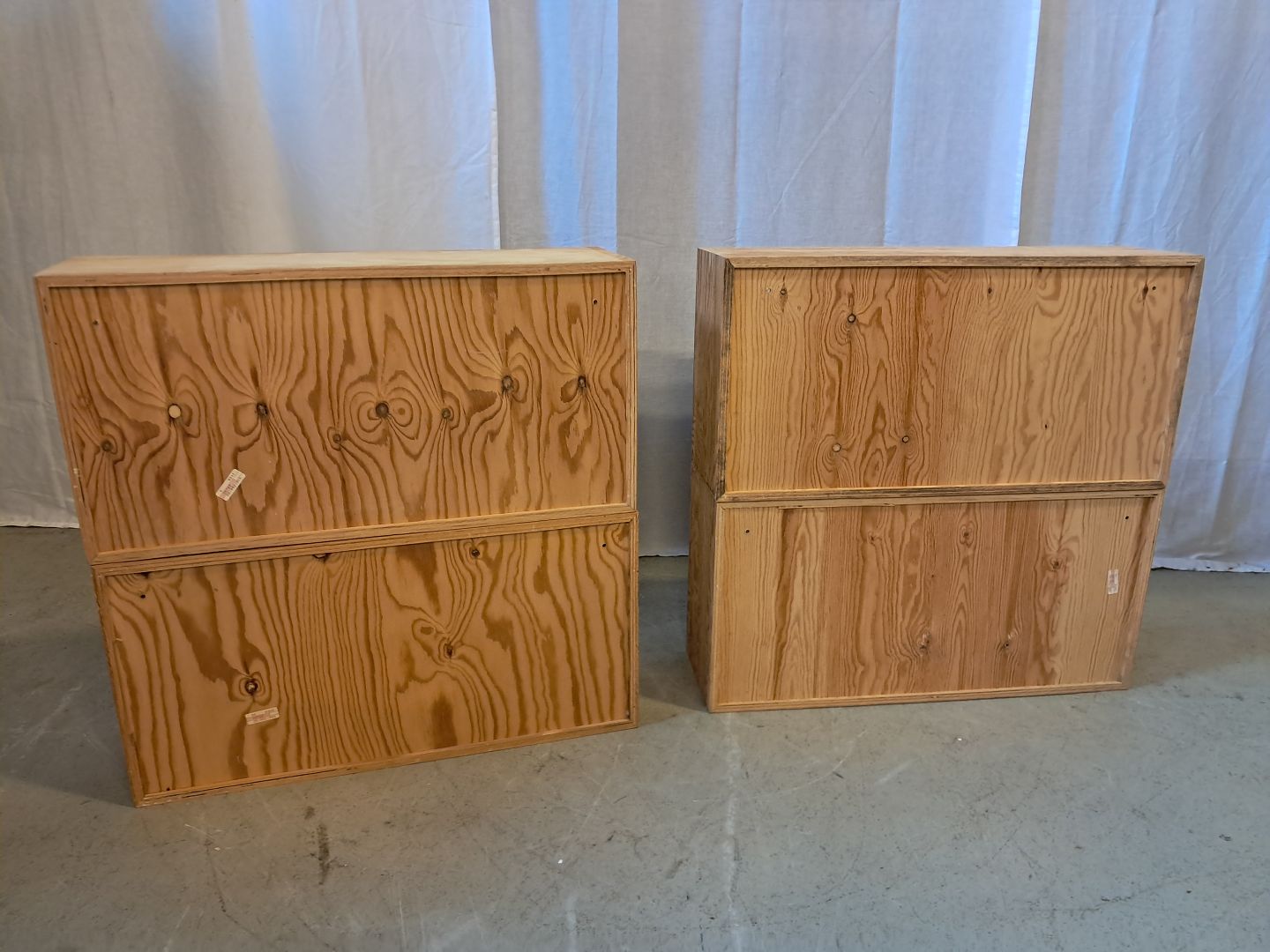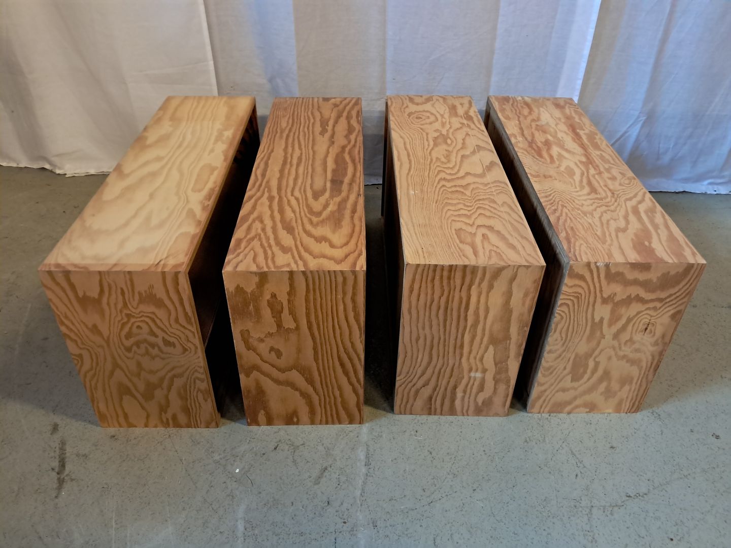 4 Bogkasser i krydsfiner, fra 1990erne. De har brugsspor. Højde 30cm Bredde 60cm Dybde 18cm Emne nummer: 77002