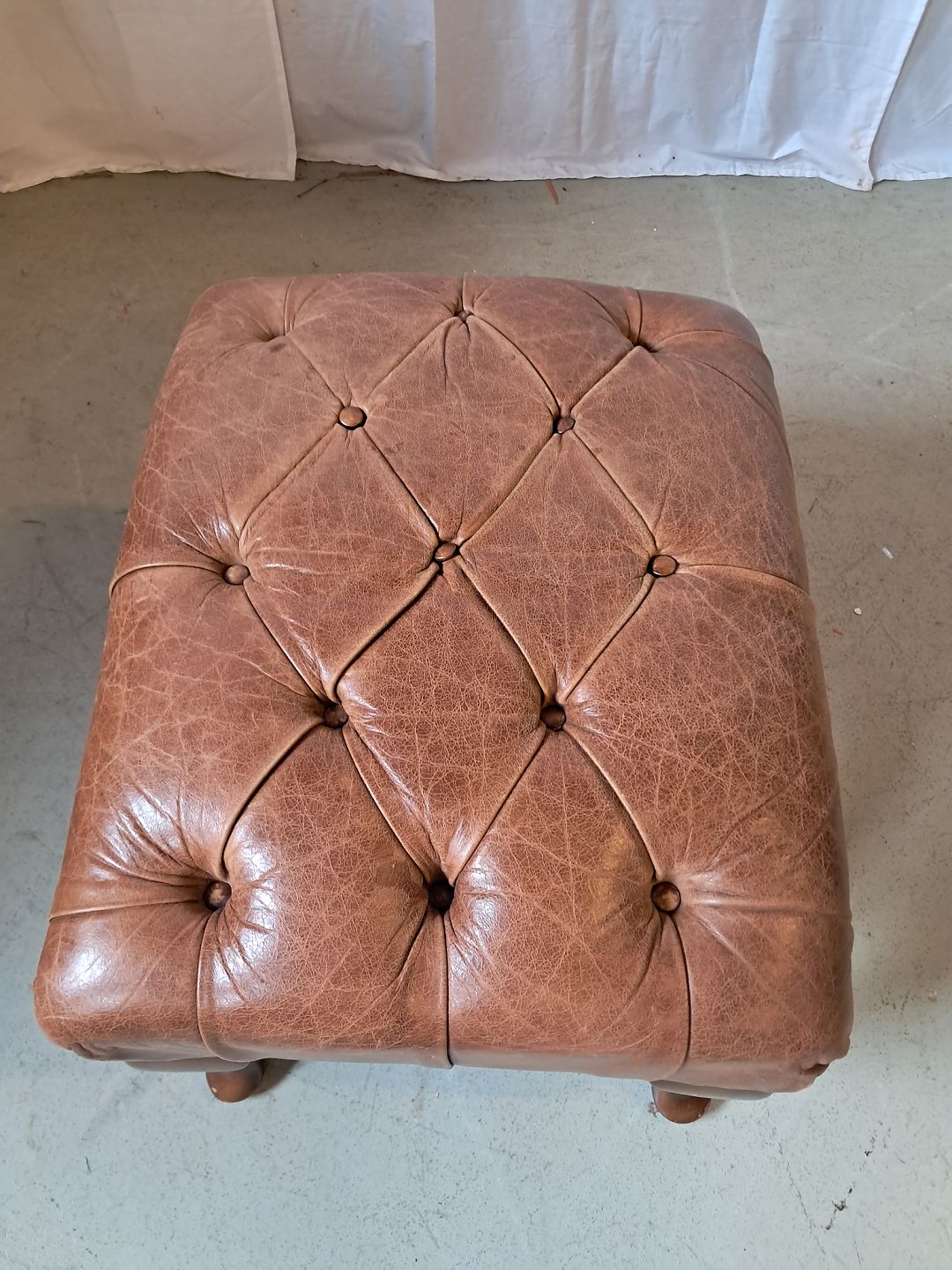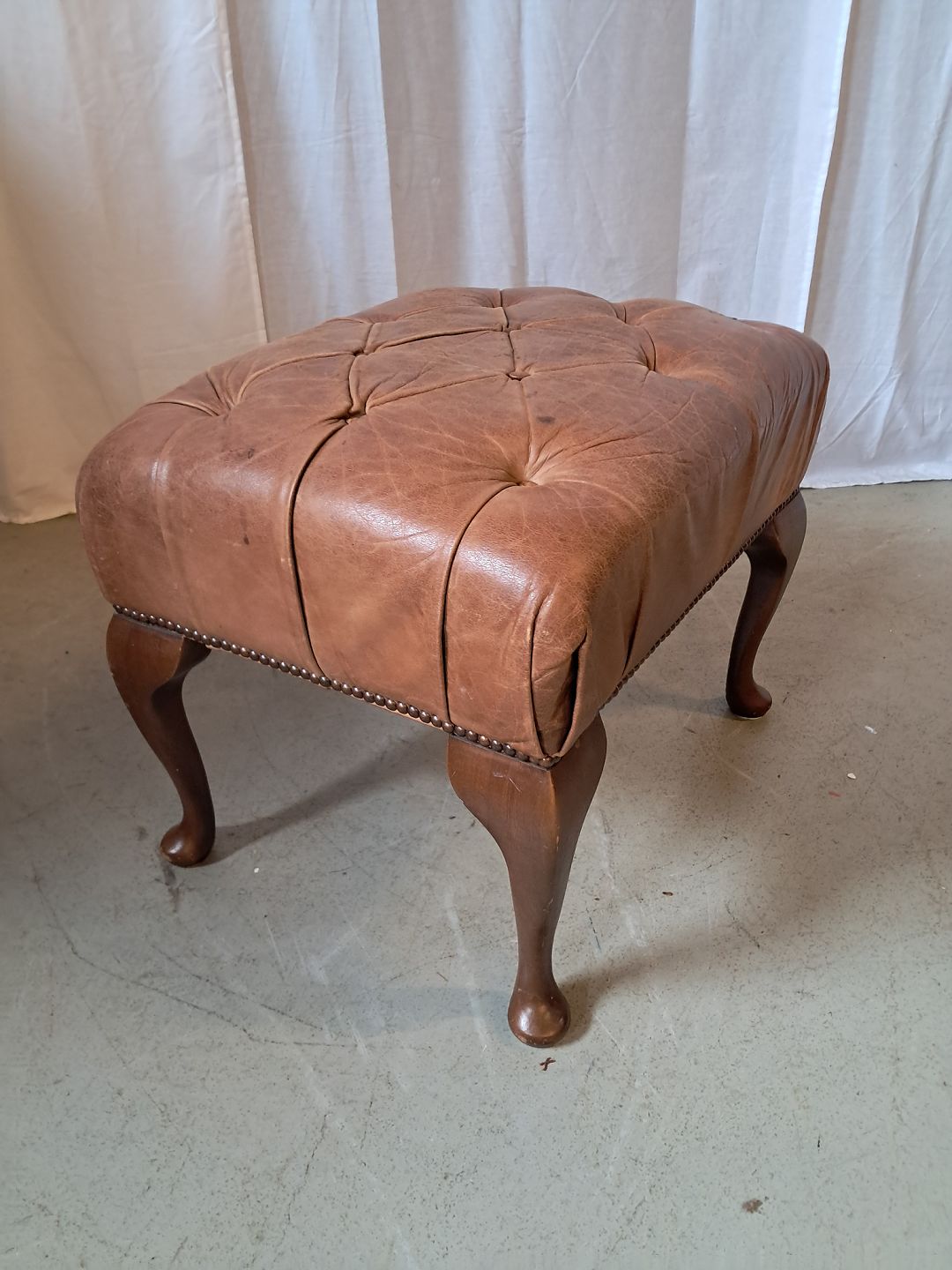 Skammel i læder og bøgetræ, fra 1990erne. Den har brugsspor. Højde 46cm Bredde 46cm Længde 60cm Emne nummer: 77011