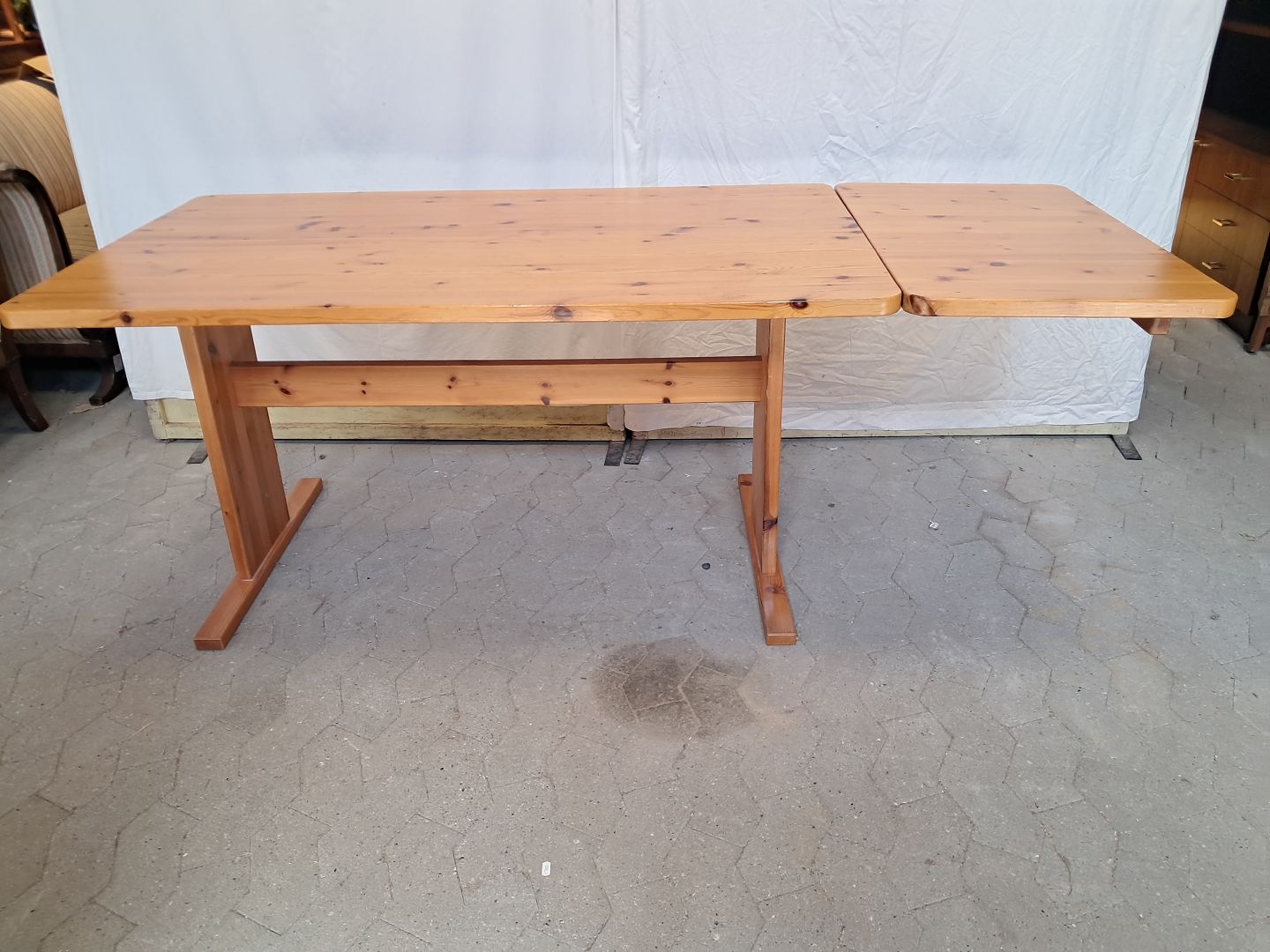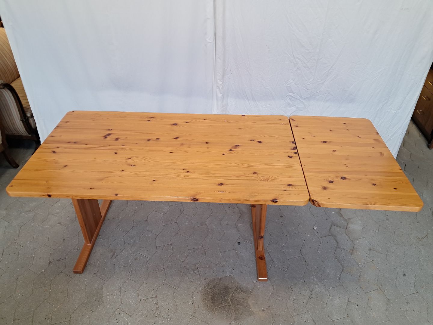 Bord i massivt fyrretræ, fra 1990erne. Det har brugsspor. Højde 71cm Bredde 79cm Længde 140cm Længde med klap 190cm Emne nummer: 91887