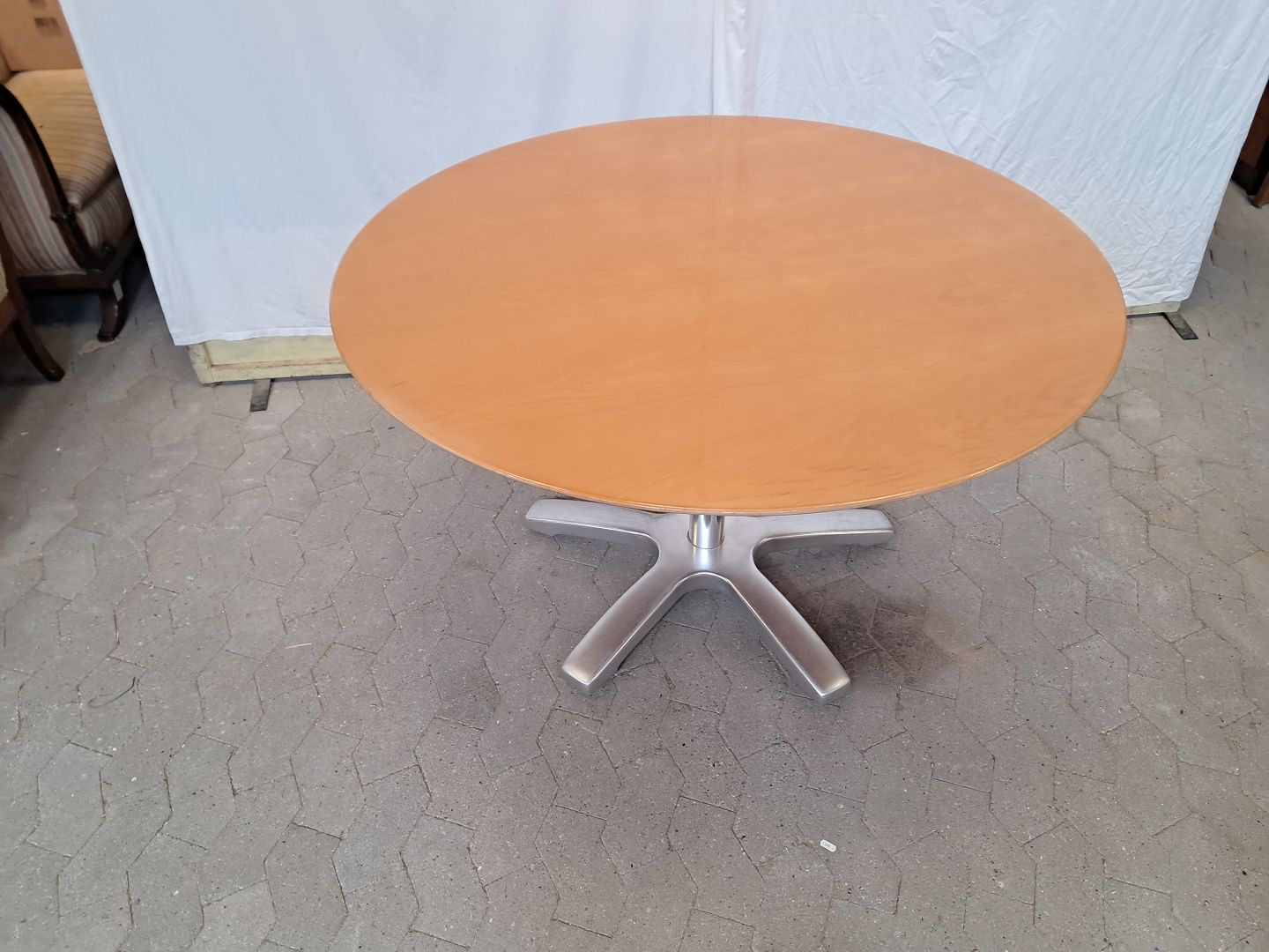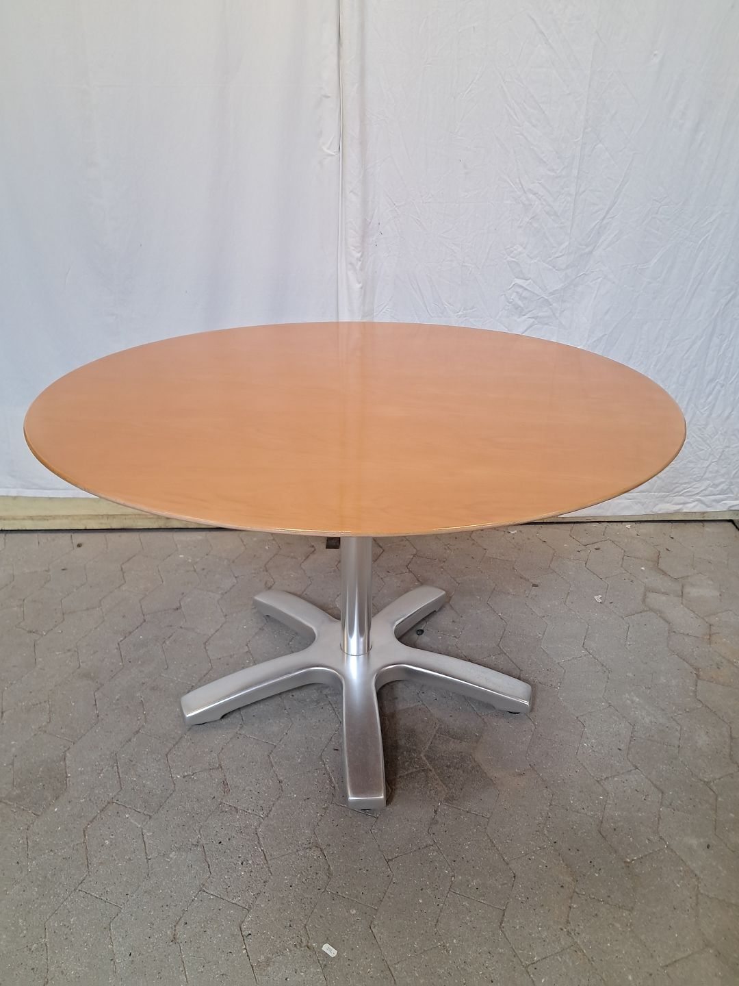 Rundt spisebord i fineret bøgetræ med metal understel, fra 2000erne. Det har brugsspor. Højde 70cm Diameter 120cm Emne nummer: 91890