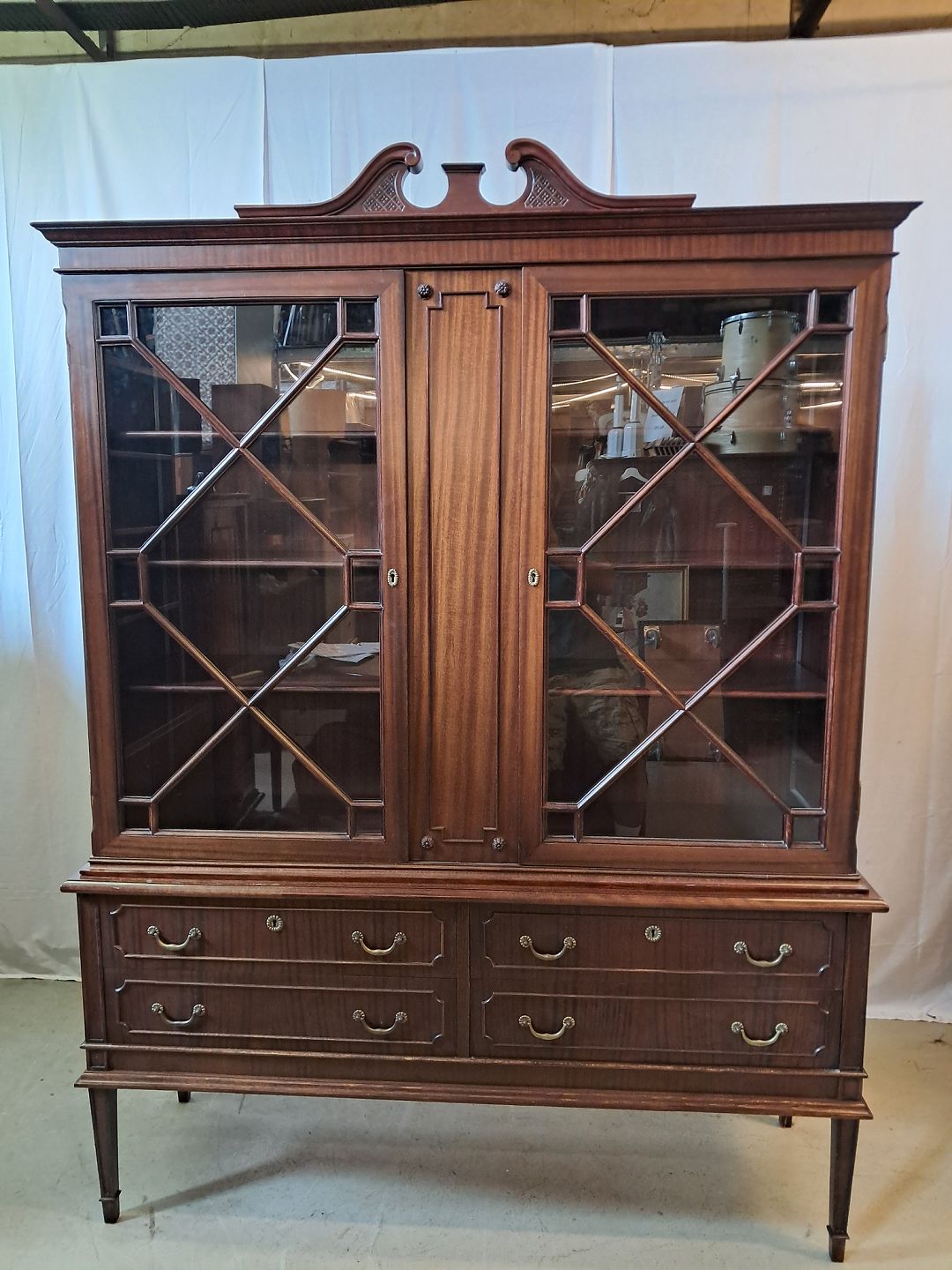 Dækketøjsskab i fineret mahogni, fra 1980erne. Det har brugsspor. Højde 194cm Bredde 145cm Dybde 45cm Emne nummer: 77016