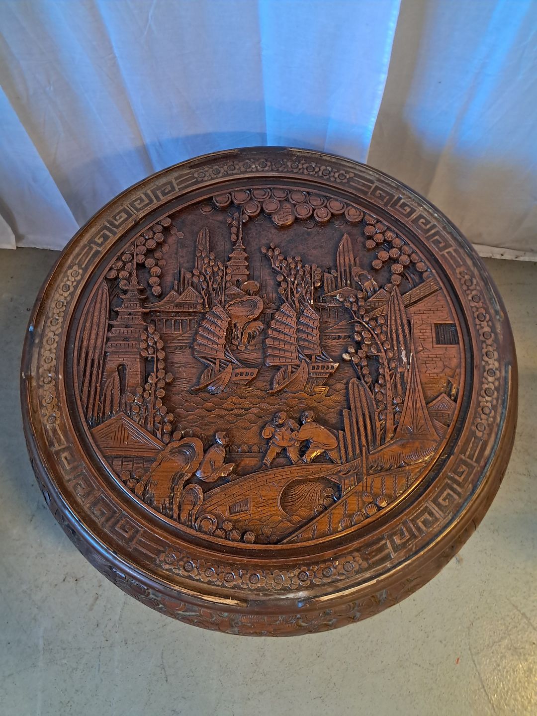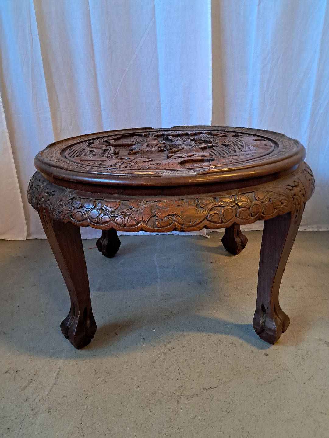 Asiatisk sofabord i massivt træ, fra 1980erne. Det har brugsspor. Højde 52cm Diameter 82cm Emne nummer: 77018