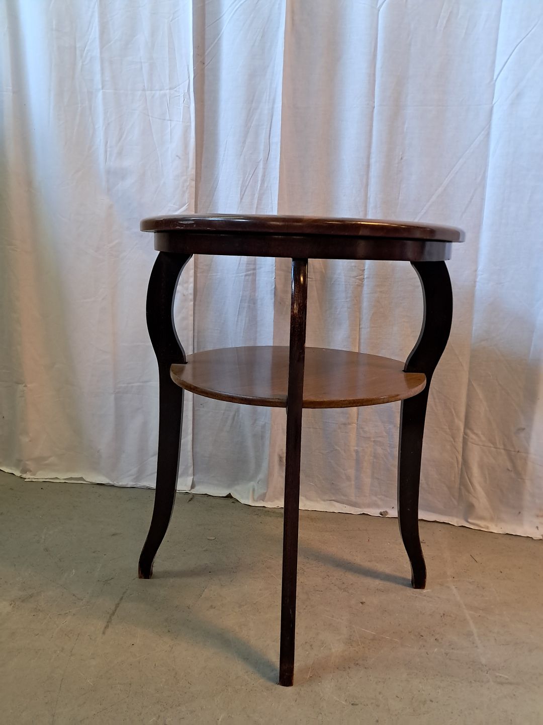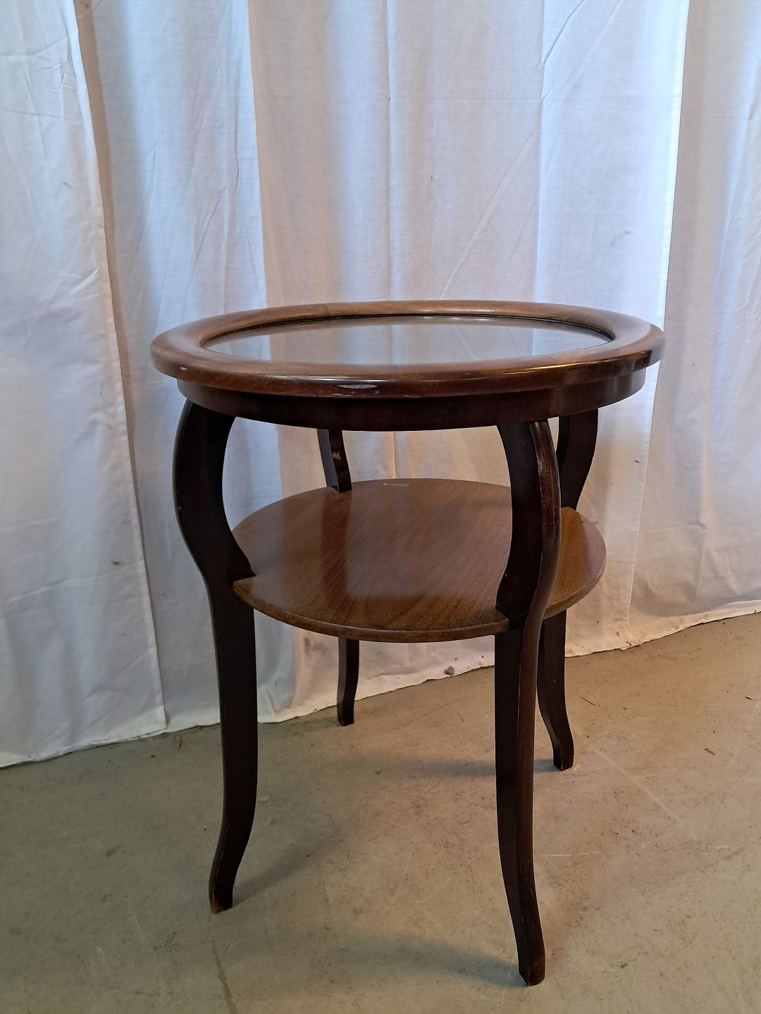 Sidebord i mahogni og bøgetræ med glasplade, fra 1920erne. Det har brugsspor. Højde 68cm Diameter 54cm Emne nummer: 77068