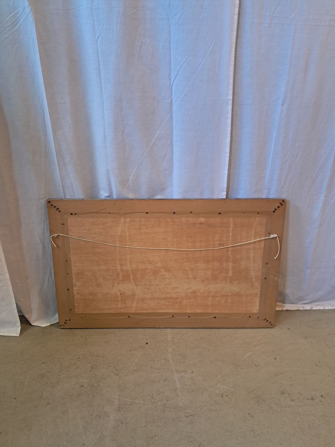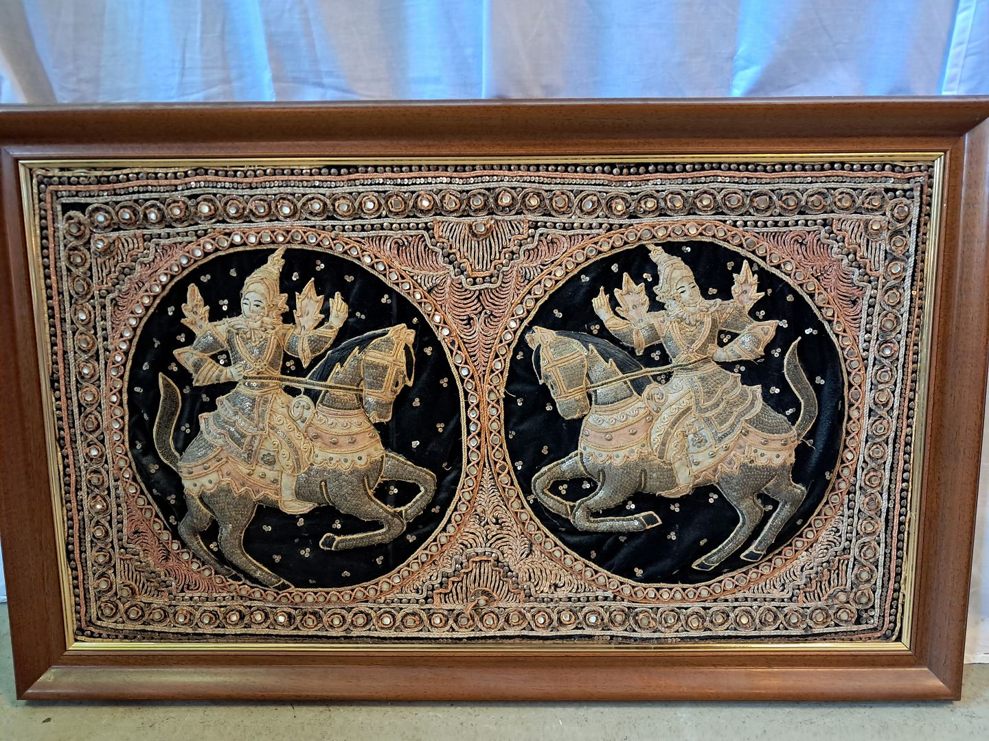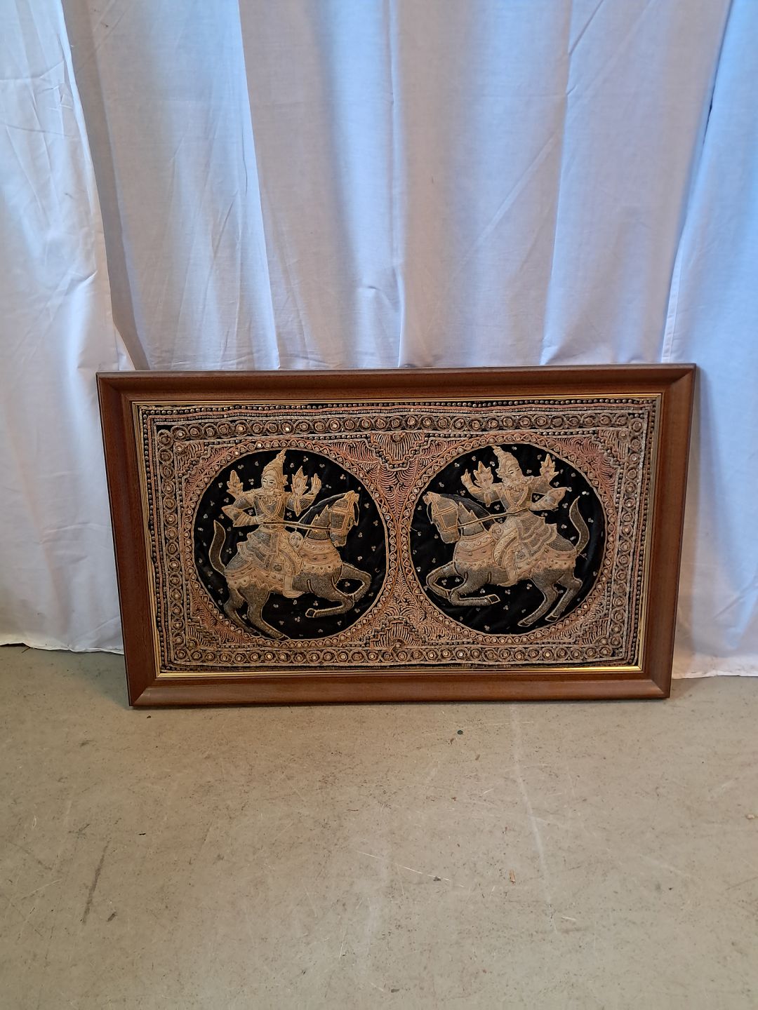 Indisk stof billede i træramme, fra 1990erne. Det har brugsspor. Højde 59cm Bredde 95cm Emne nummer: 77082
