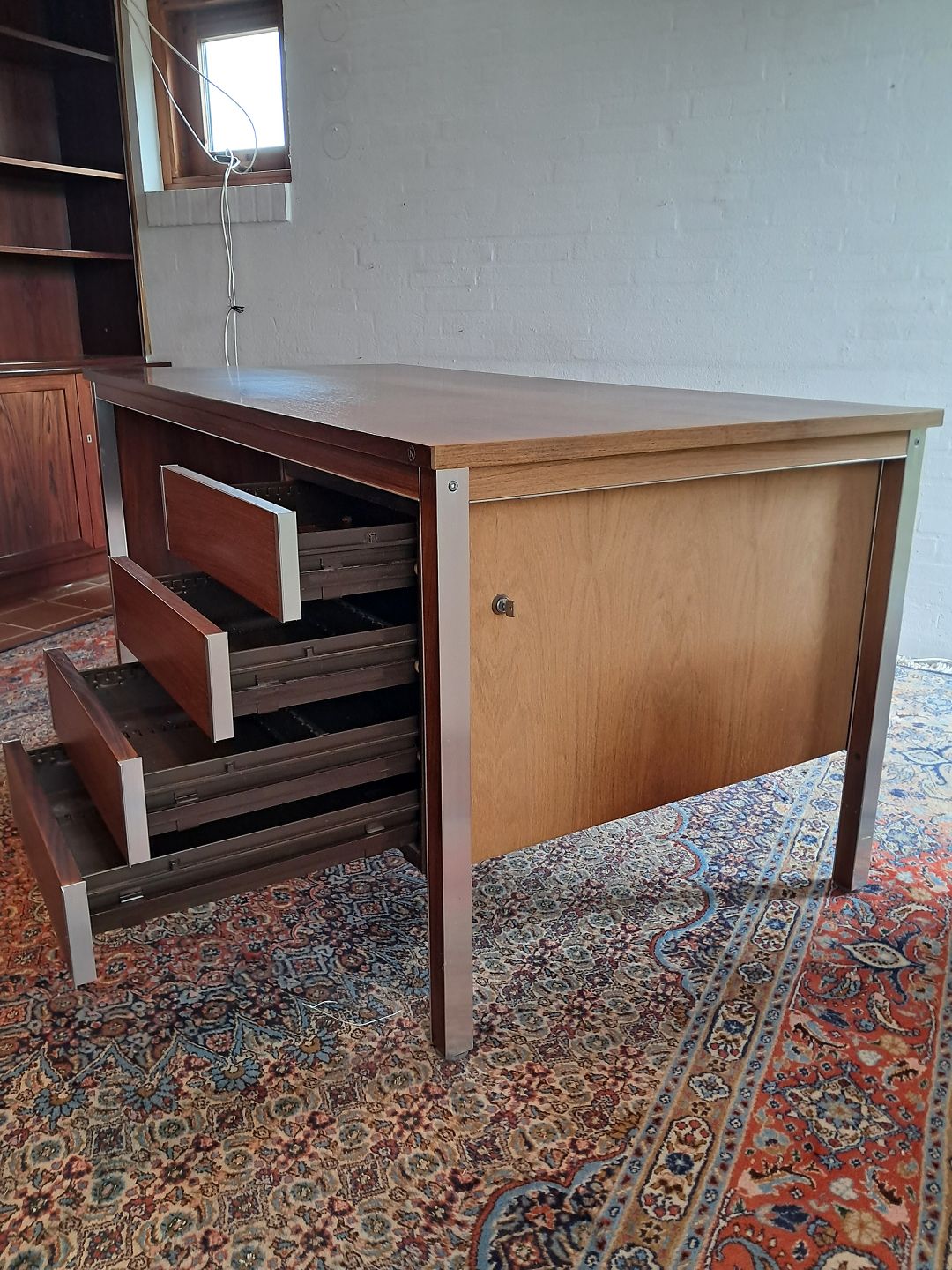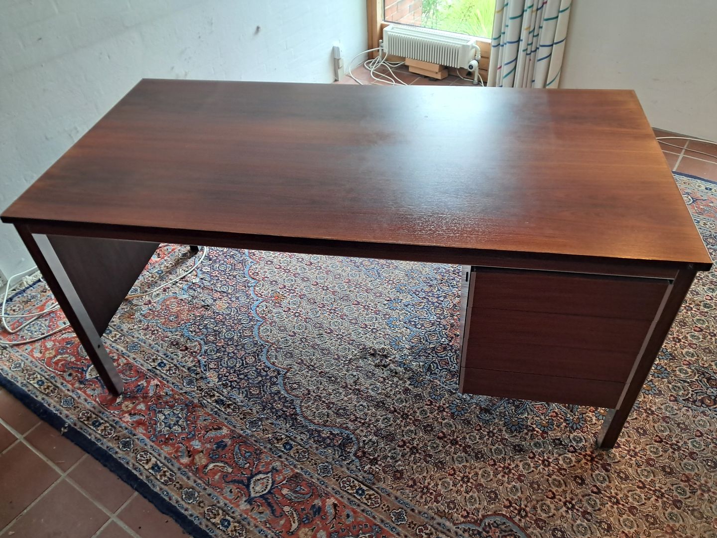Skrivebord i fineret palisander og aluminium, fra 1970erne. Det har brugsspor og mangler en skue på bagstykket.(se foto) Højde 73cm Bredde 158cm Dybde 79cm Emne nummer: 77085