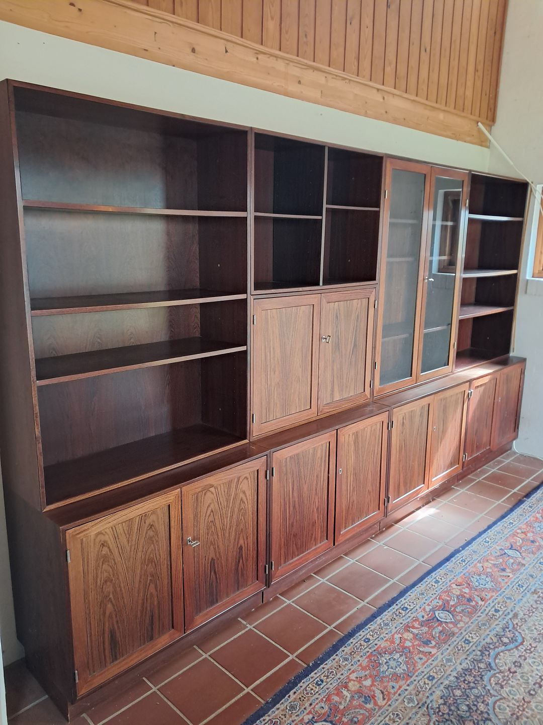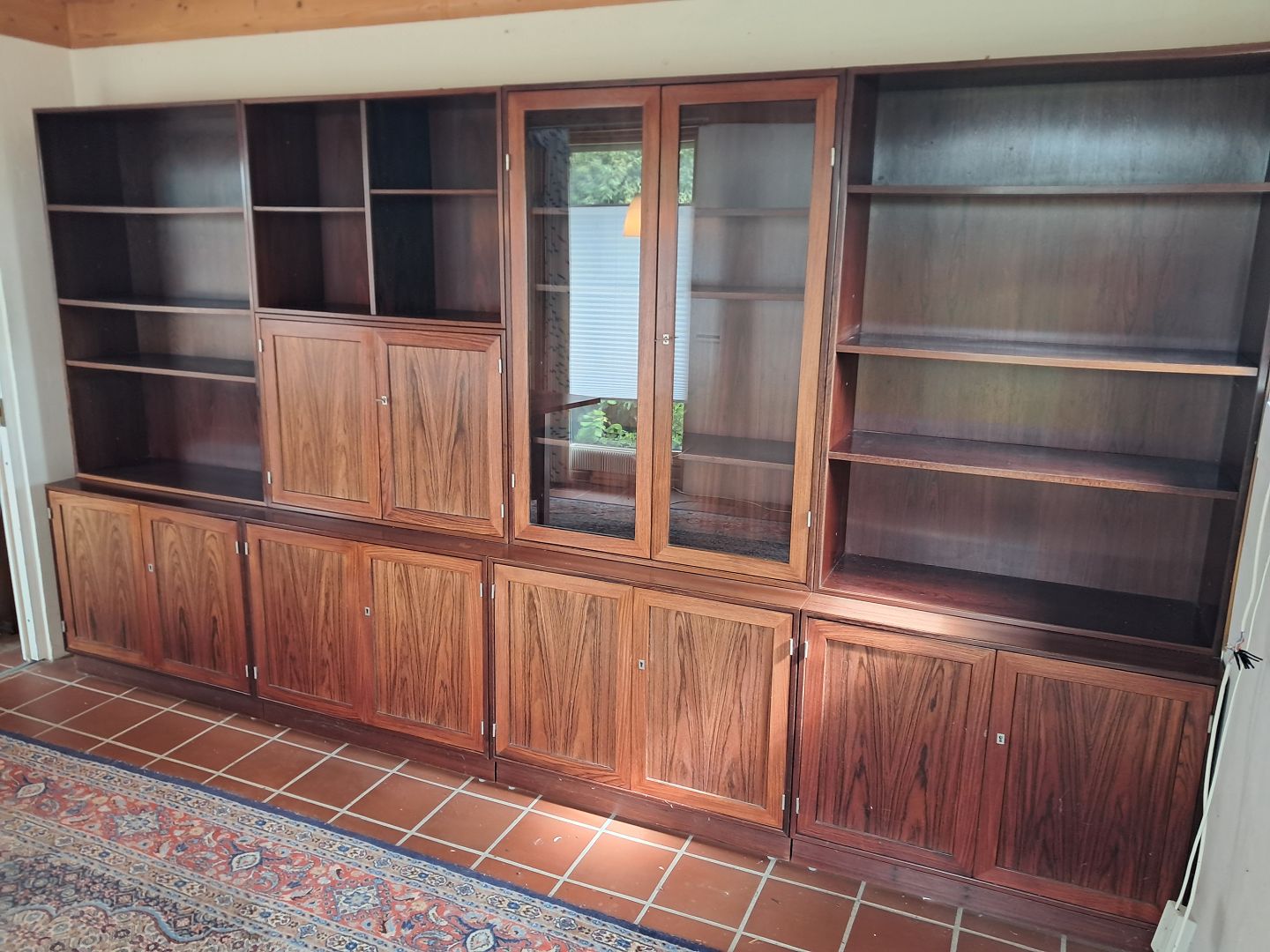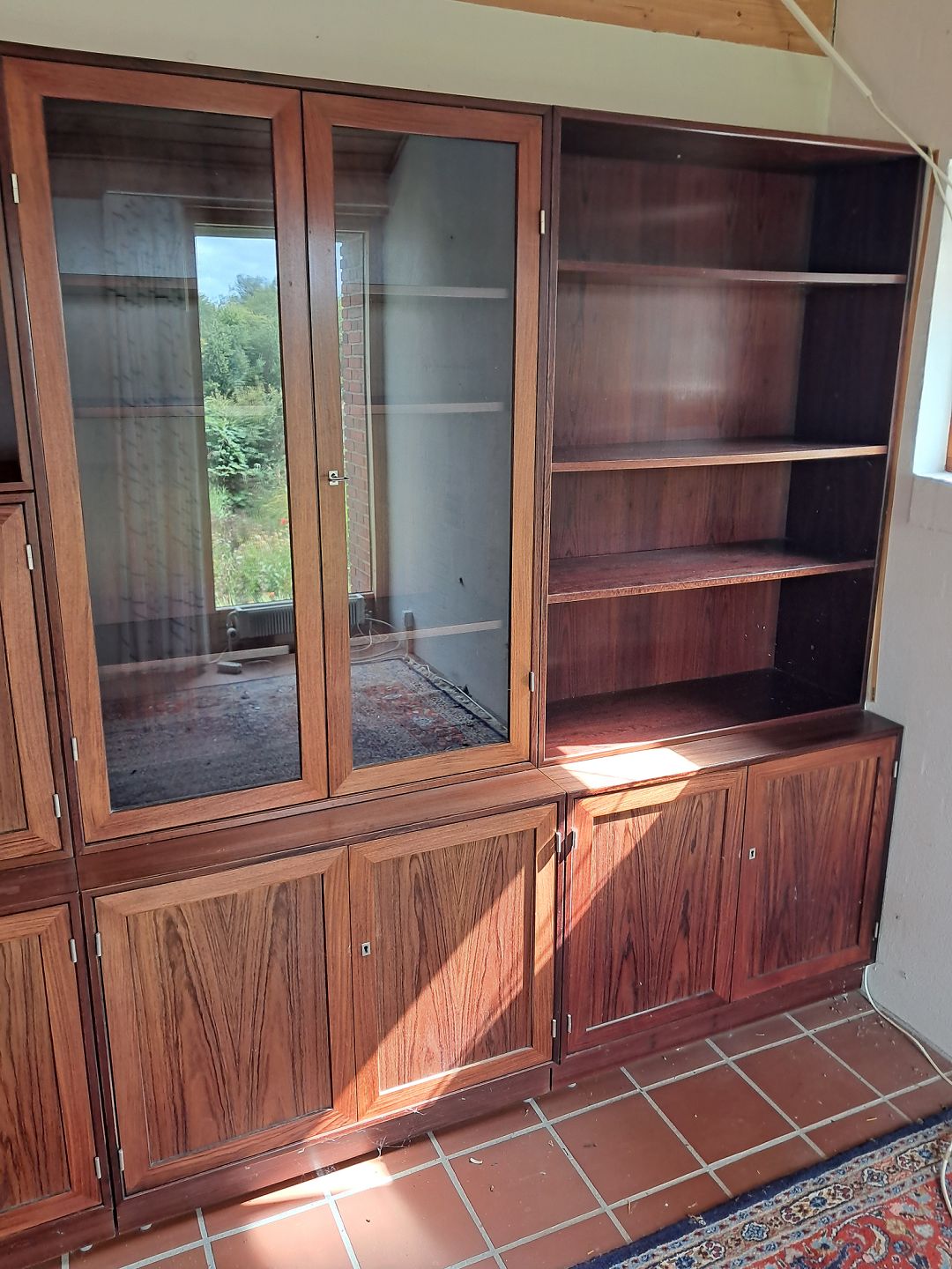 4 Reolsektioner i fineret palisander, fra 1960erne. De har brugsspor. Højde 190cm Bredde 342cm Dybde i bunden 42cm Dybde i toppen 30cm Højde på toppen 120cm Højde på bunden 70cm Dybde i toppen 30cm Emne nummer: 77086