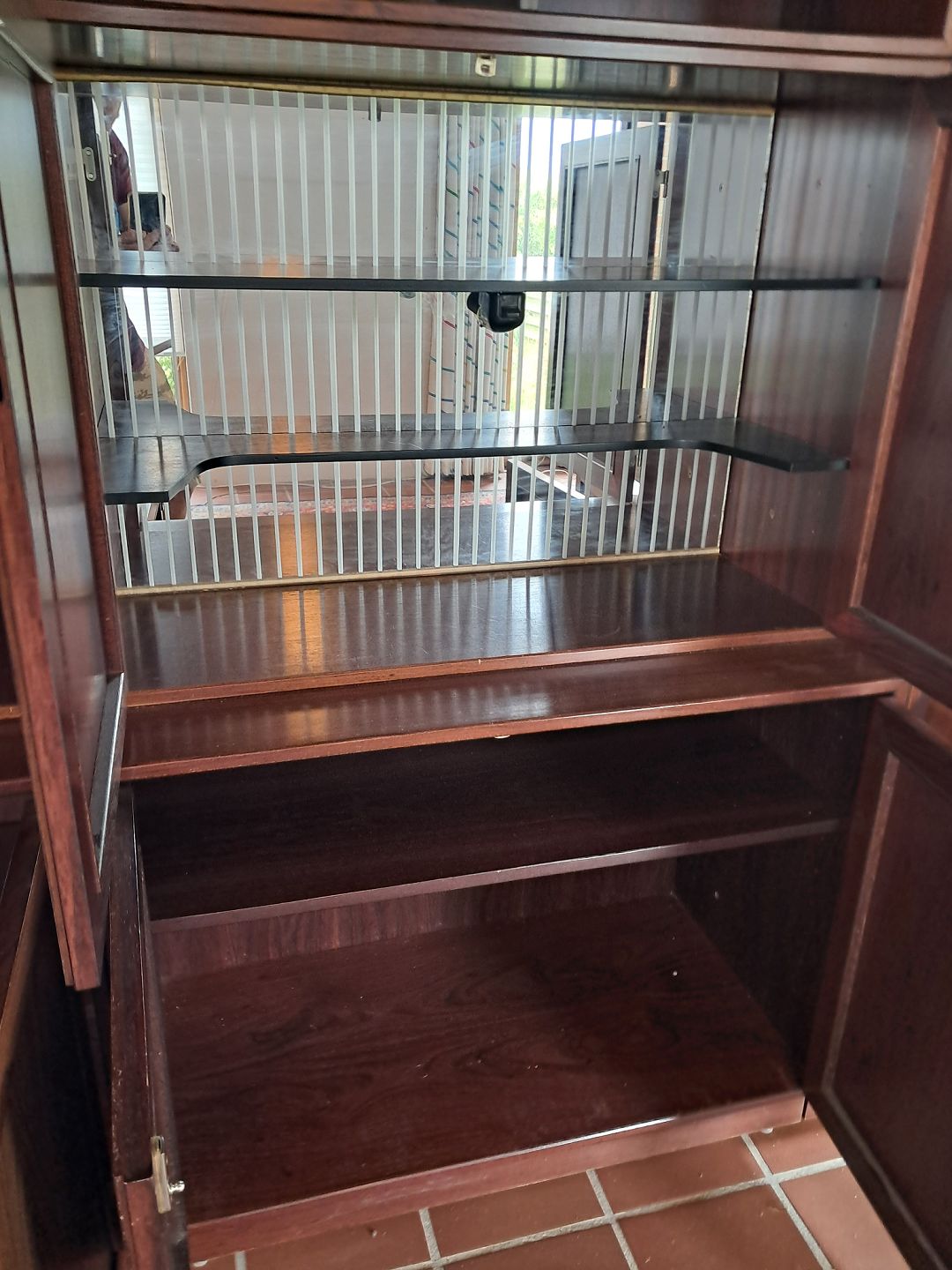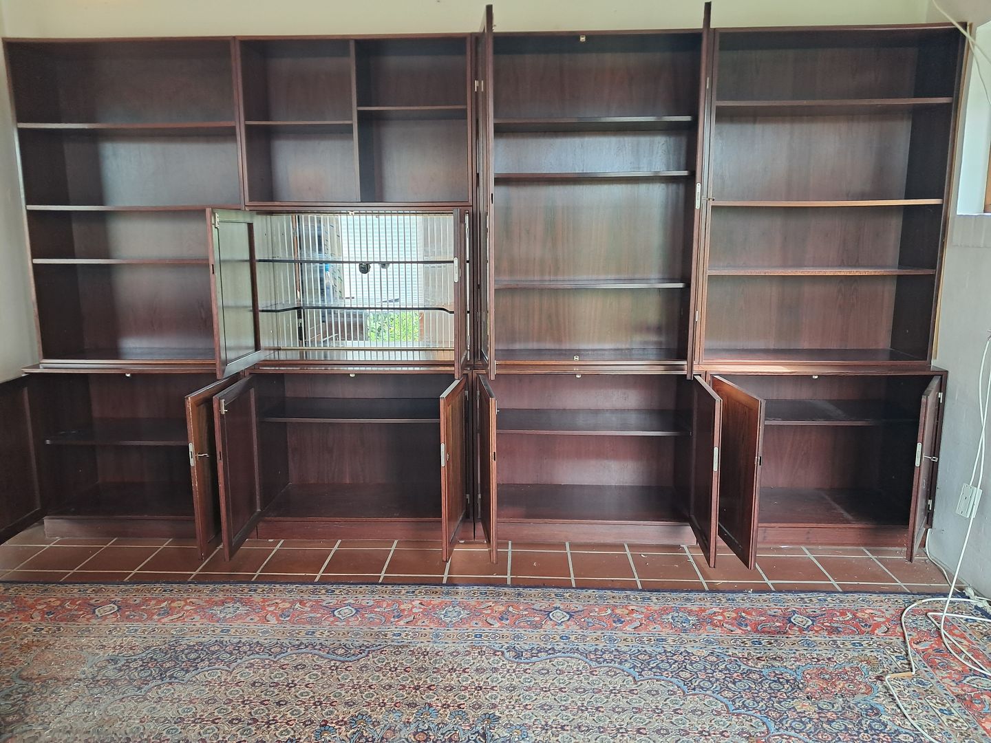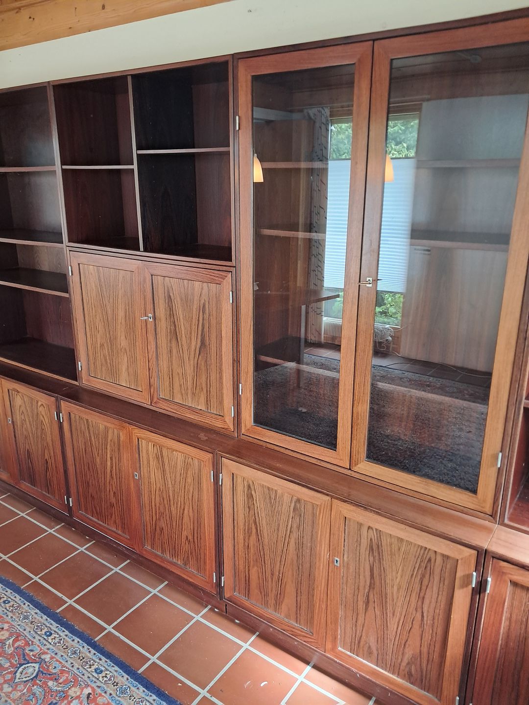 4 Reolsektioner i fineret palisander, fra 1960erne. De har brugsspor. Højde 190cm Bredde 342cm Dybde i bunden 42cm Dybde i toppen 30cm Højde på toppen 120cm Højde på bunden 70cm Dybde i toppen 30cm Emne nummer: 77086
