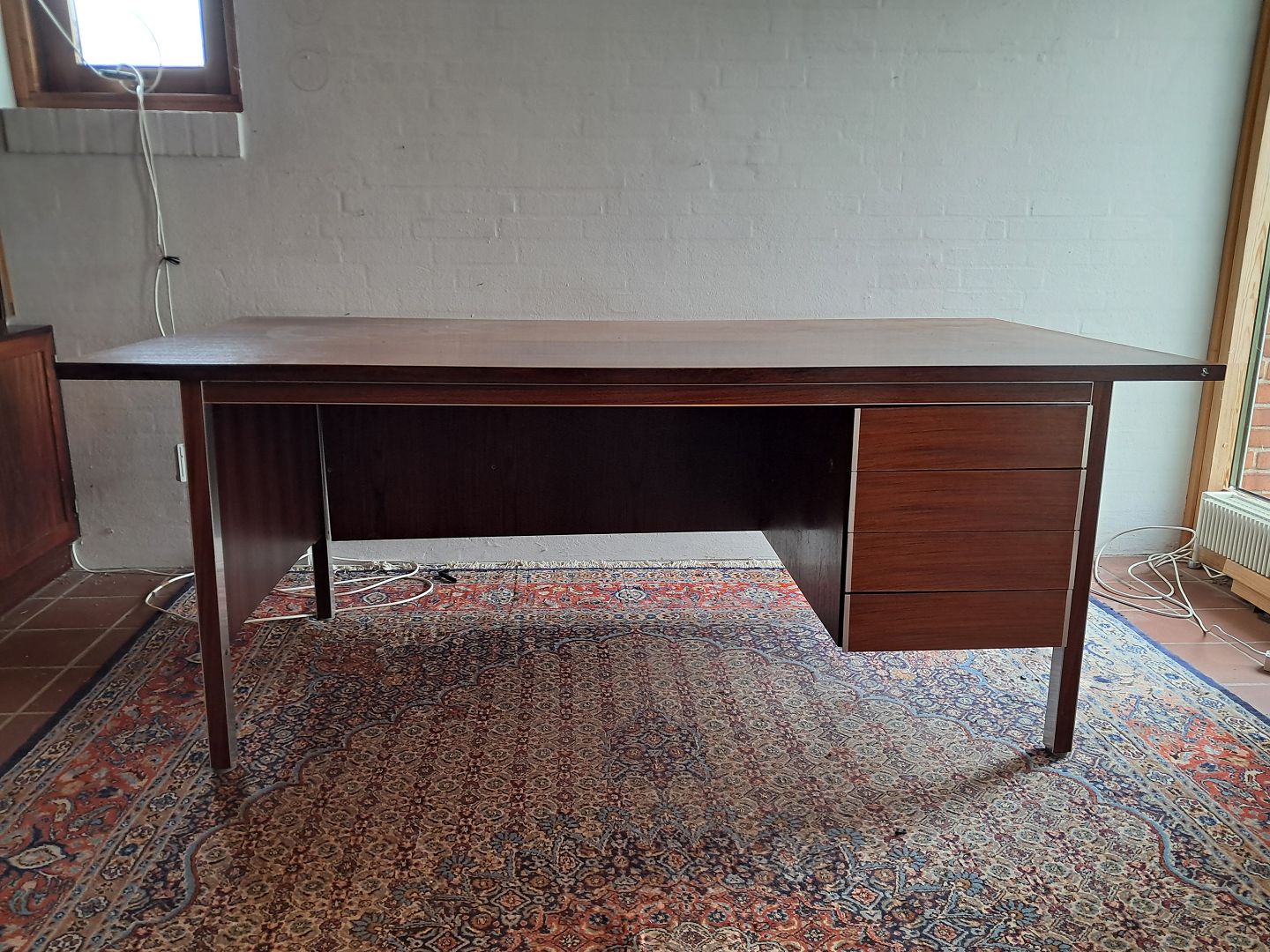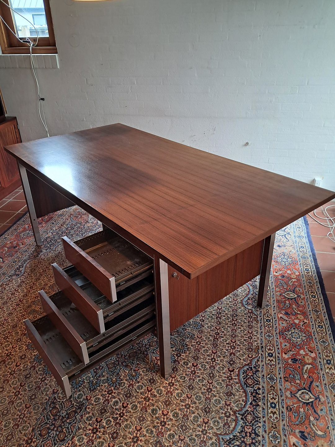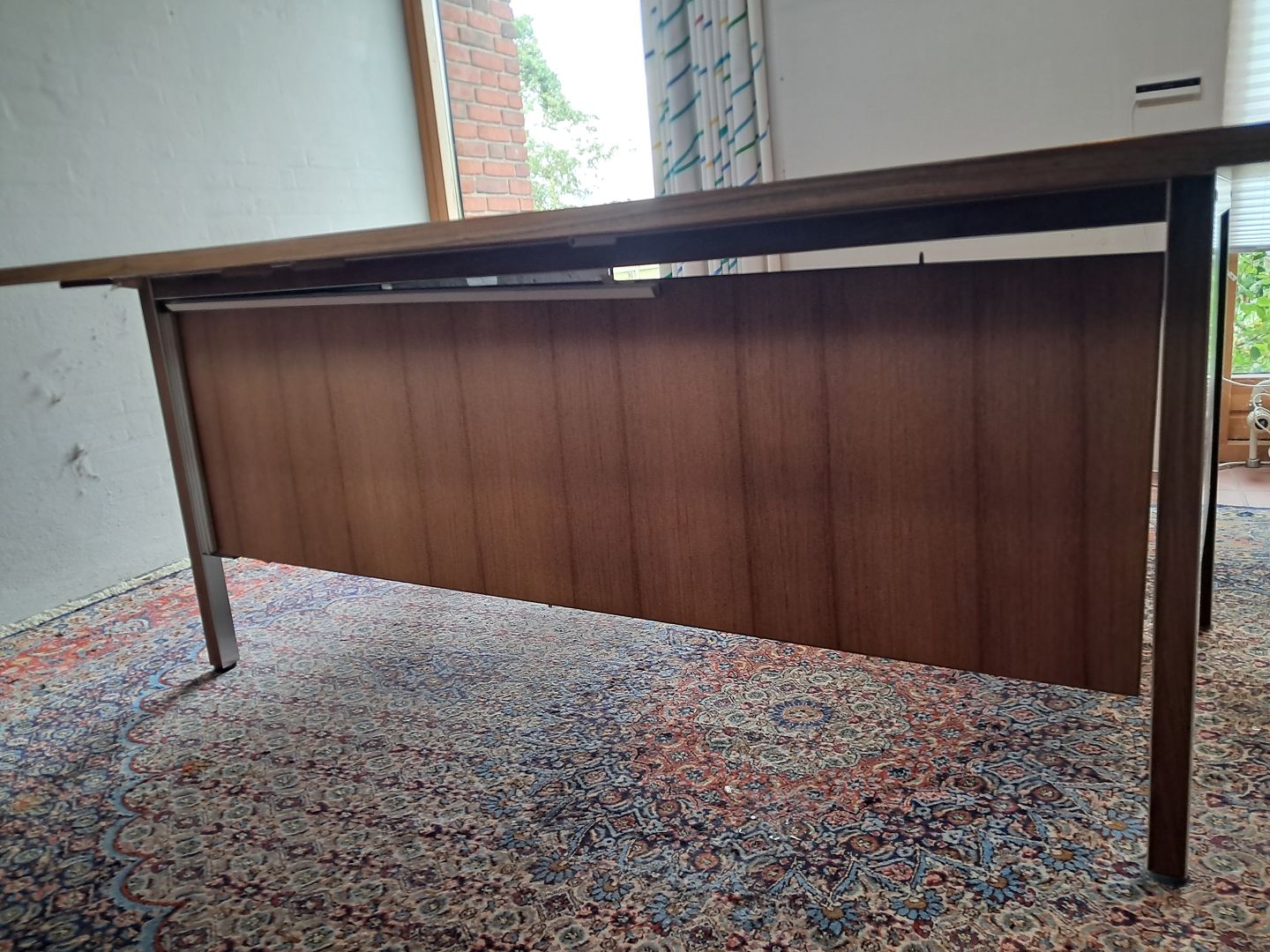 Skrivebord i fineret palisander og aluminium, fra 1970erne. Det har brugsspor og mangler en skue på bagstykket.(se foto) Højde 74cm Bredde 192cm Dybde 96cm Emne nummer: 77087