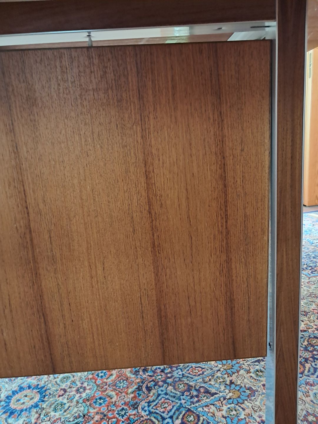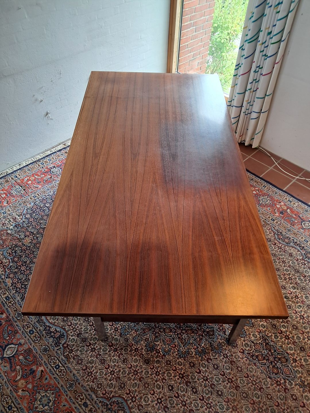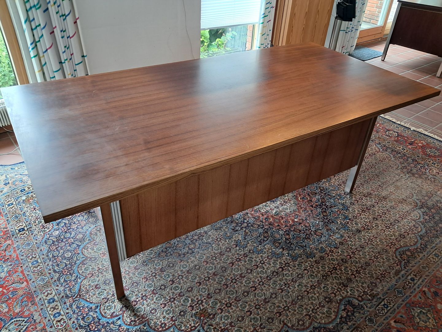 Skrivebord i fineret palisander og aluminium, fra 1970erne. Det har brugsspor og mangler en skue på bagstykket.(se foto) Højde 74cm Bredde 192cm Dybde 96cm Emne nummer: 77087