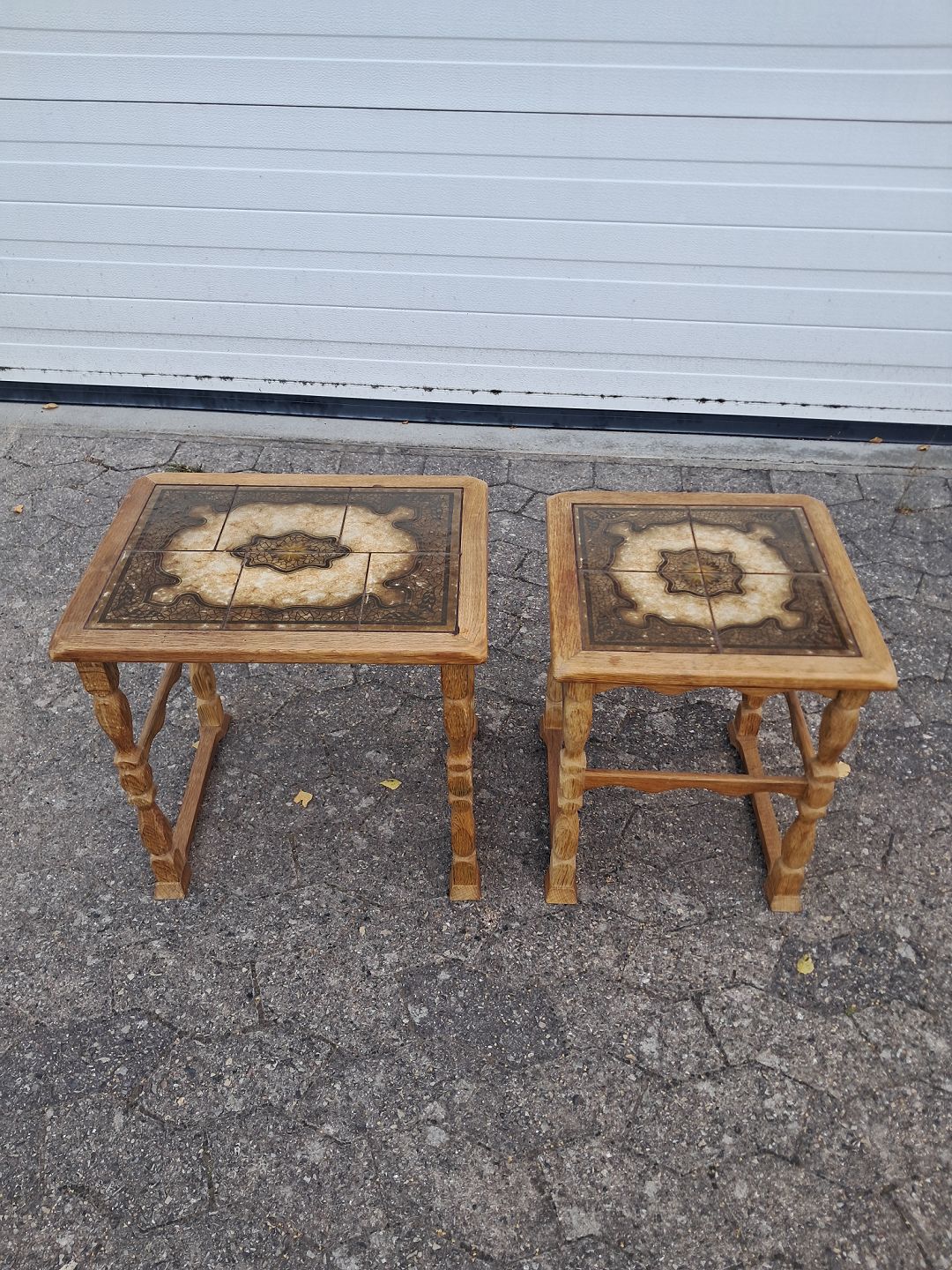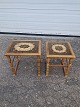 2 Borde i massivt egetræ og kakler, fra 1980erne. De har brugsspor. Højde 42cm Bredde 48cm Dybde 42cm Emne nummer: 77150