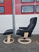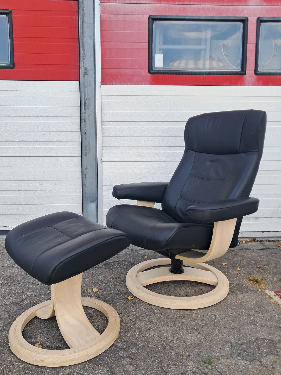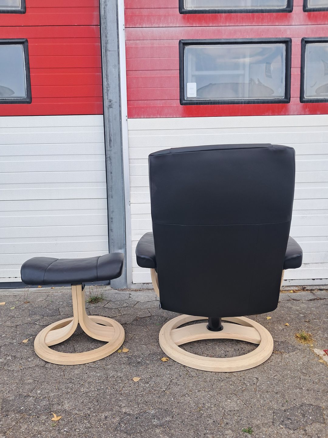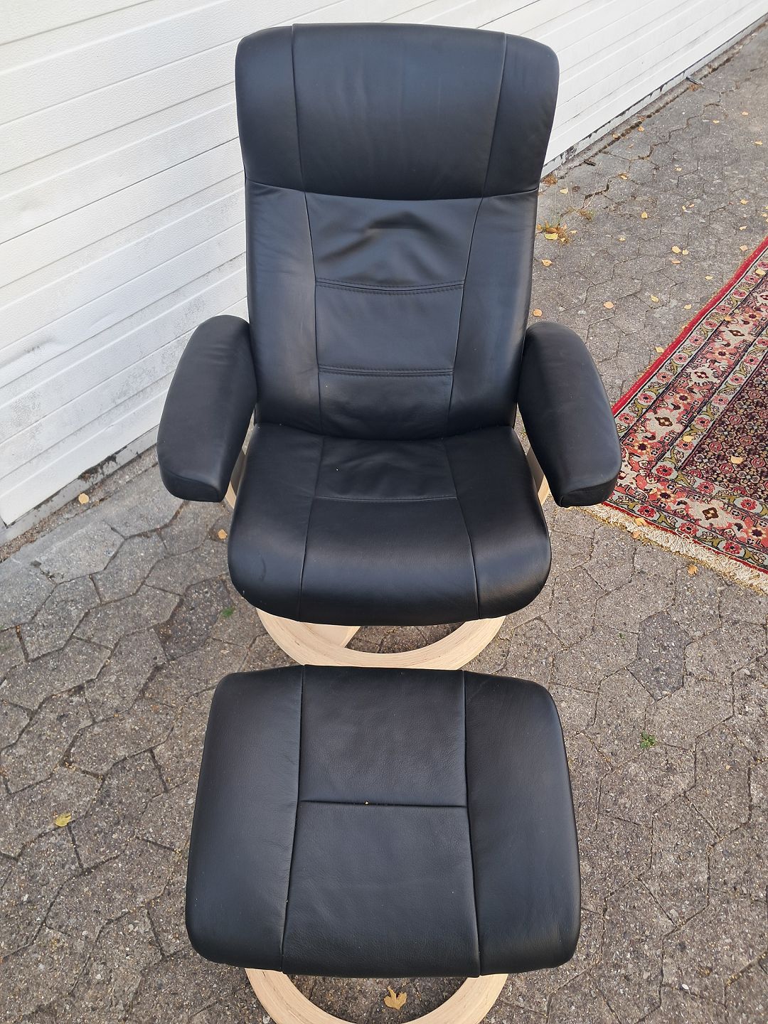 Lænestol og skammel i bøgetræ med læderbetræk, fra 2000erne. Den har brugsspor. Ryghøjde 103cm Sædehøjde 45cm Emne nummer: 77153