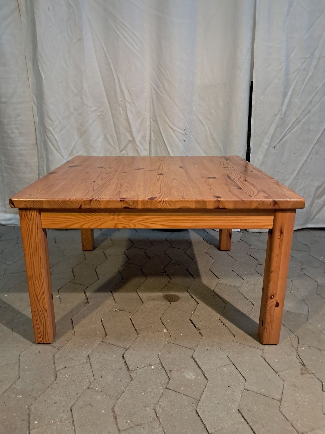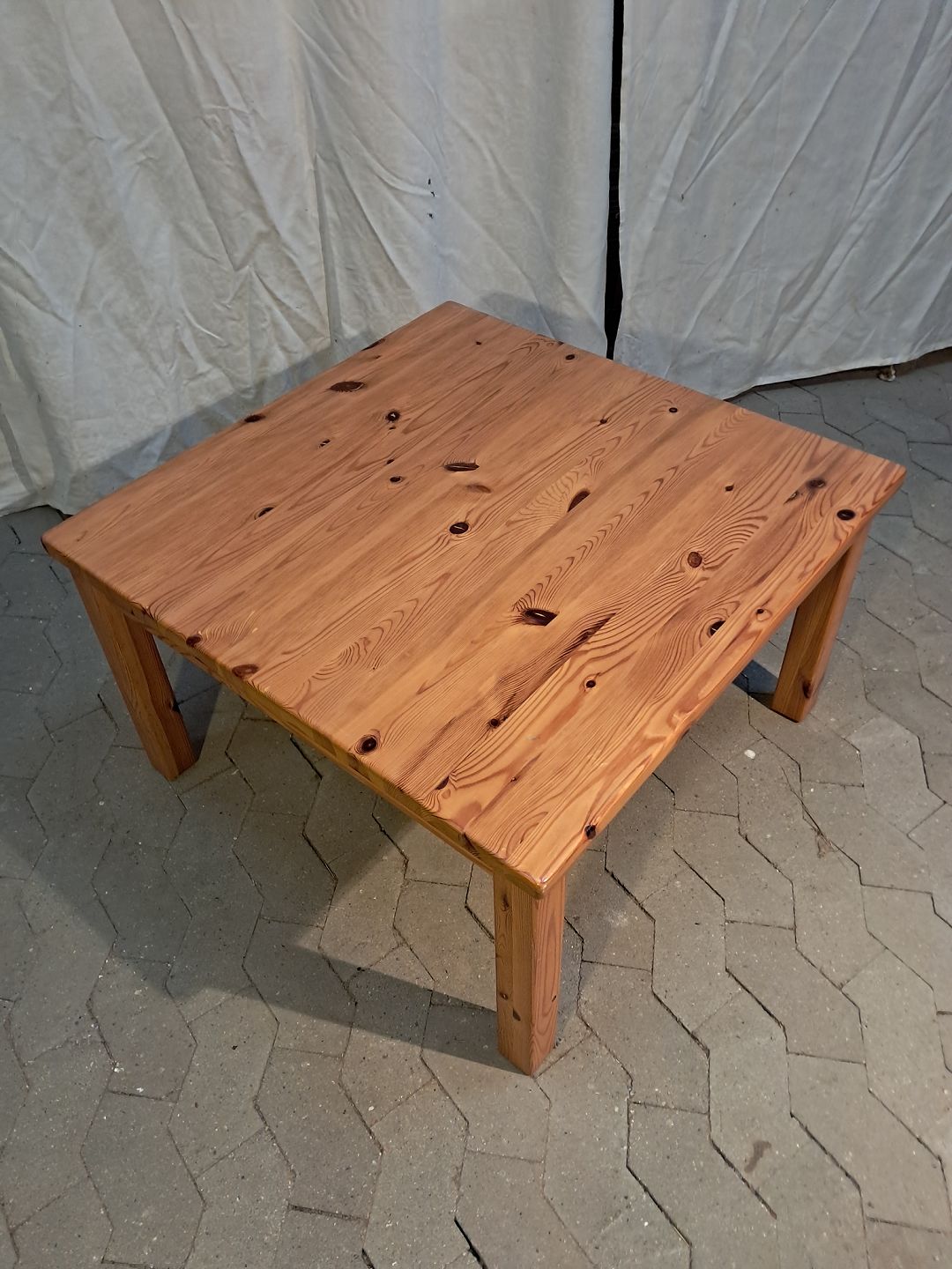 Sofabord i massivt fyrretræ, fra 1980erne. Det har brugsspor. Højde 48cm Bredde 80cm Længde 80cm Emne nummer: 91904