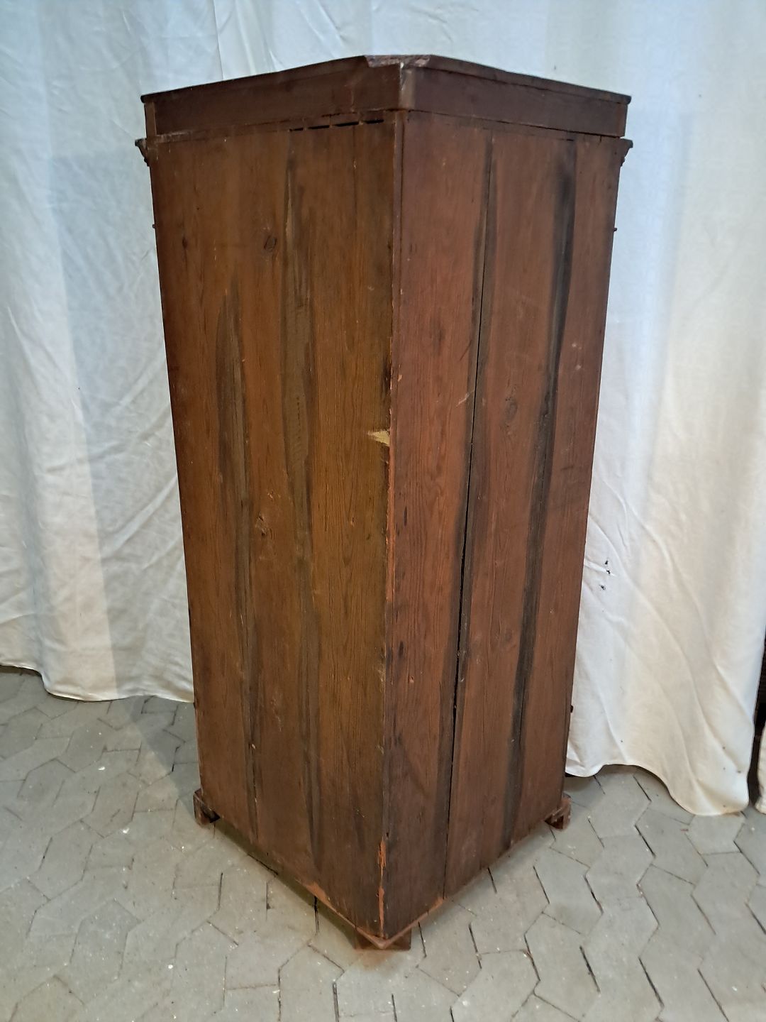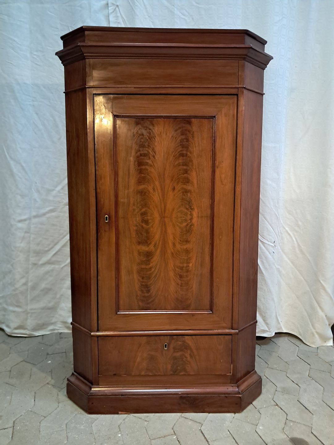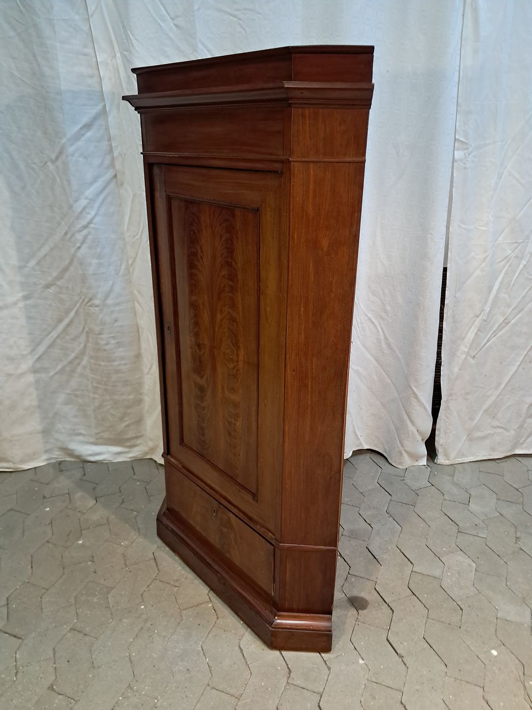 Hjørneskab i fineret mahogni, fra 1900erne. Det har brugsspor og defekt finer. Højde 149cm Bredde 85cm Dybder 60cm Emne nummer: 91905