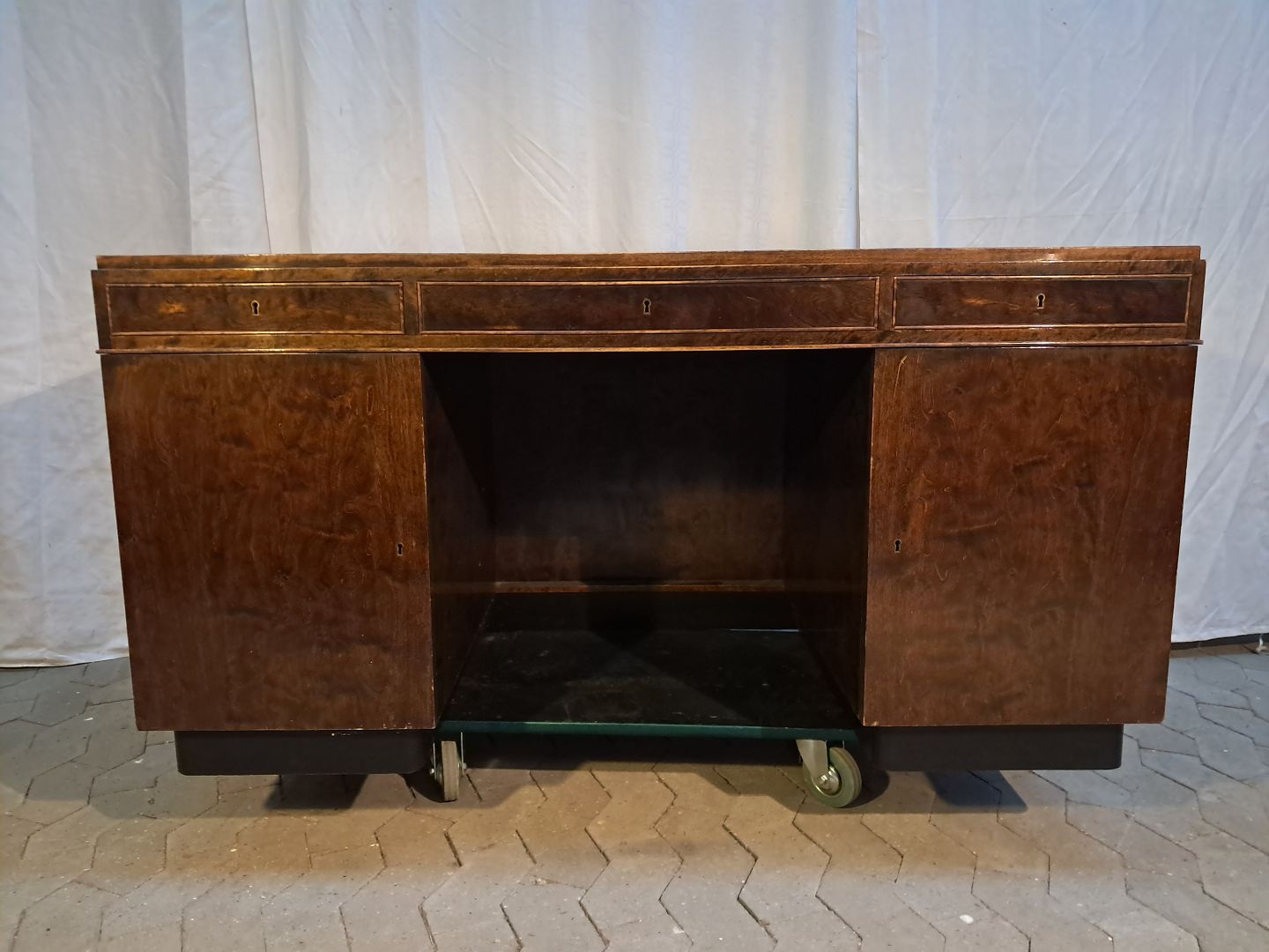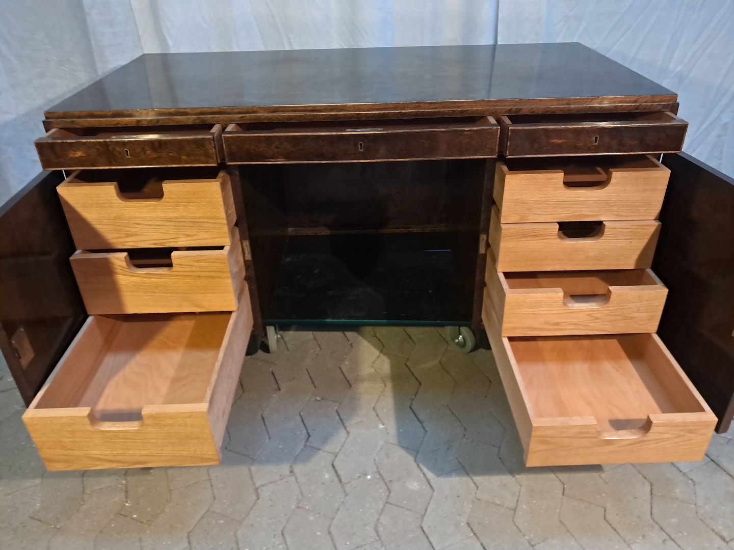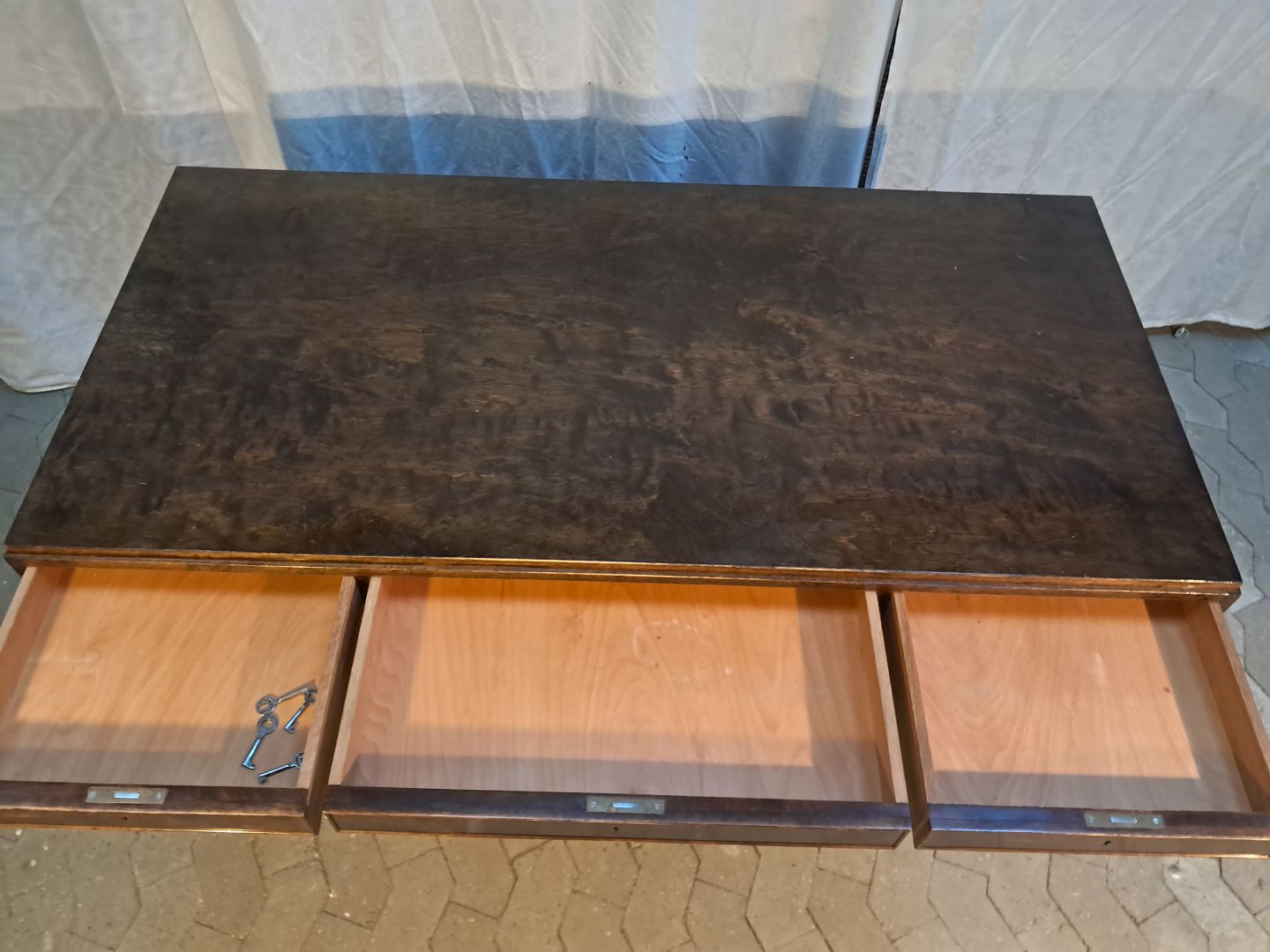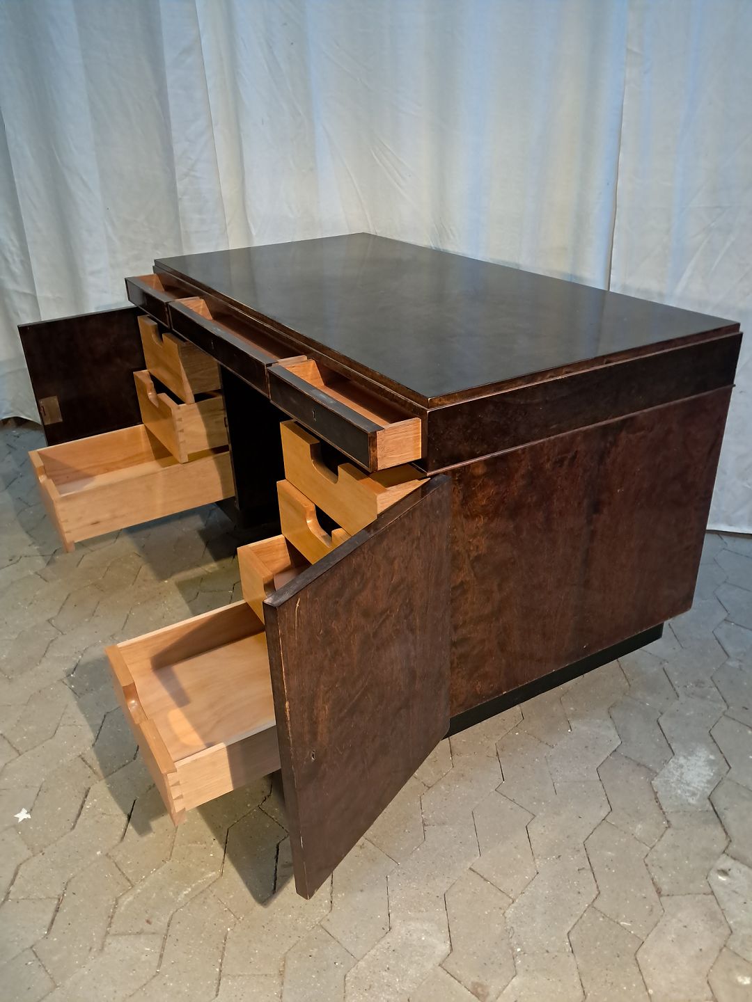 Skrivebord i fineret birketræ, fra 1930erne. Det har brugsspor. Højde 72cm Højde fra gulv til underkant 59cm Bredde 137cm Dybde 68cm Emne nummer: 91918