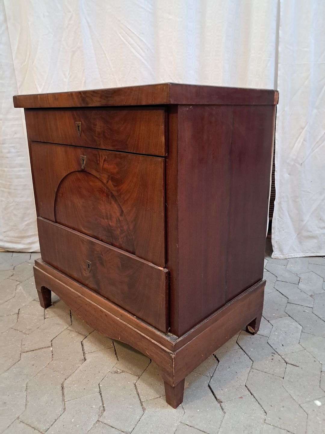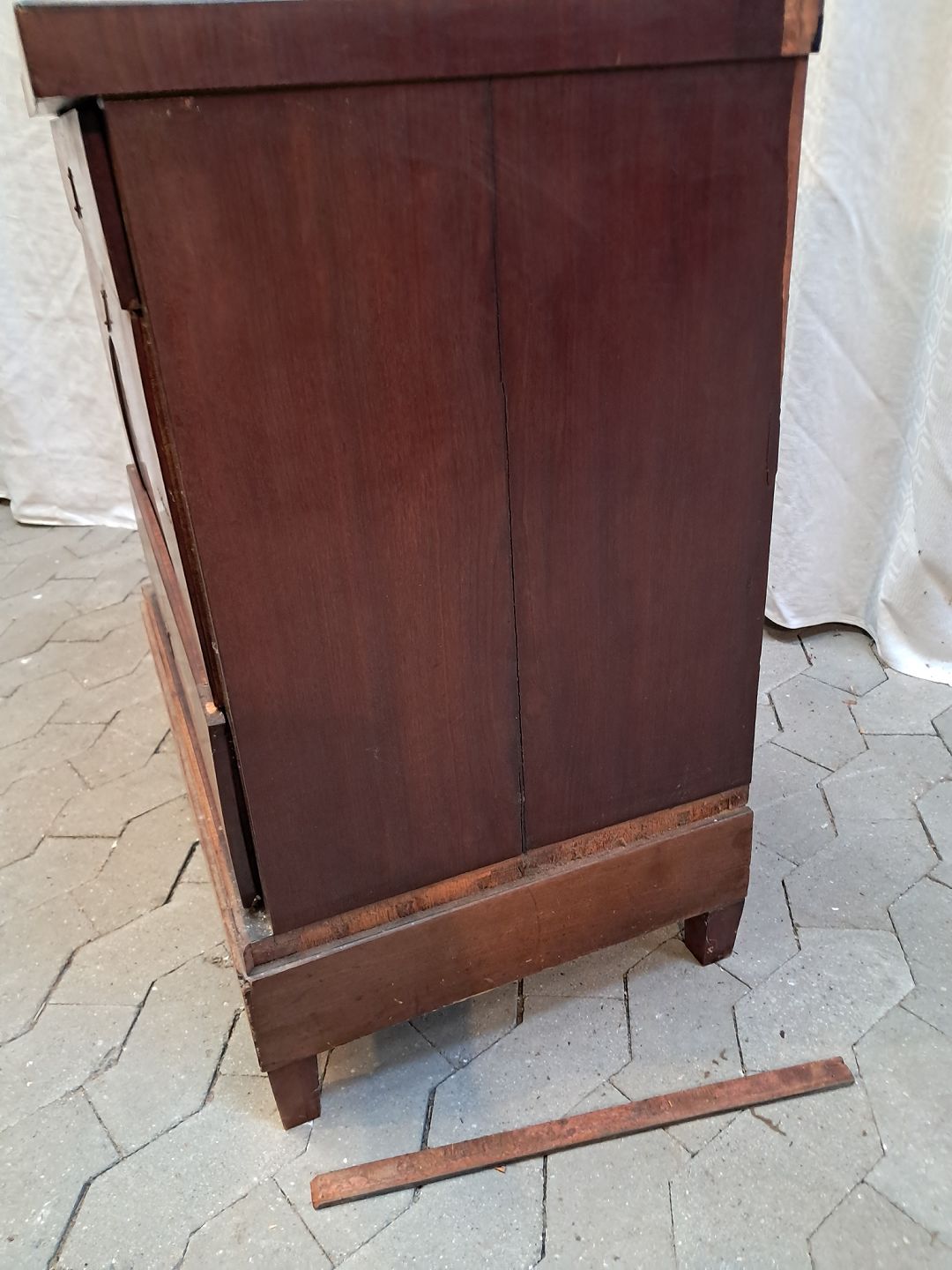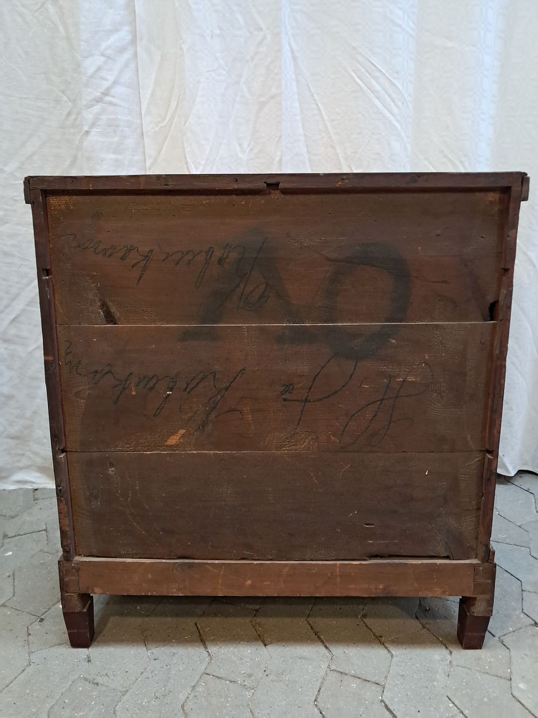 Kommodei fineret mahogni, fra 1910erne. Den har brugsspor og skufferne køre dårligt/trænger til service. Højde 81cm Bredde 73cm Dybde 46cm Emne nummer: 91935