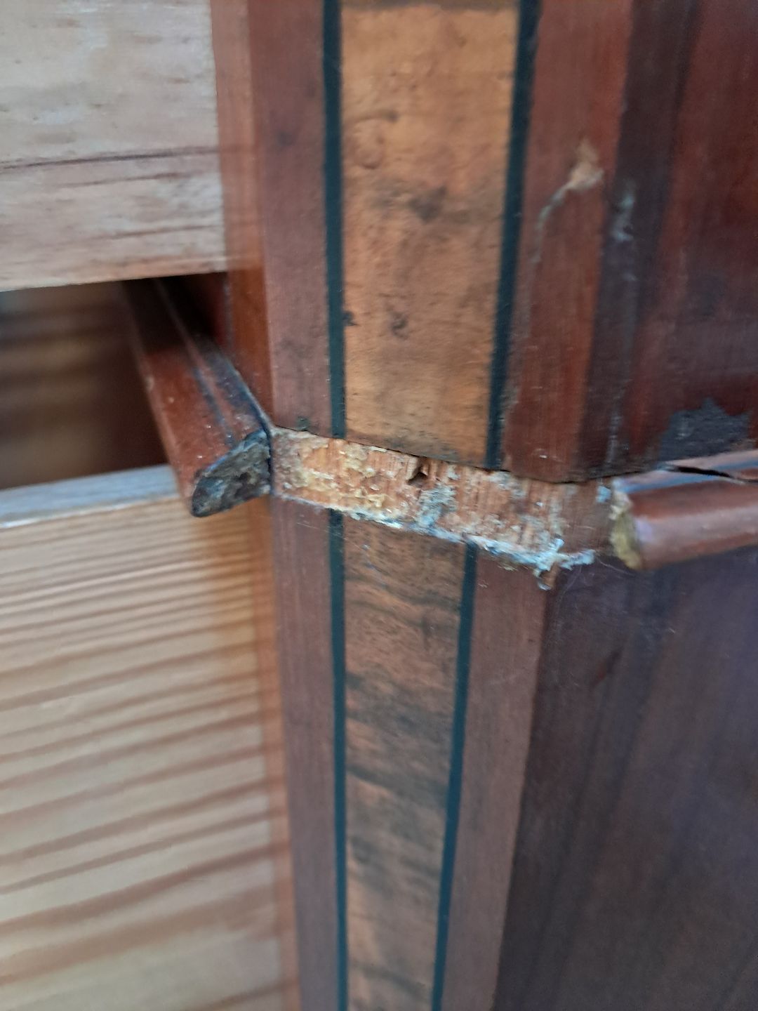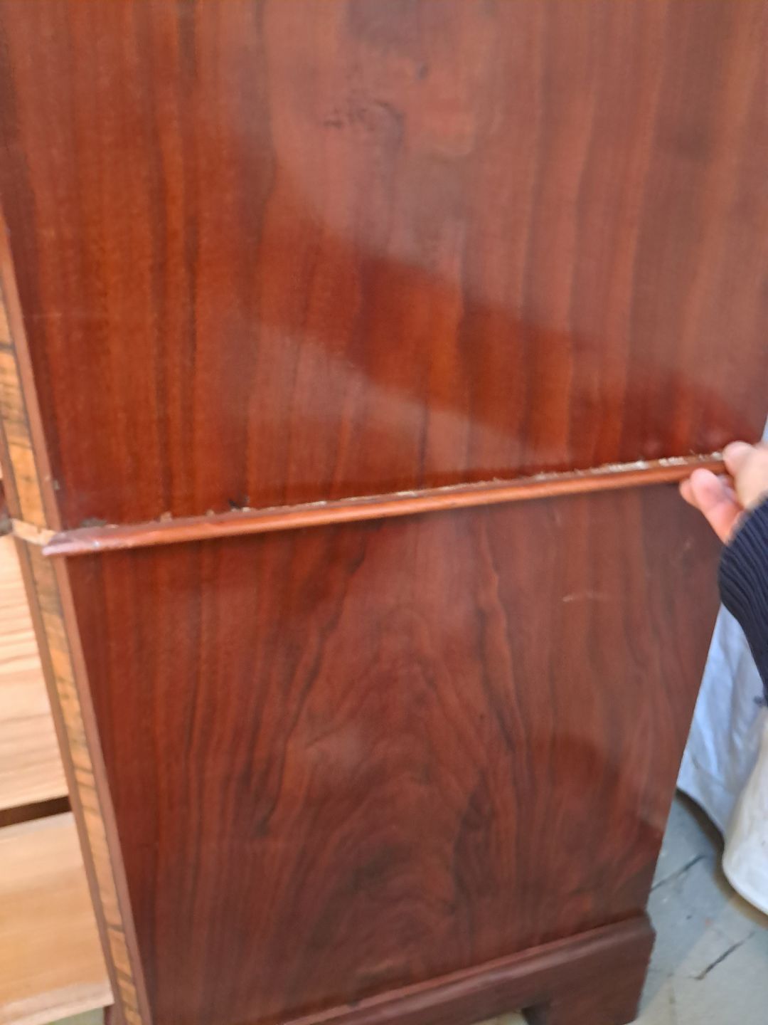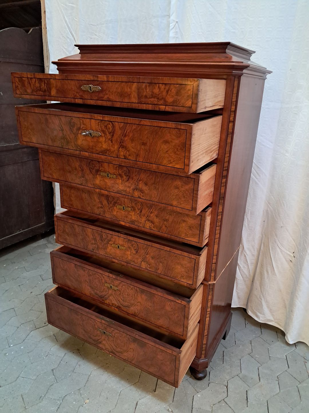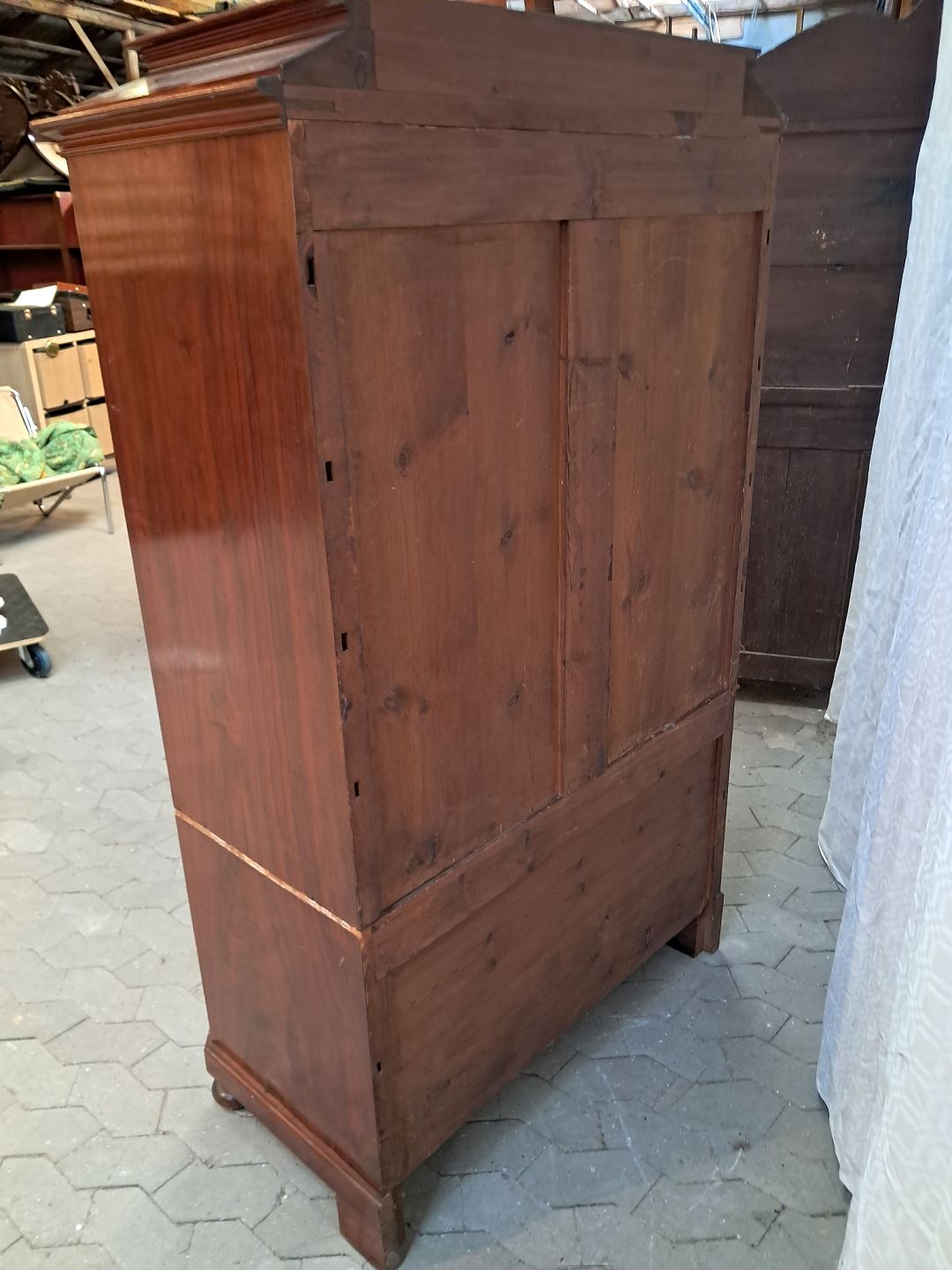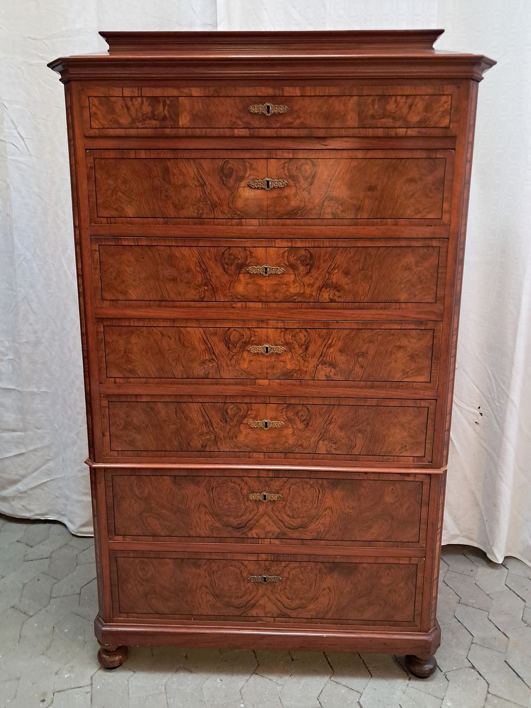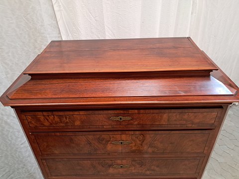 Stor kommode i finerret mahogni, fra 1900erne. Den har brugsspor og mangler en hjørne liste. Højde 165cm Bredde 102cm Dybde 50cm Emne nummer: 91941