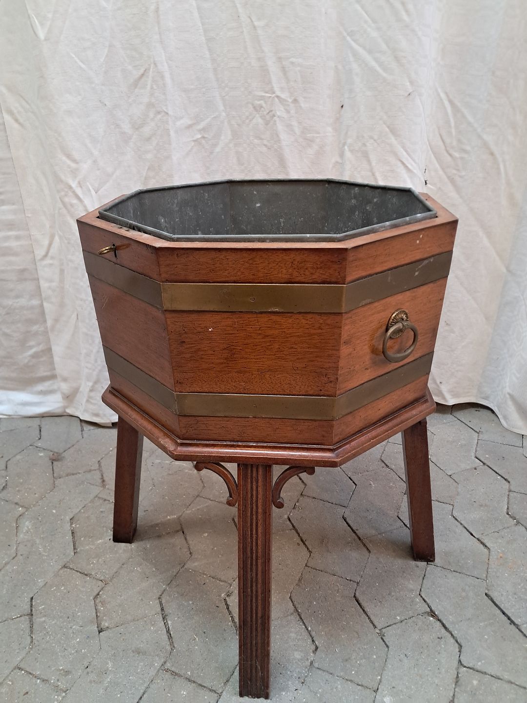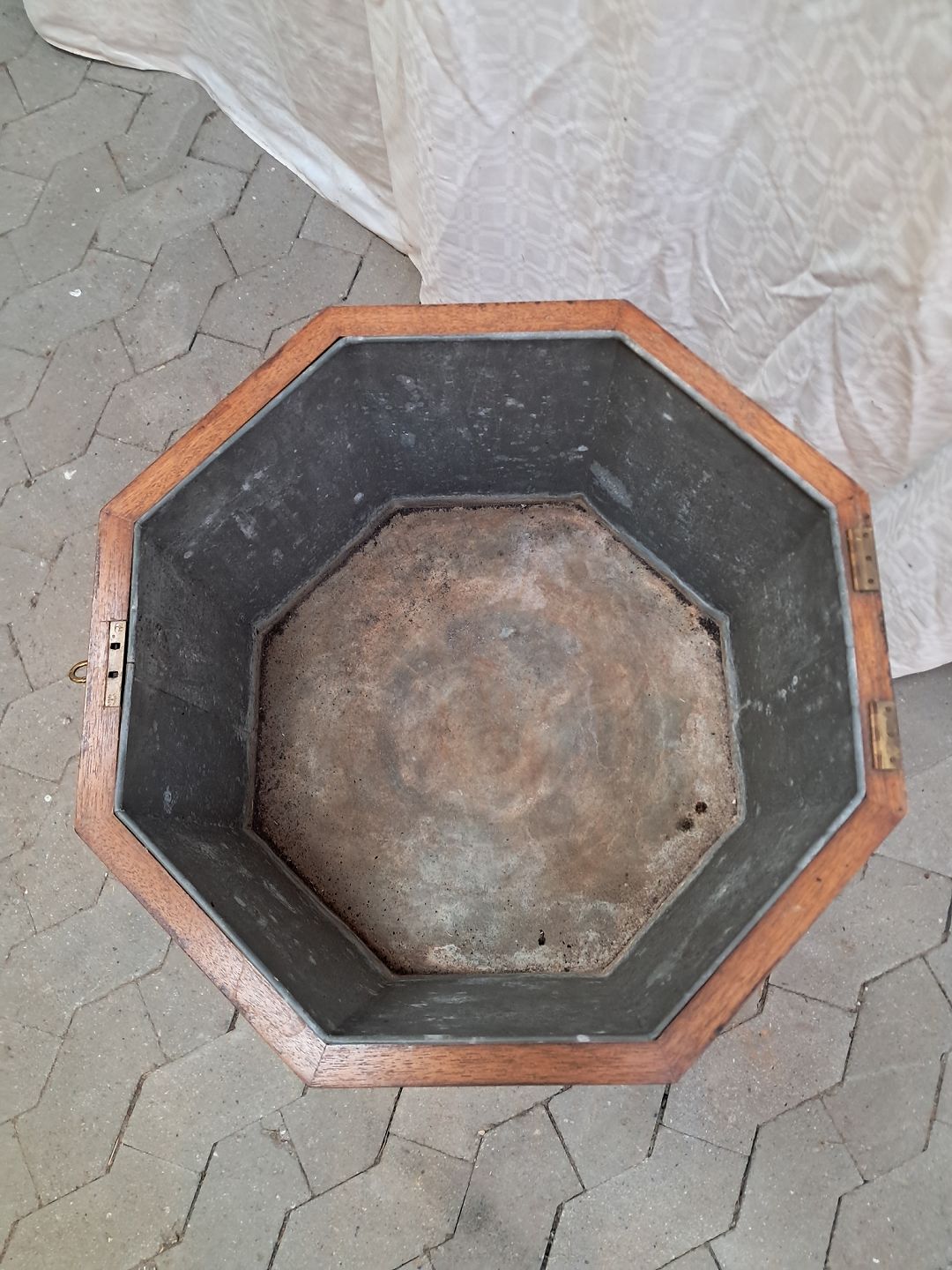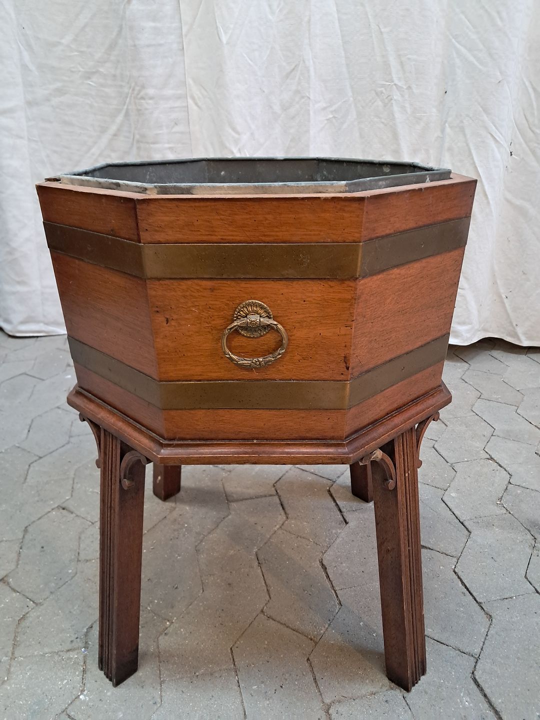 Plantekasse i mahogni med zinkspand, fra 1960erne. Den har brugsspor. Højde 60cm Diameter 47cm Emne nummer: 91944