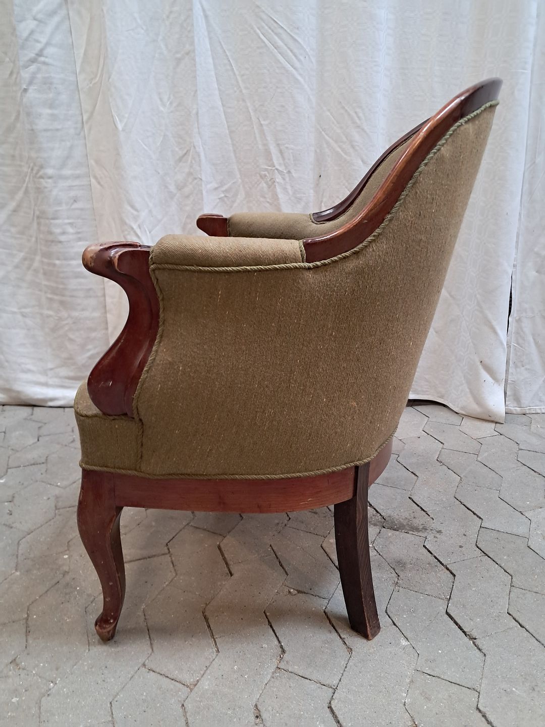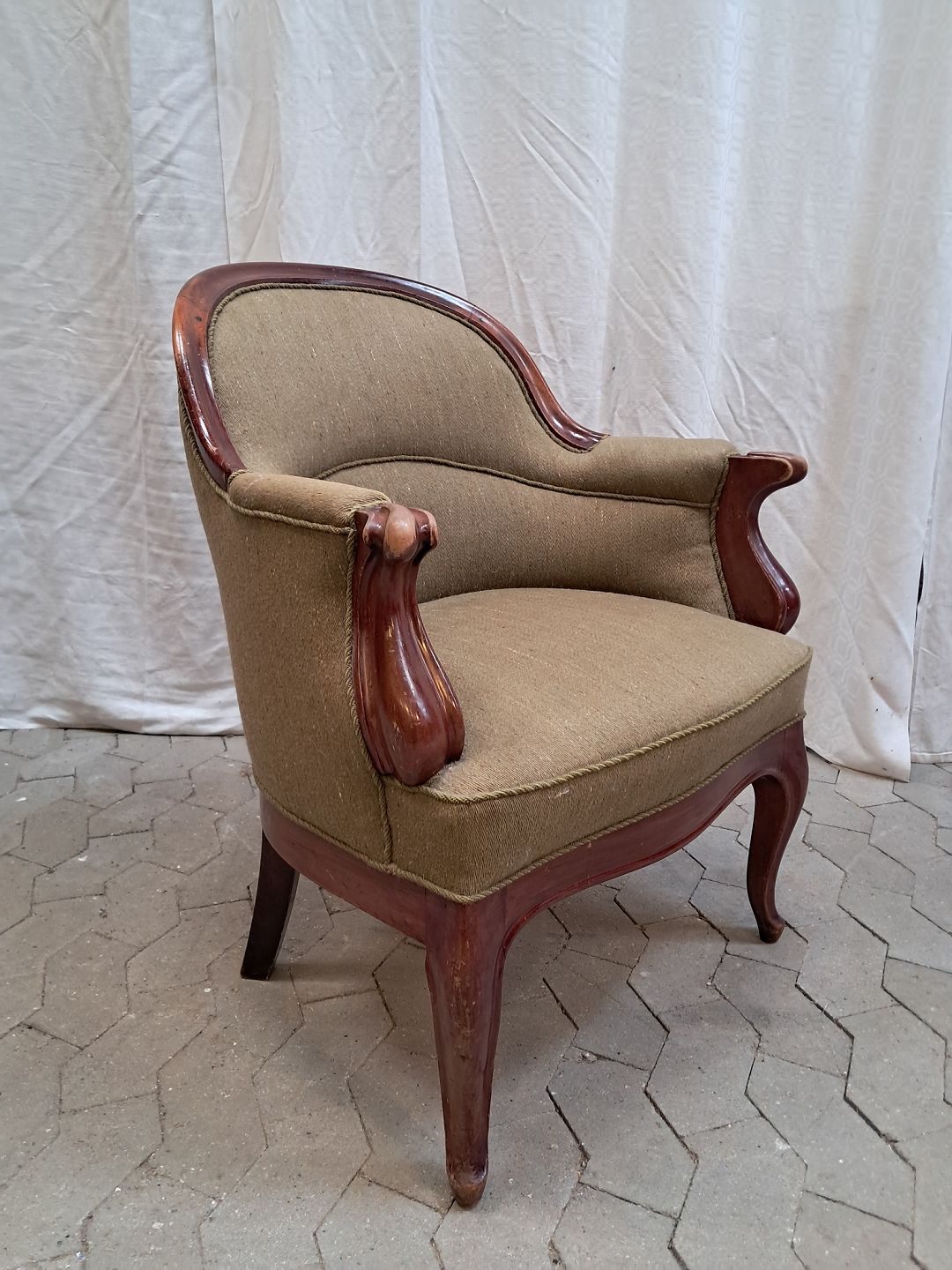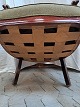 Lænestol i mahogni med uldbetræk, fra 1910erne. Den har brugsspor. Ryghøjde 86cm Sædehøjde 43cm Emne nummer: 91948