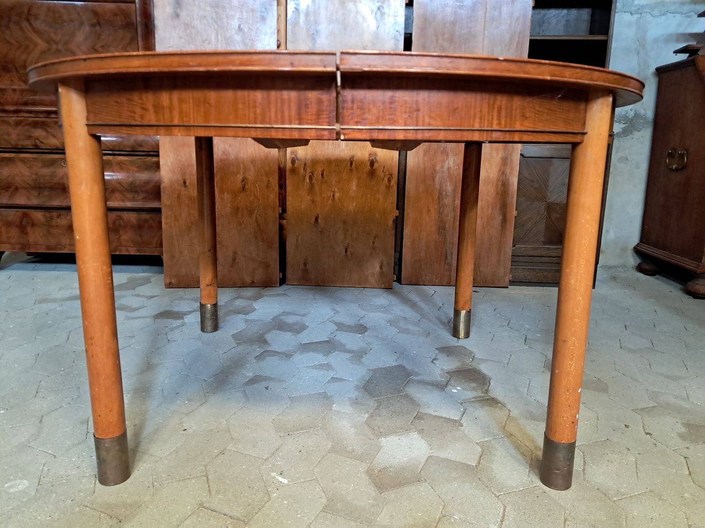 Spisebord i fineret mahogni med 3 tillægsplader, fra 1950erne. Det har brugsspor. Højde 76cm Diameter 130cm Længde med tillægsplader 280cm Emne nummer: 91955