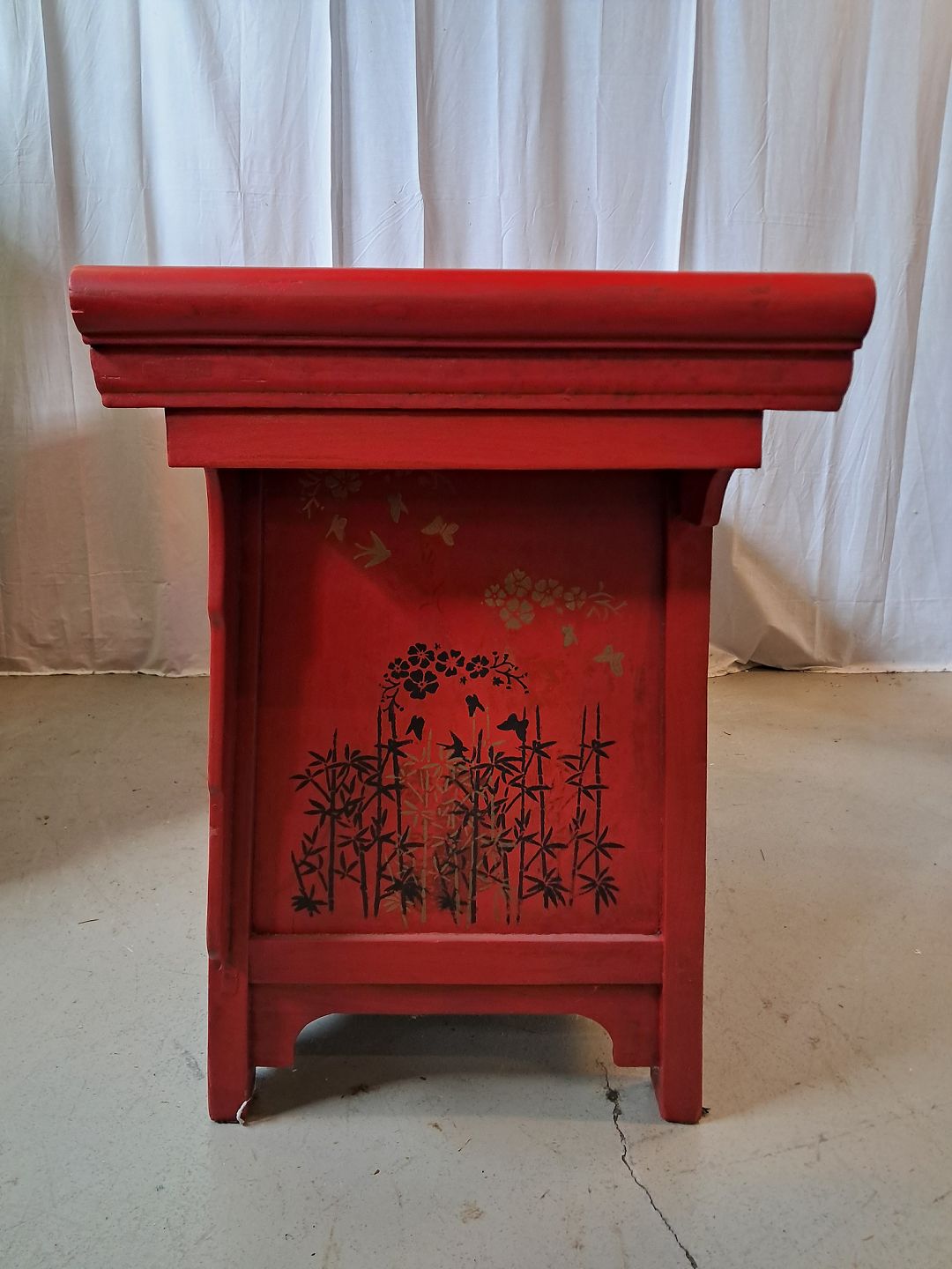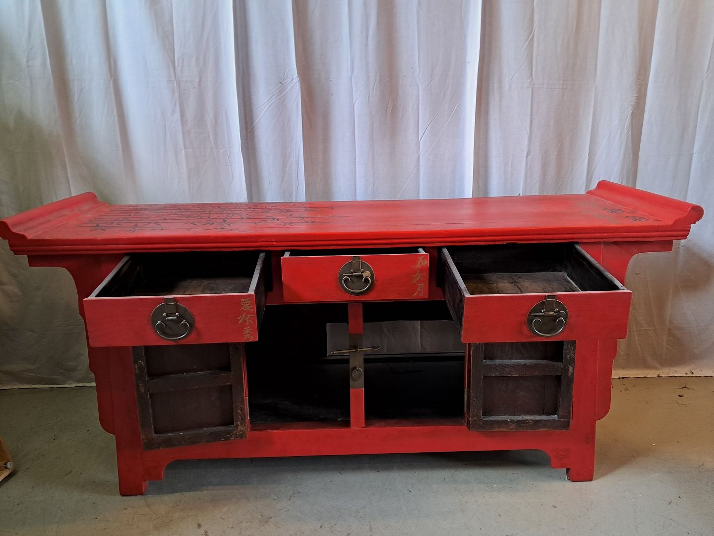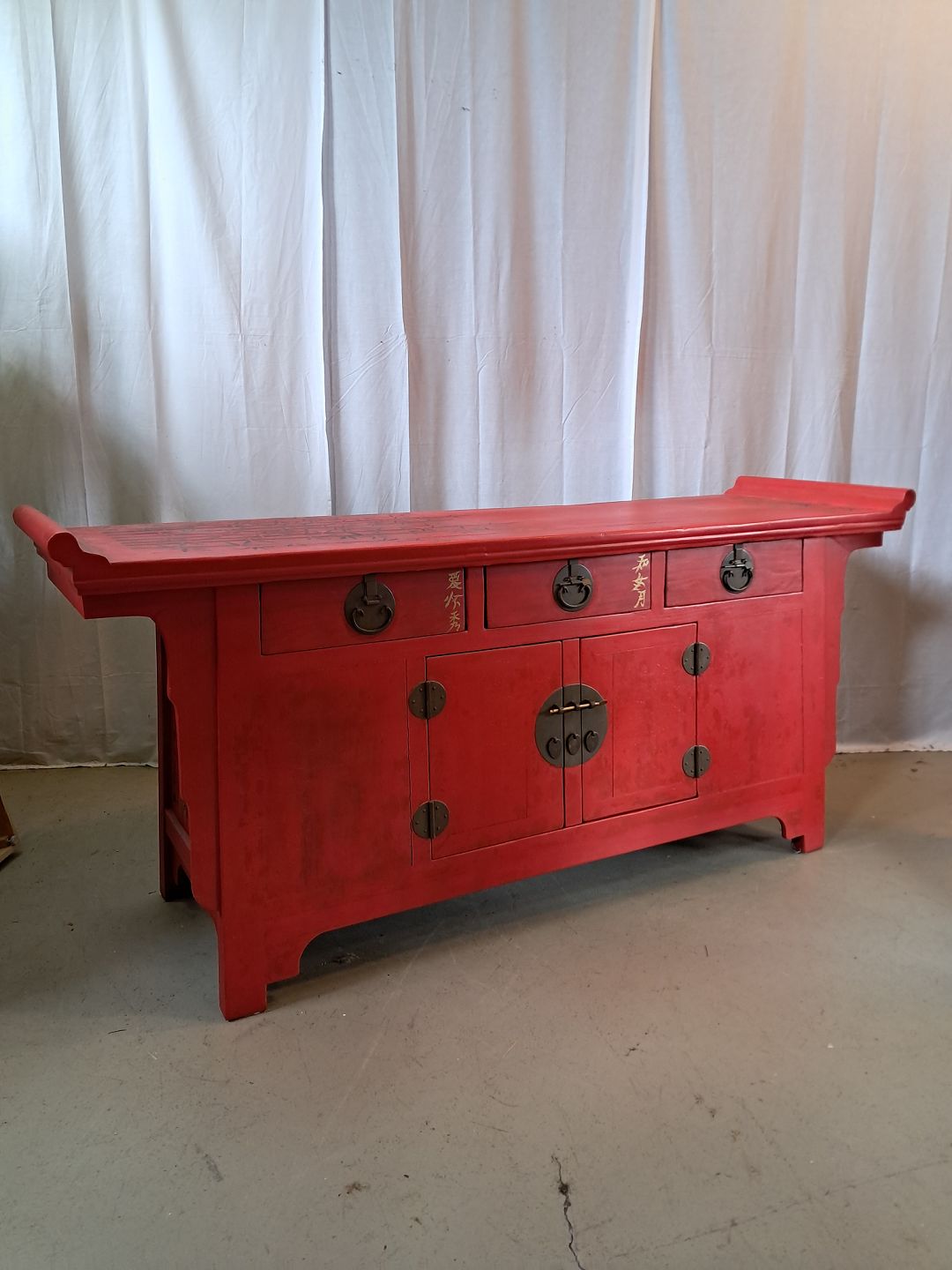 Malet asiatisk skænk, fra 1990erne. Den har brugsspor. Højde 81cm Bredde 189cm Dybde 55cm Emne nummer: 77215