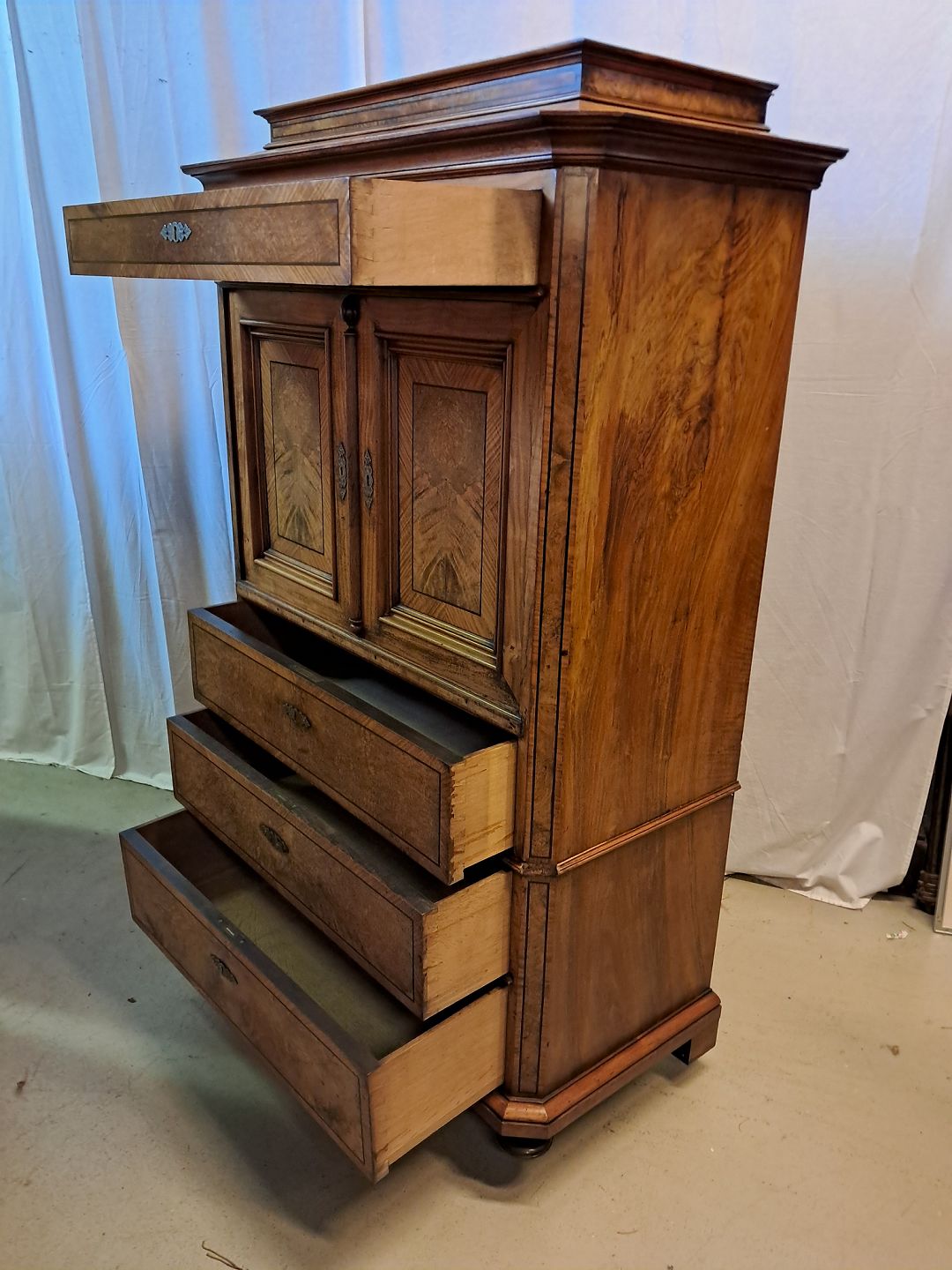 Sølvtøjsskab i fineret nødetræ og mahogni, fra 1900erne. Det har brugsspor. Højde 165cm Bredde 104cm Dybde 52cm Emne nummer: 77216