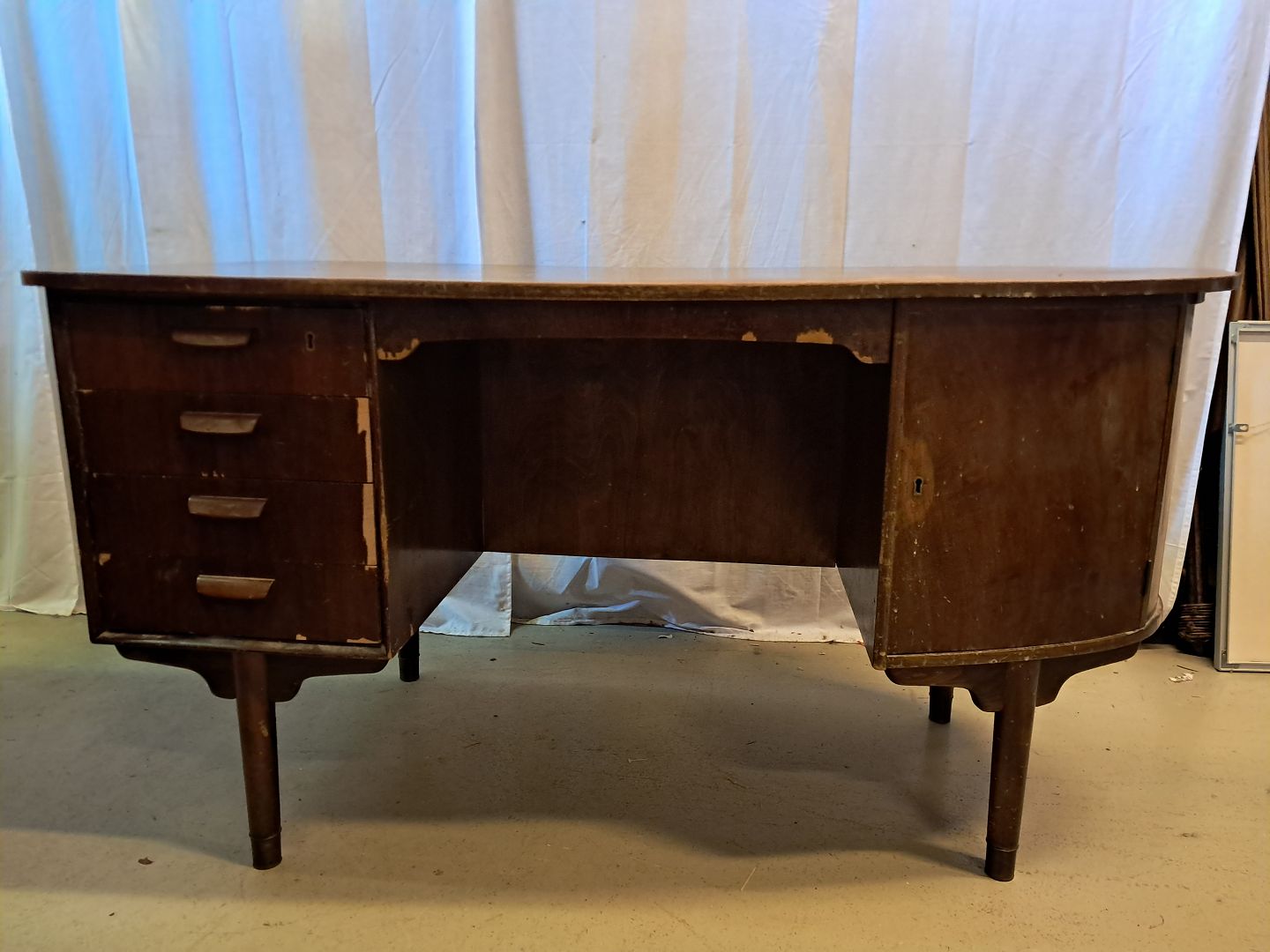 Skrivebord i fineret nødetræ, fra 1960erne. Den har brugsspor. Højde 72cm Bredde 140cm Dybde 66cm Højde fra gulv til underkant 66cm Emne nummer: 77219