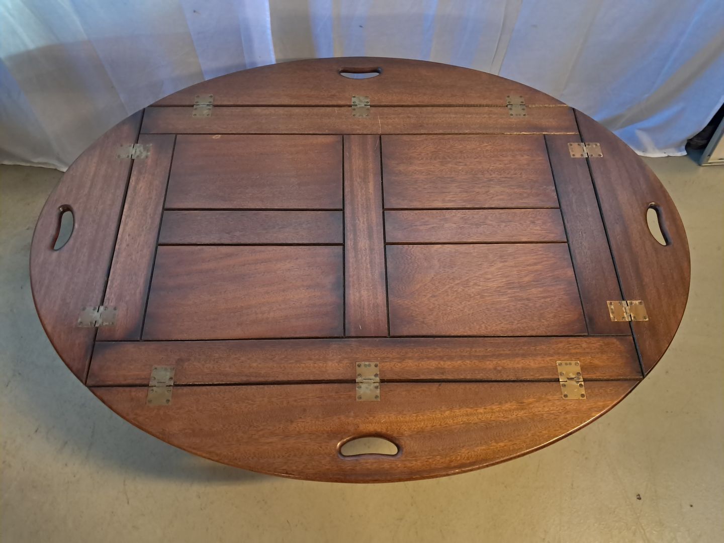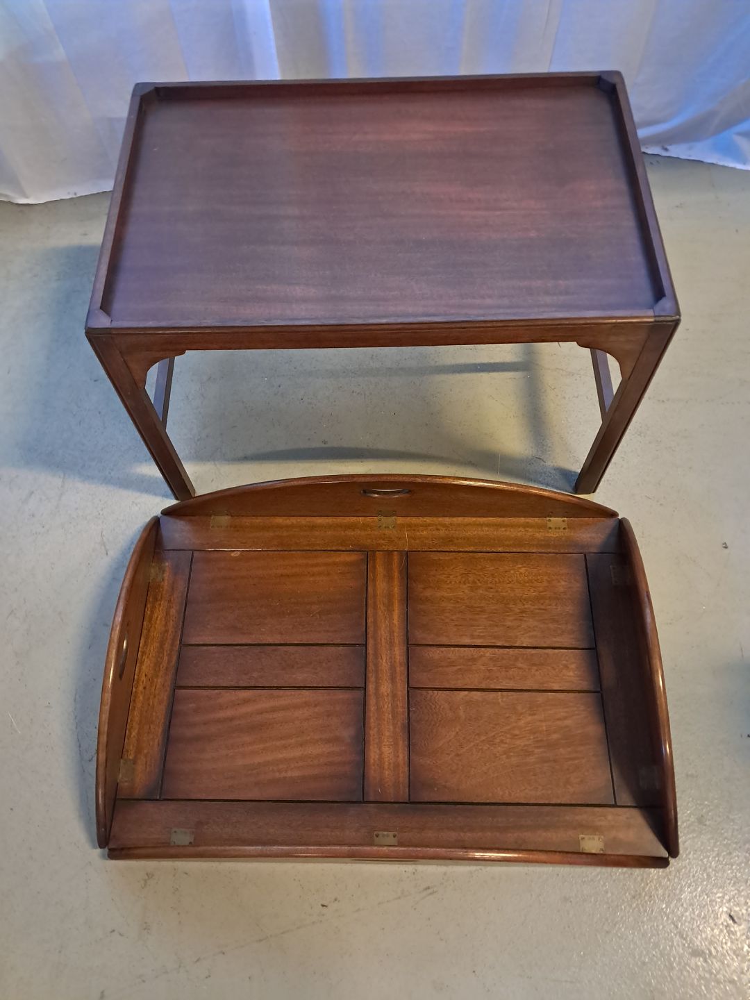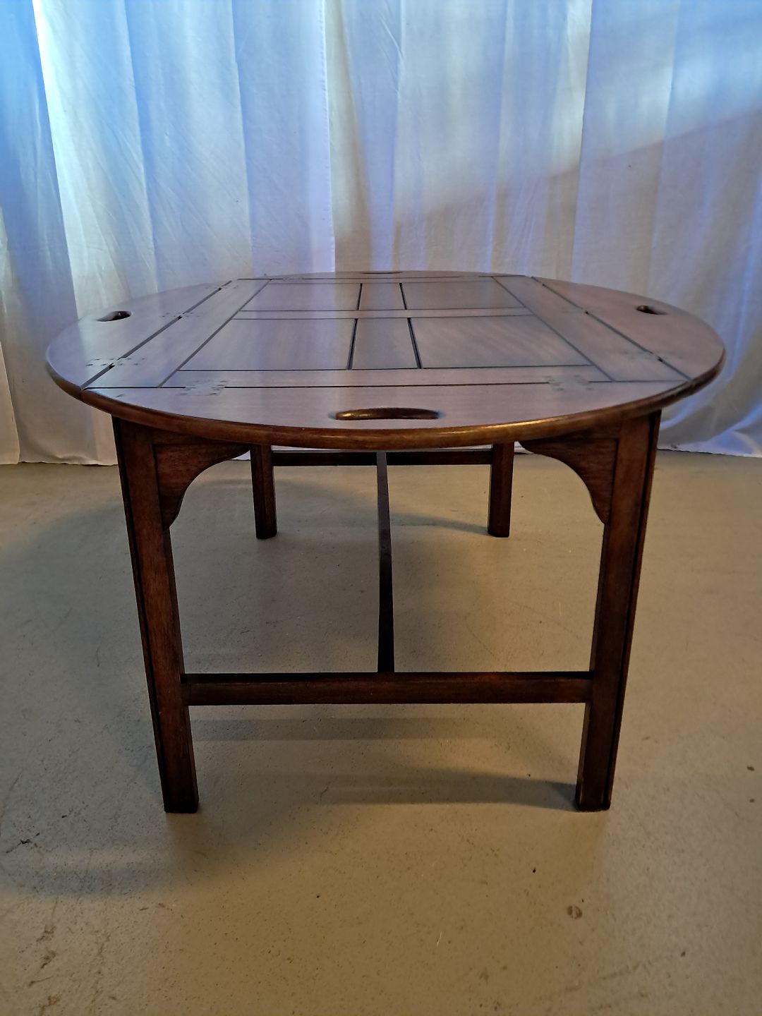 Sofabord i massivt og fineret mahogni, fra 1980erne. Det har små brugsspor. Højde 55cm Bredde 90cm Længde 120cm Emne nummer: 77230