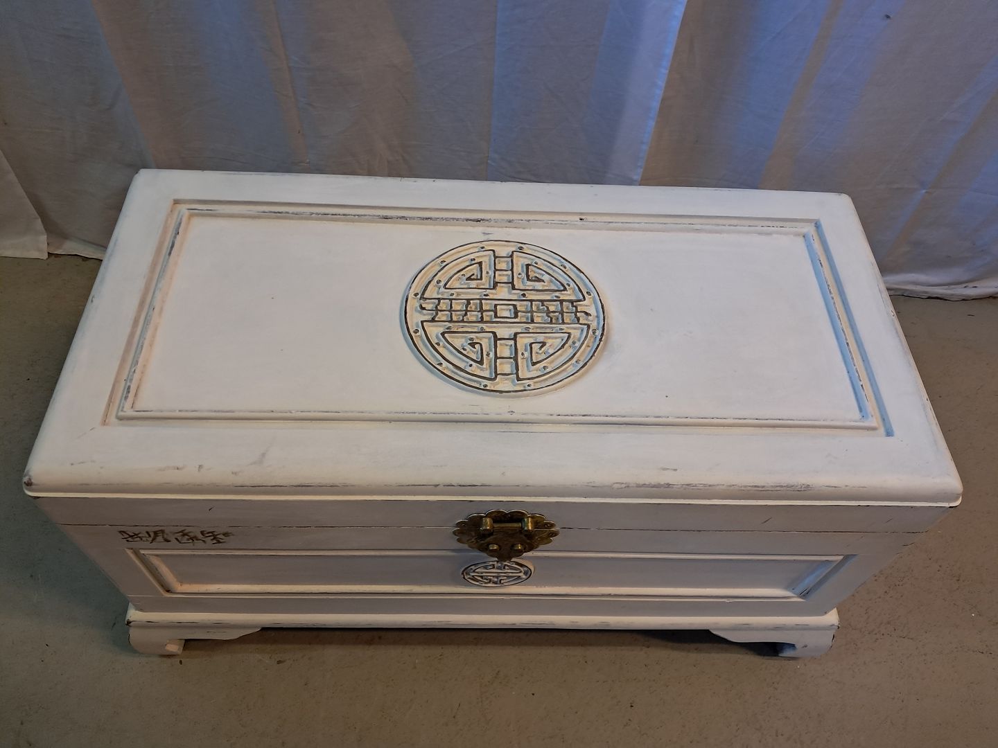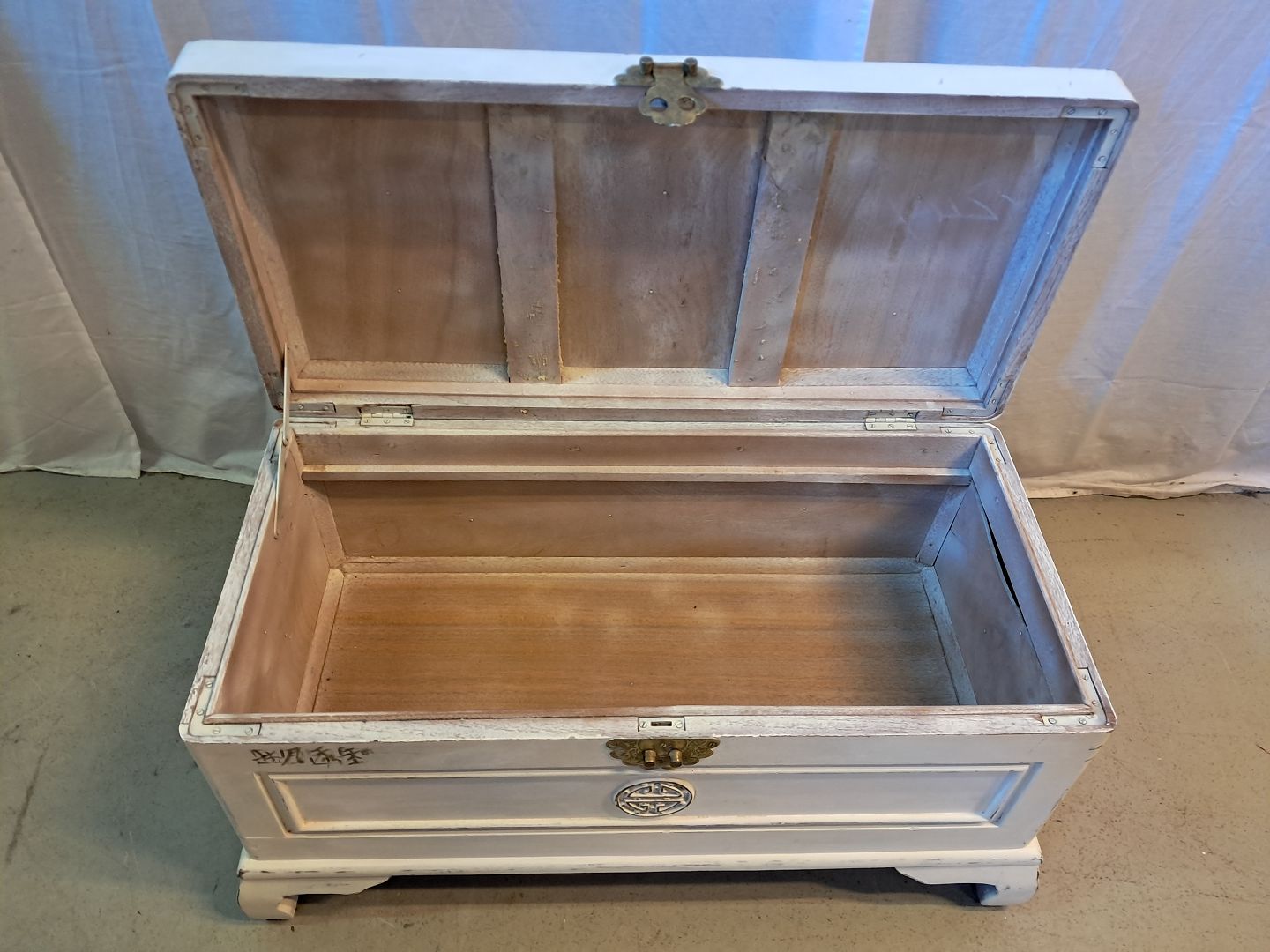 Malet kiste i kamfertræ, fra 1970erne. Den har brugsspor. Højde 41cm Bredde 75cm Dybde 38cm Emne nummer: 77249