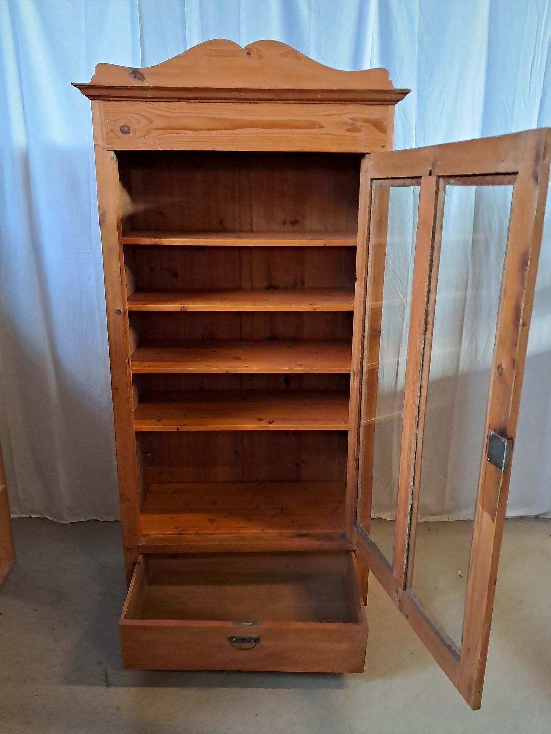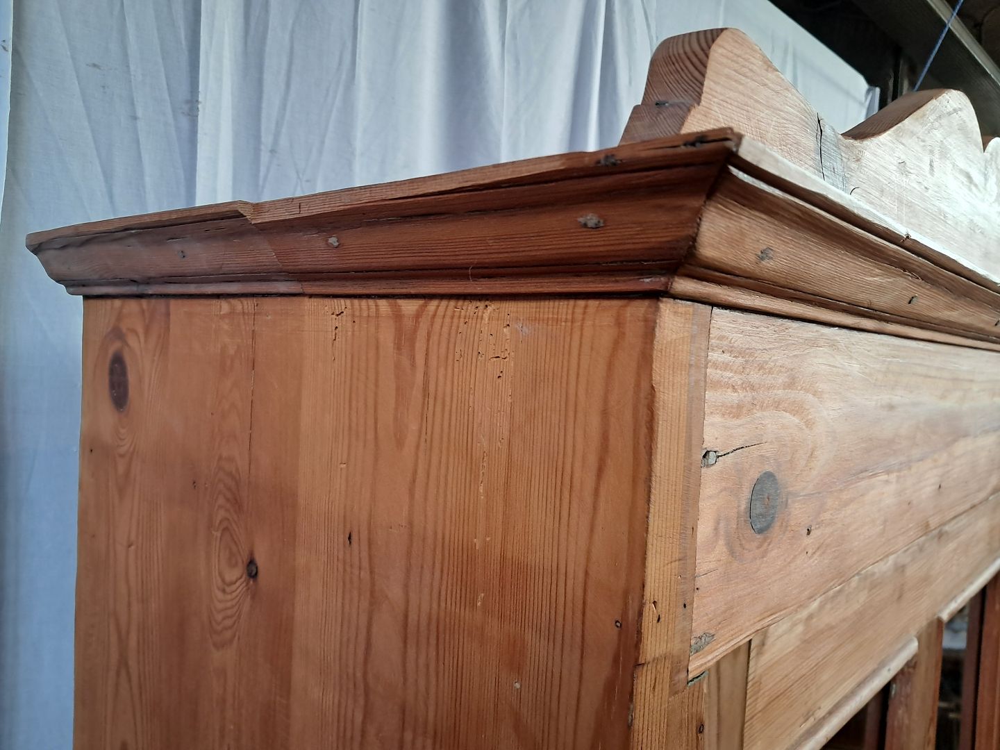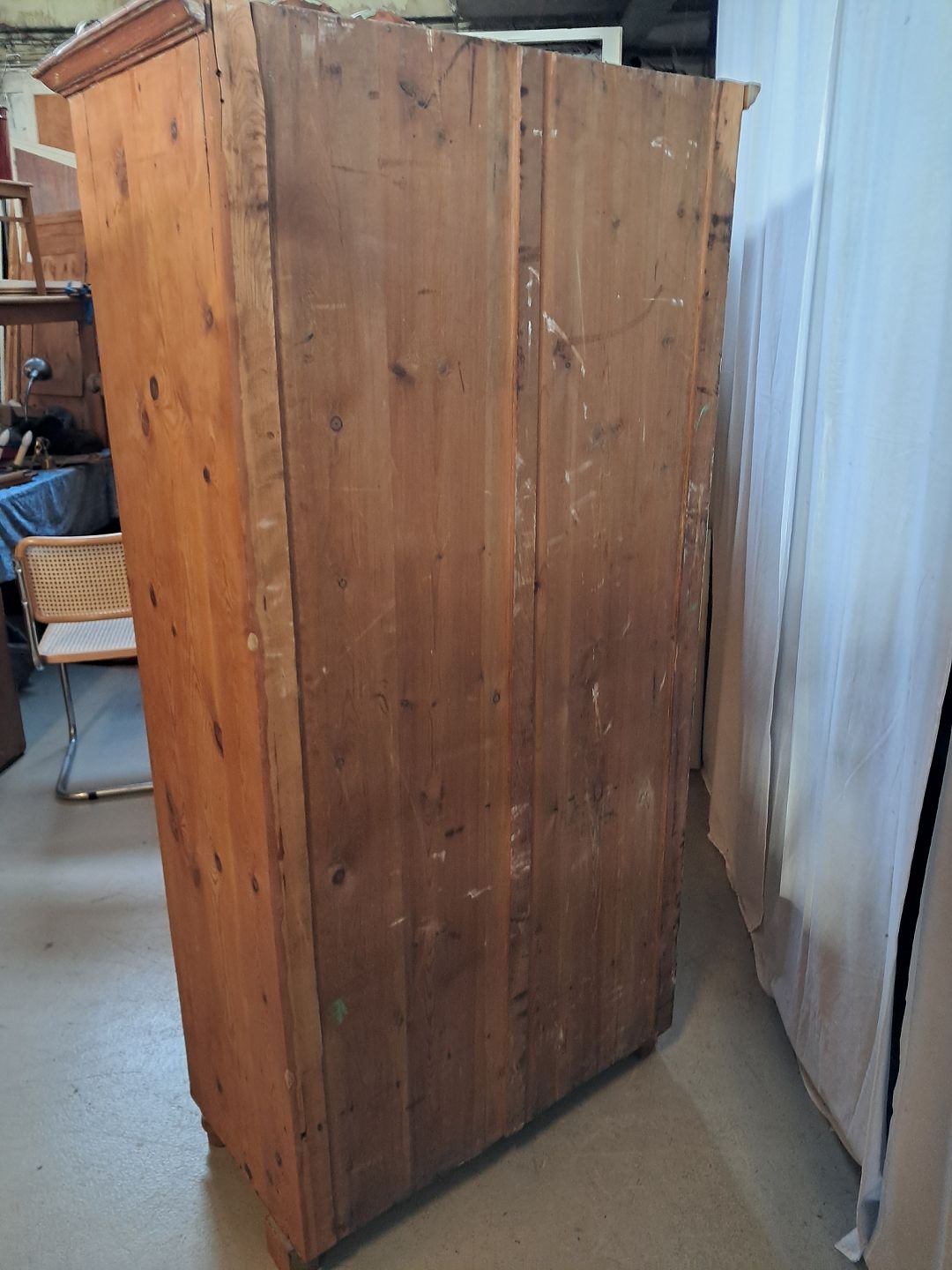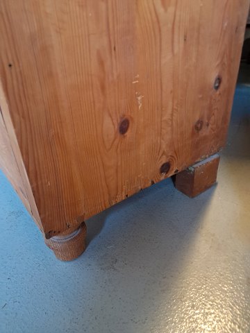 Skab i massivt fyrretræ, fra 1910erne. Det har brugsspor og defekte/mangler lister. Højde 185cm Bredde 90cm Dybde 46cm Emne nummer: 77252