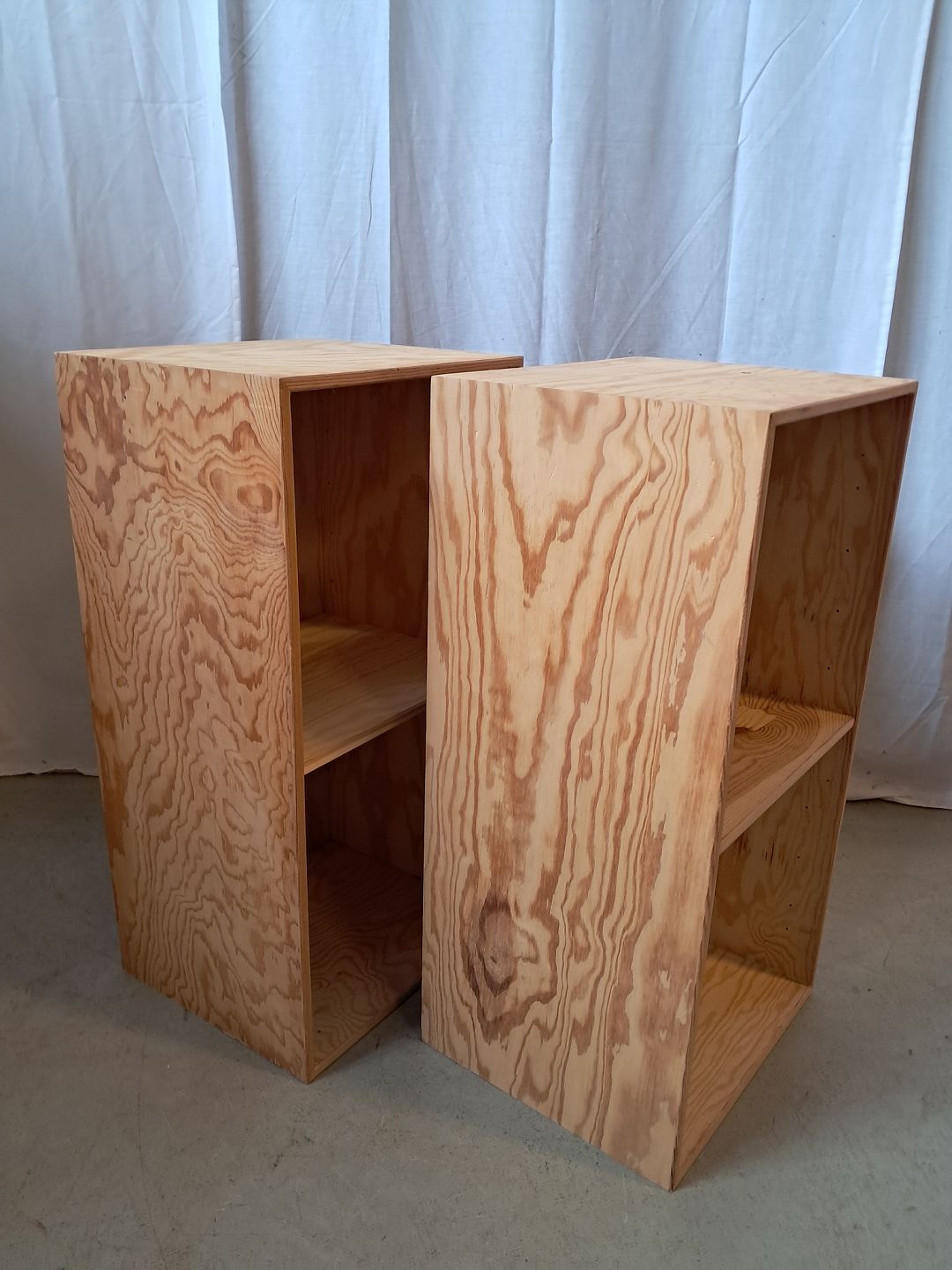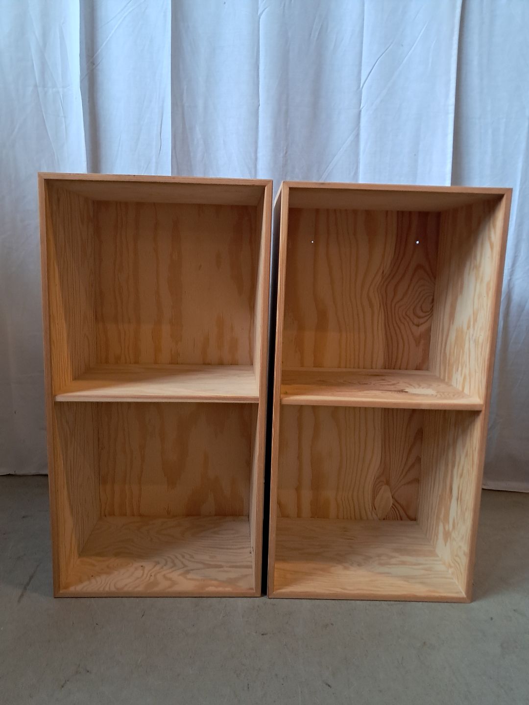2 Reolkasser i krydsfiner, fra 2000erne. De har brugsspor og der medfølger ikke ophæng. Højde 70cm Bredde 35,5cm Dybde 30cm Emne nummer: 77259