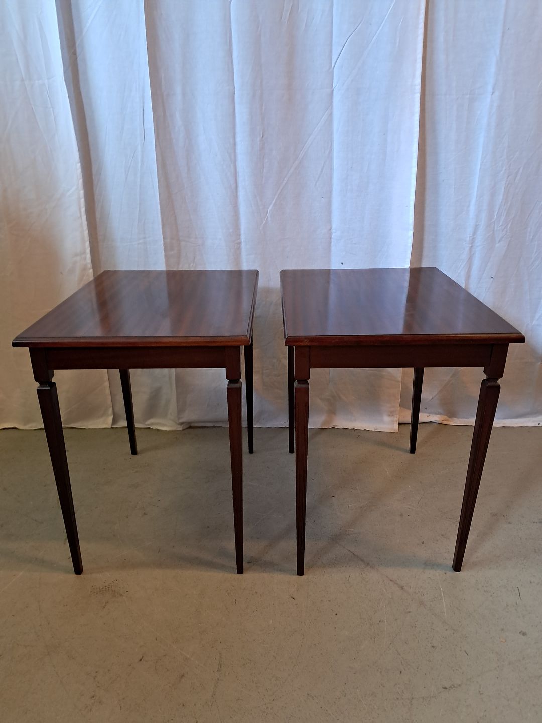 2 Sideborde i fineret mahogni, fra 1980erne. De har brugsspor. Højde 53cm Bredde 40cm Længde 54cm Emne nummer: 77277