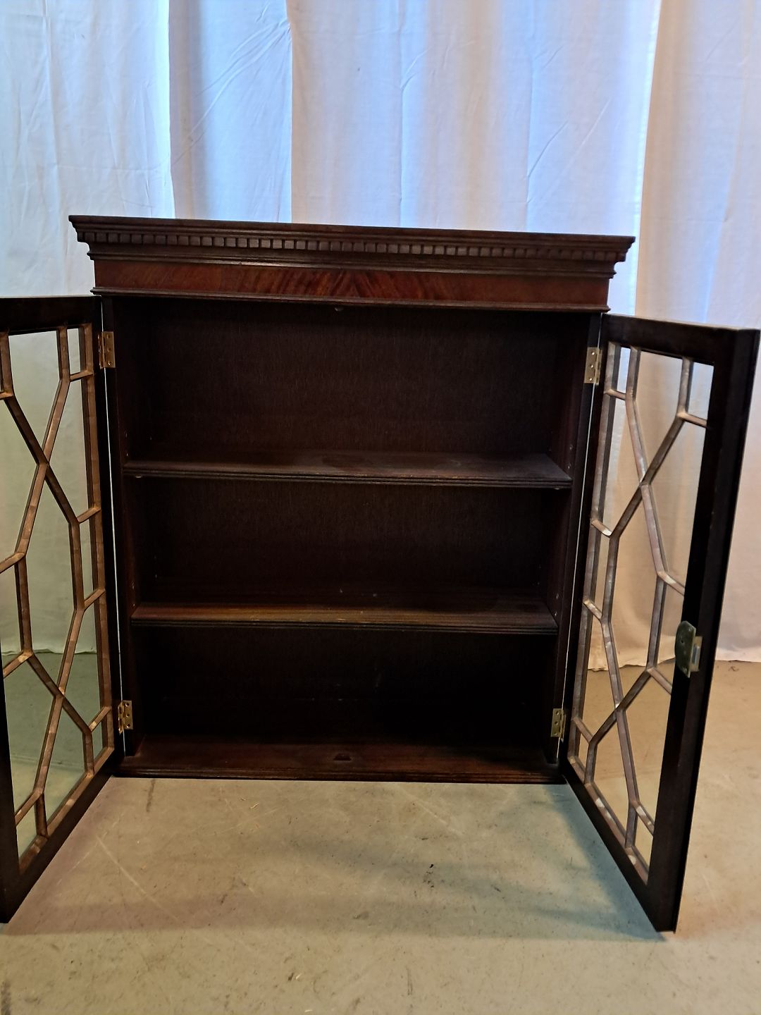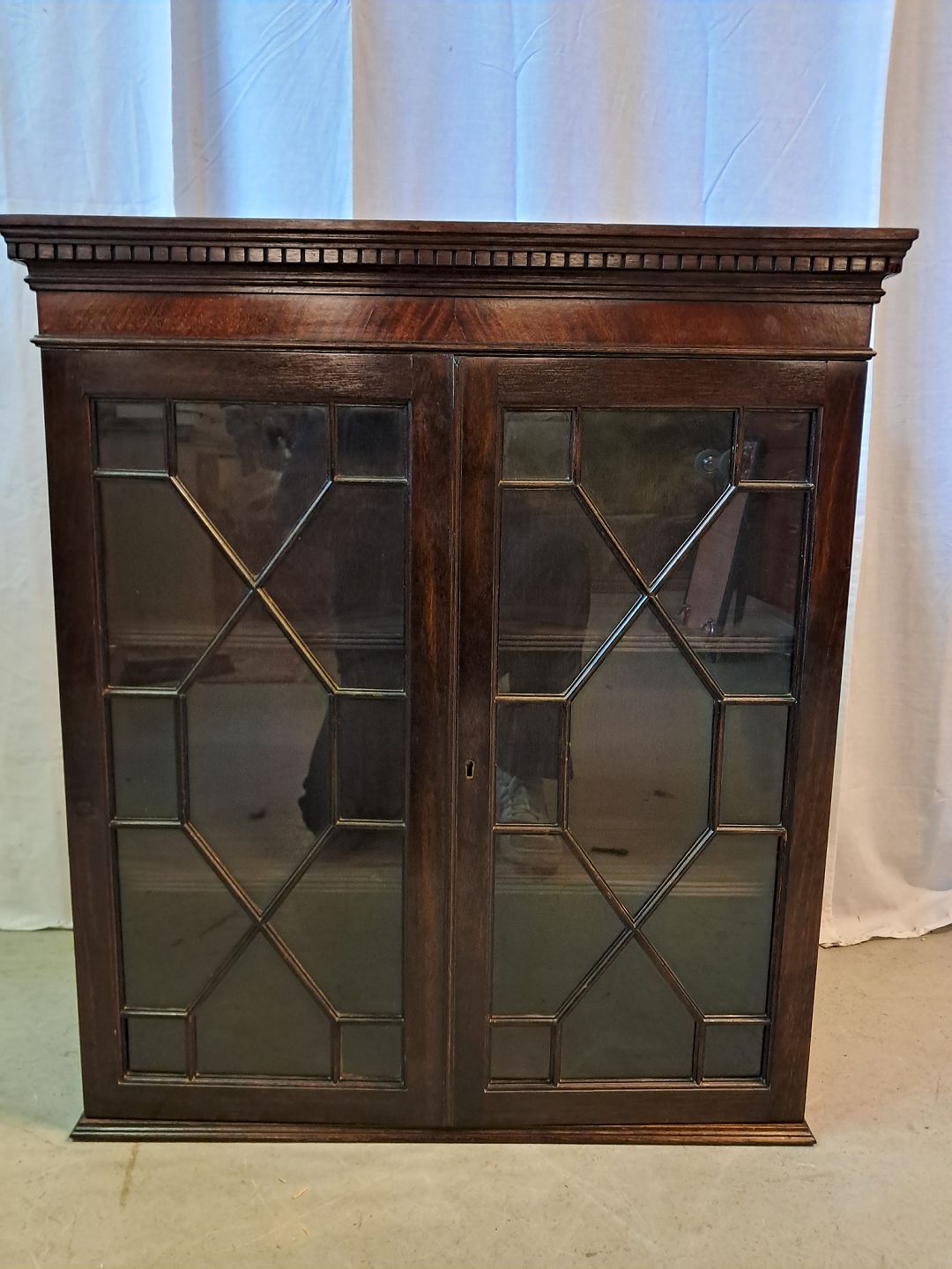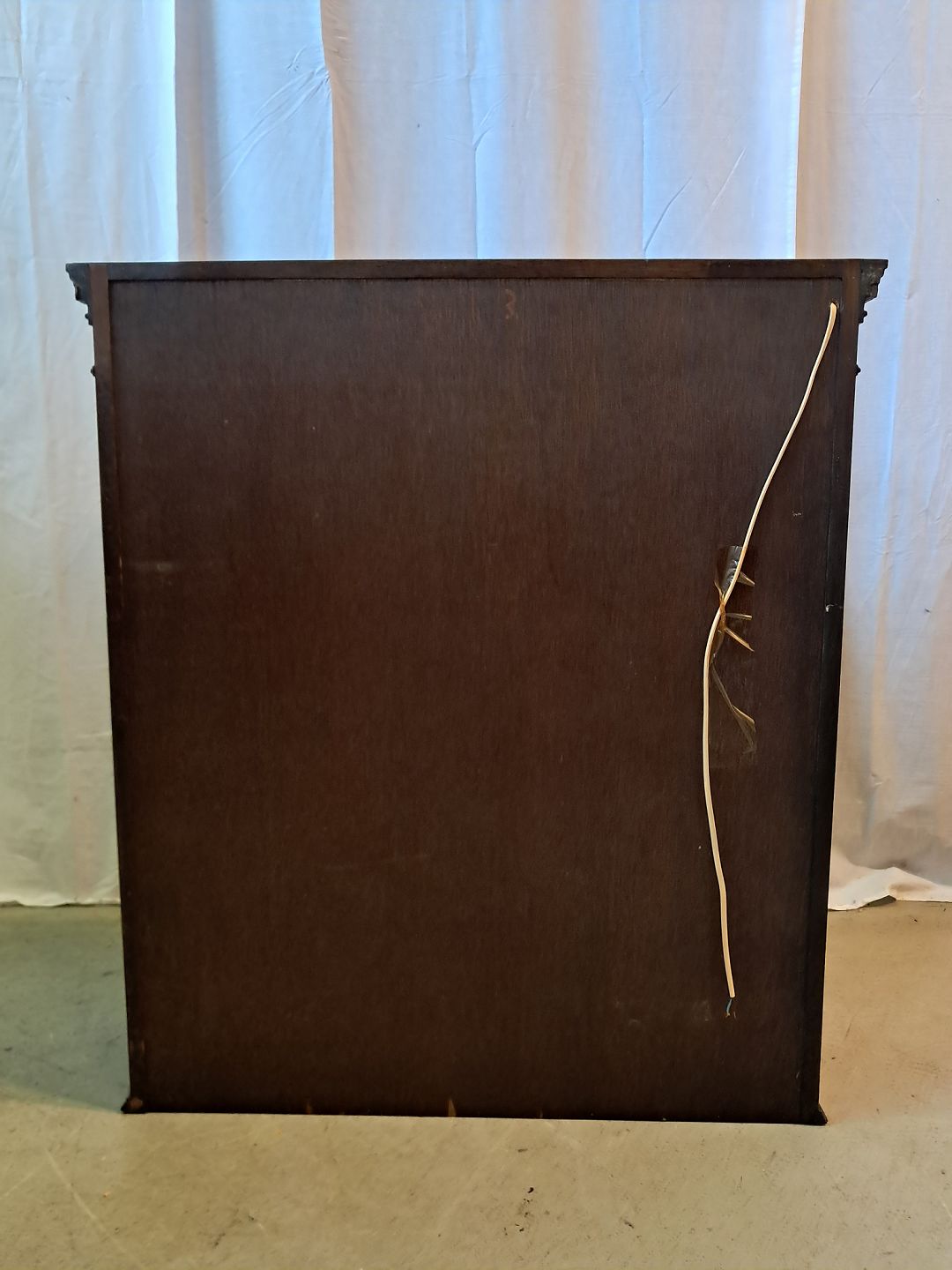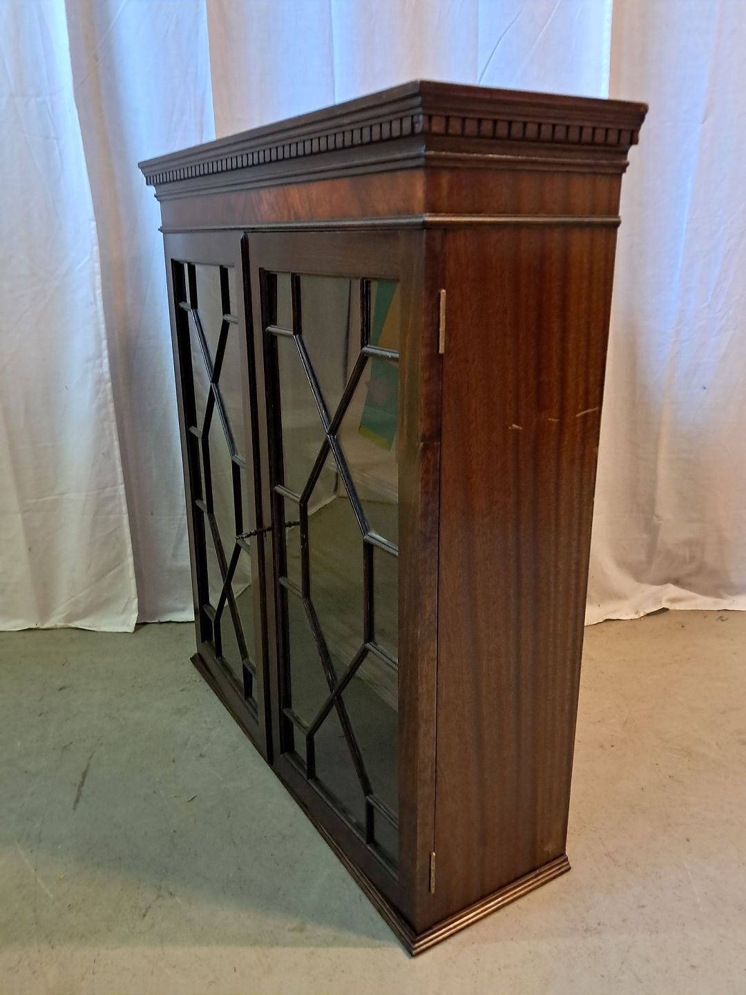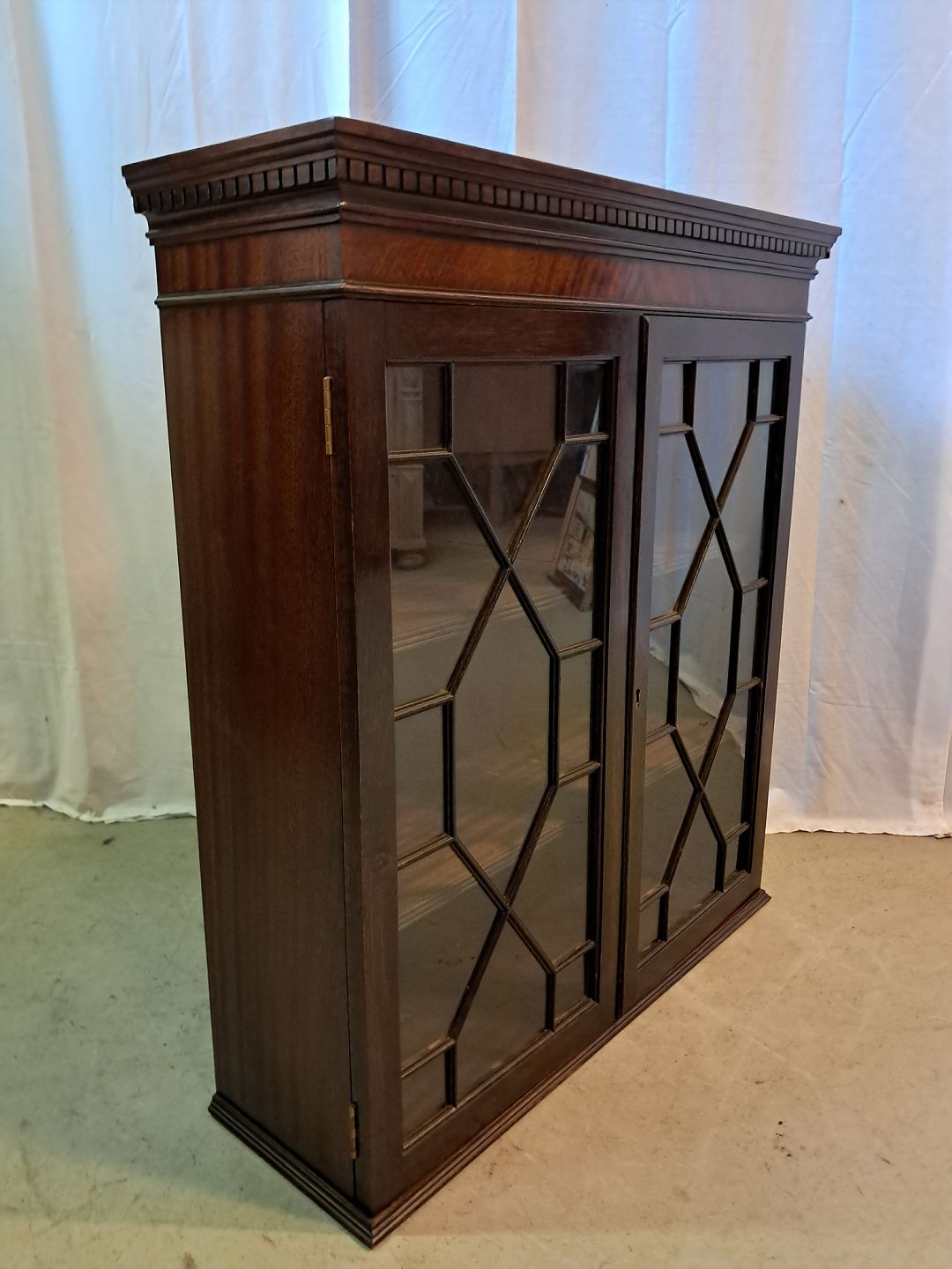 Vitrineskab i fineret mahogni, fra 1980erne, Det har brugsspor og der medfølger ikke ophæng. Højde 86cm Bredde 76cm Dybde 25cm Emne nummer: 77290