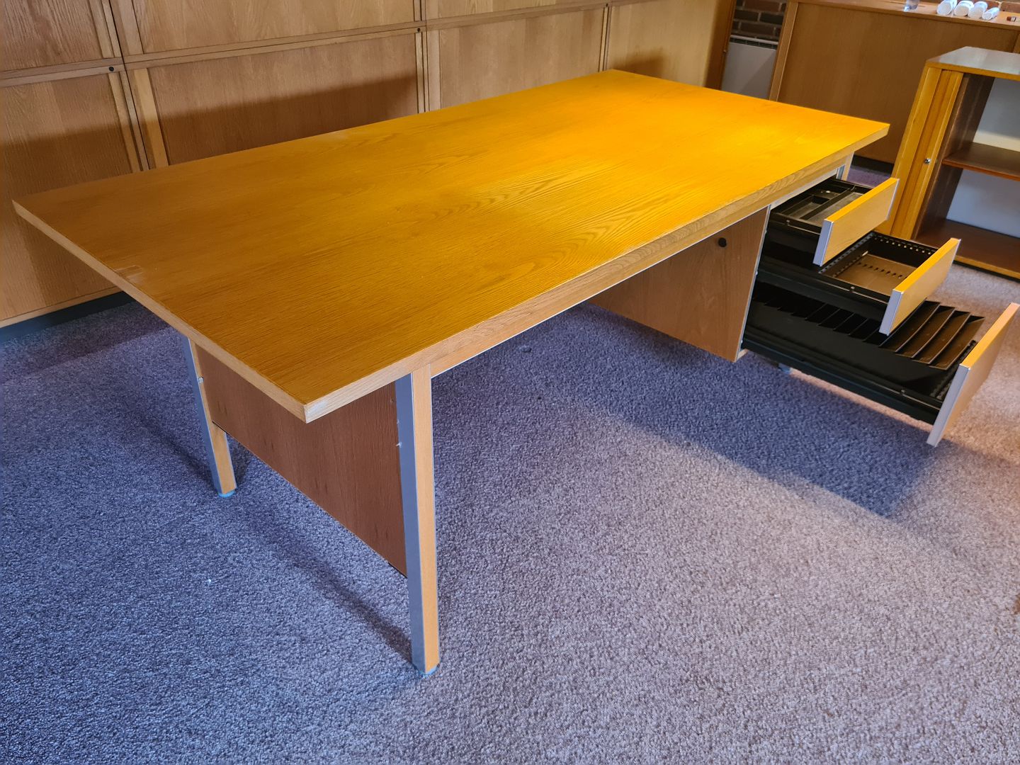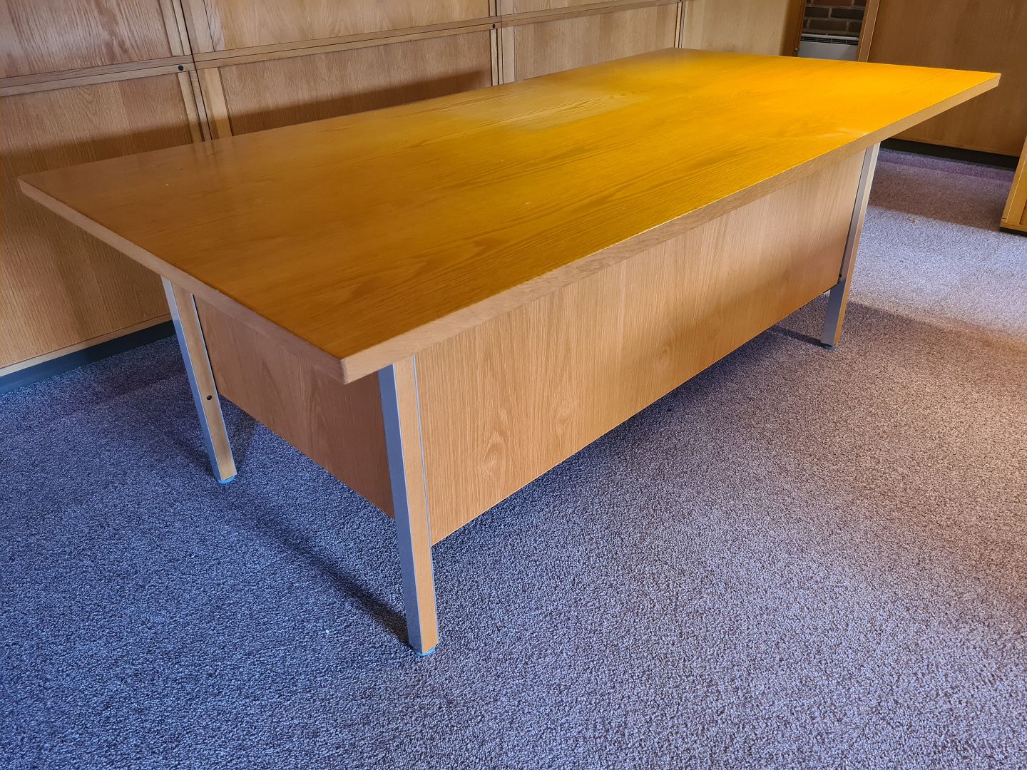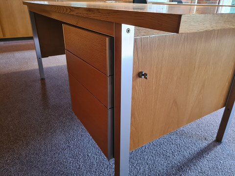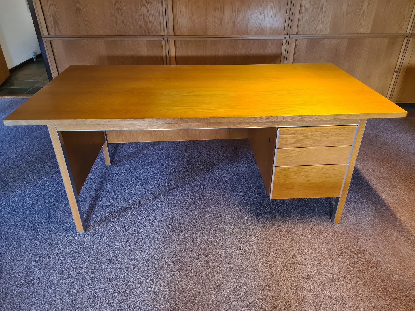 Stort Skrivebord fra 1980'erne i eg og aluminium. Fremstår pænt, velholdt og udmærket funktionsdygtigt. Dog med meget let afblegning på bordpladen efter en skrivemåtte. (Ses på billede) Højde 74 cm. Bredde 120 cm. Dybde 45 cm. Emne nummer: 60665