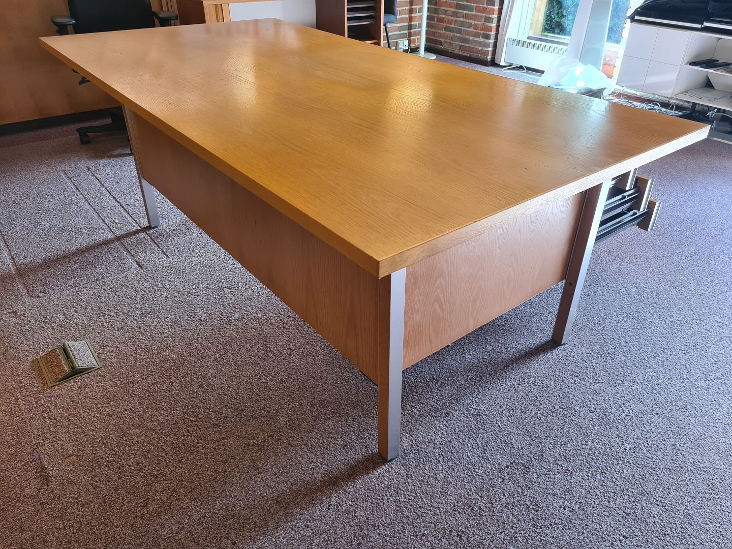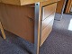 Stort Skrivebord fra 1980'erne i eg og aluminium. Fremstår pænt, velholdt og udmærket funktionsdygtigt. Dog med meget let afblegning på bordpladen efter en skrivemåtte. (Ses på billede) Højde 74 cm. Bredde 120 cm. Dybde 45 cm Emne nummer: 60666