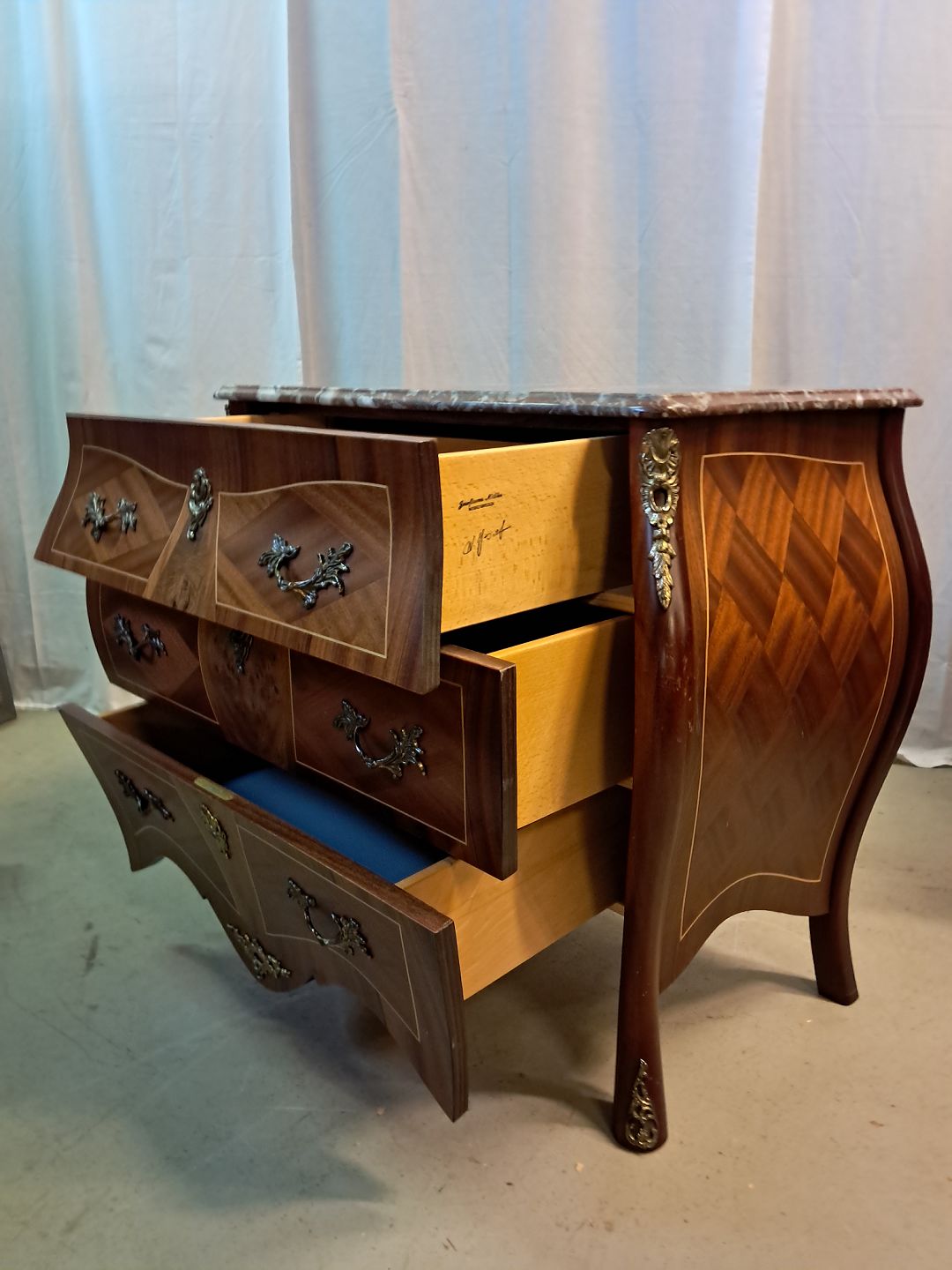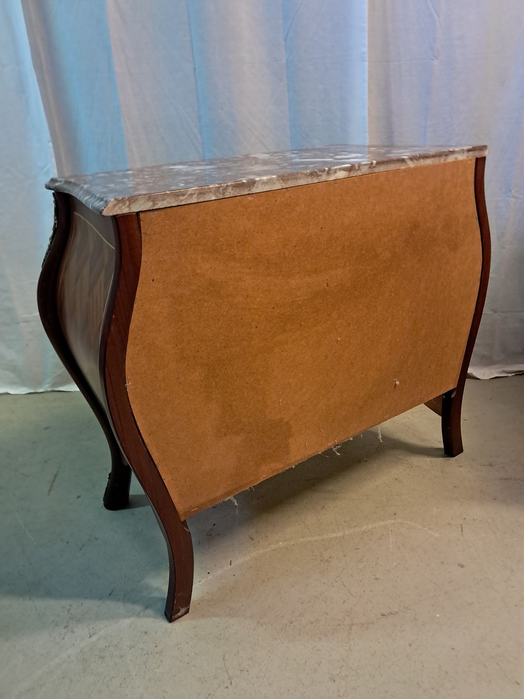 Kommode i fineret mahogni med marmorplade, fra 1980erne. Den har brugsspor. Højde 74cm Bredde 85cm Dybde 42cm Emne nummer: 77295